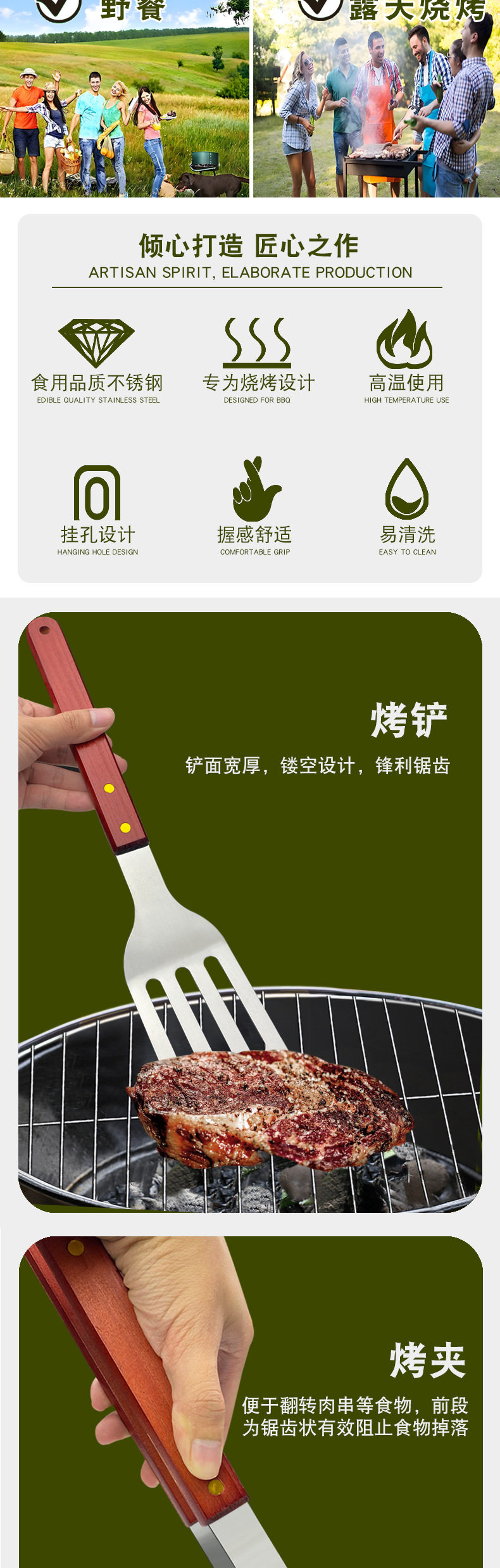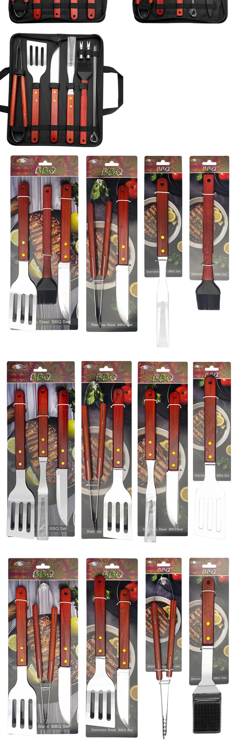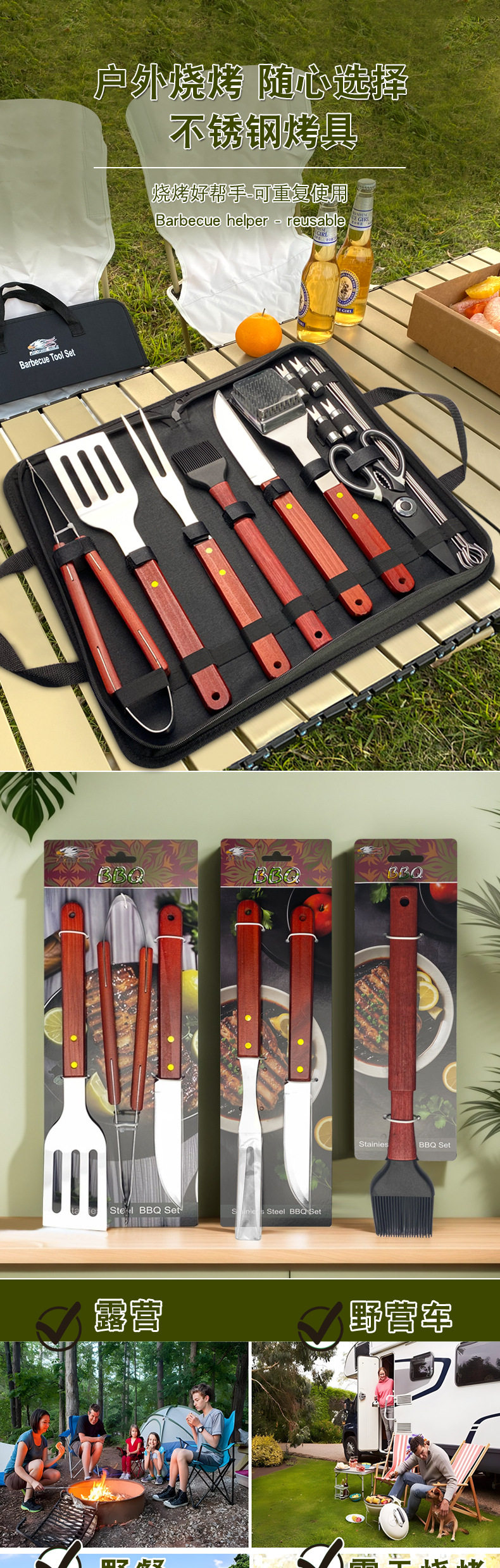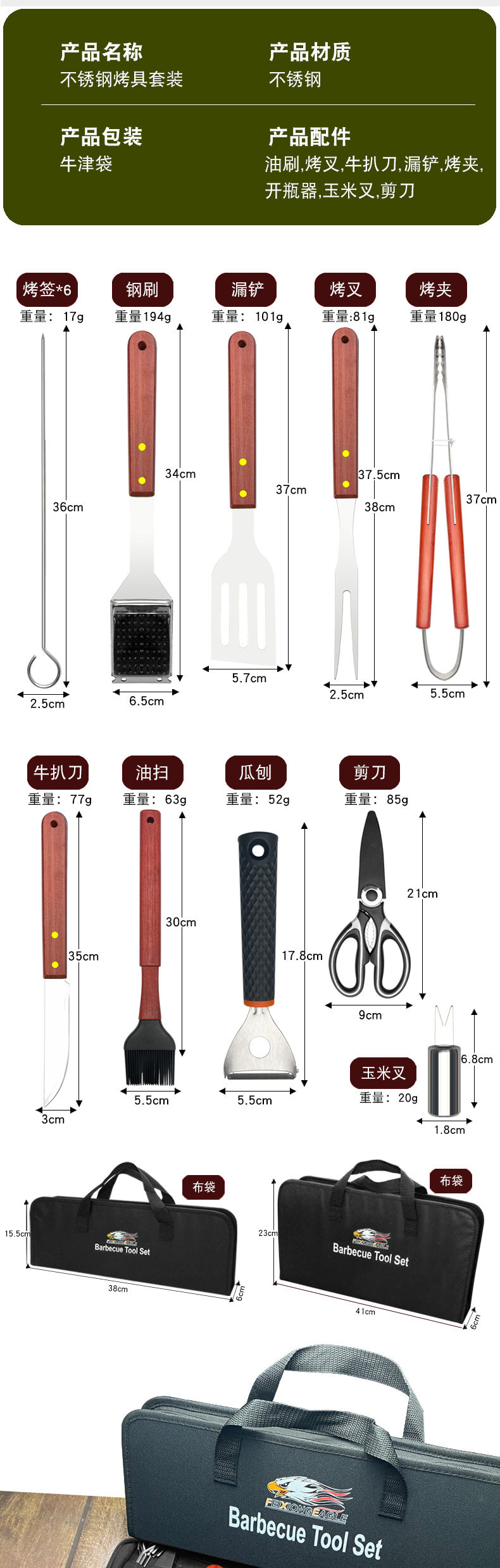 Outdoor camping barbecue tools combination stainless steel grill suit wooden handle fork shovel clip BBQ accessories cloth bag