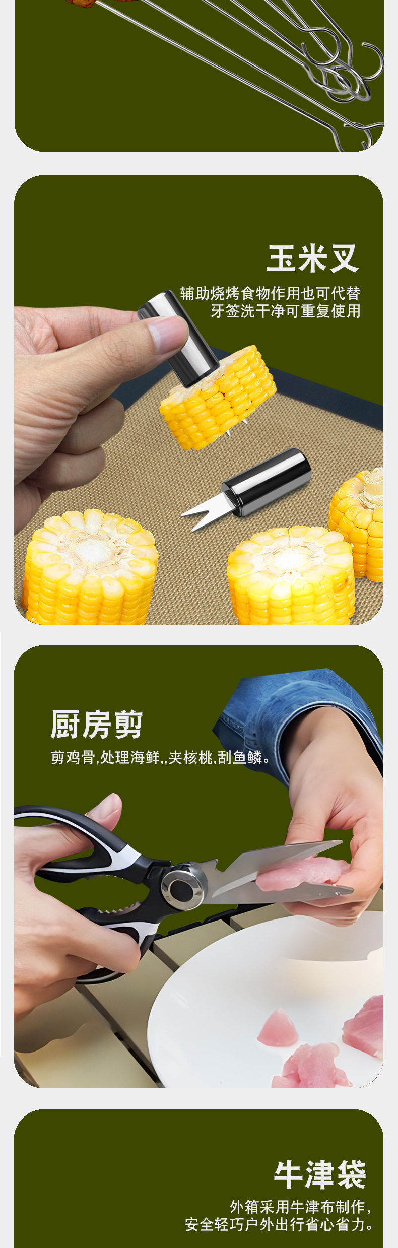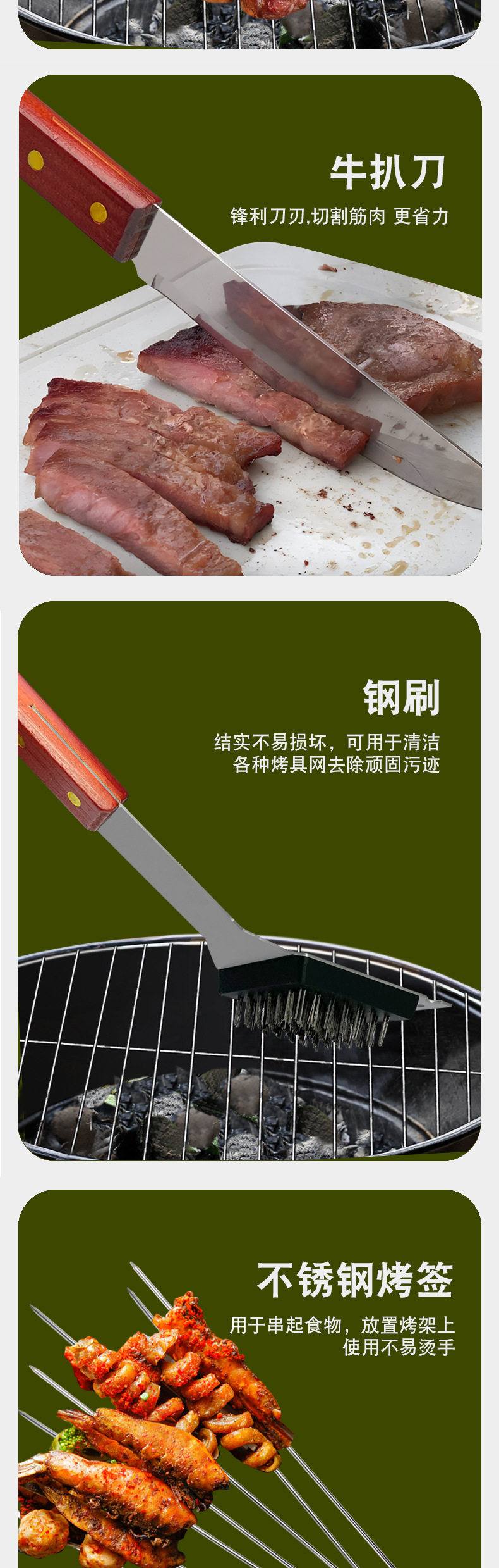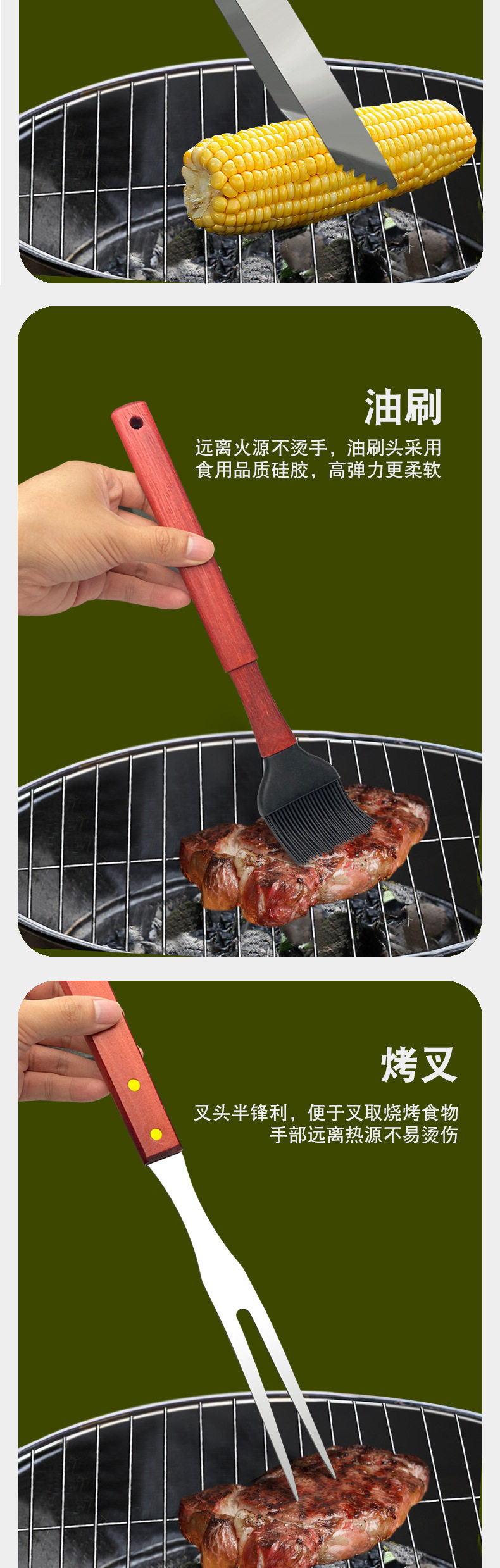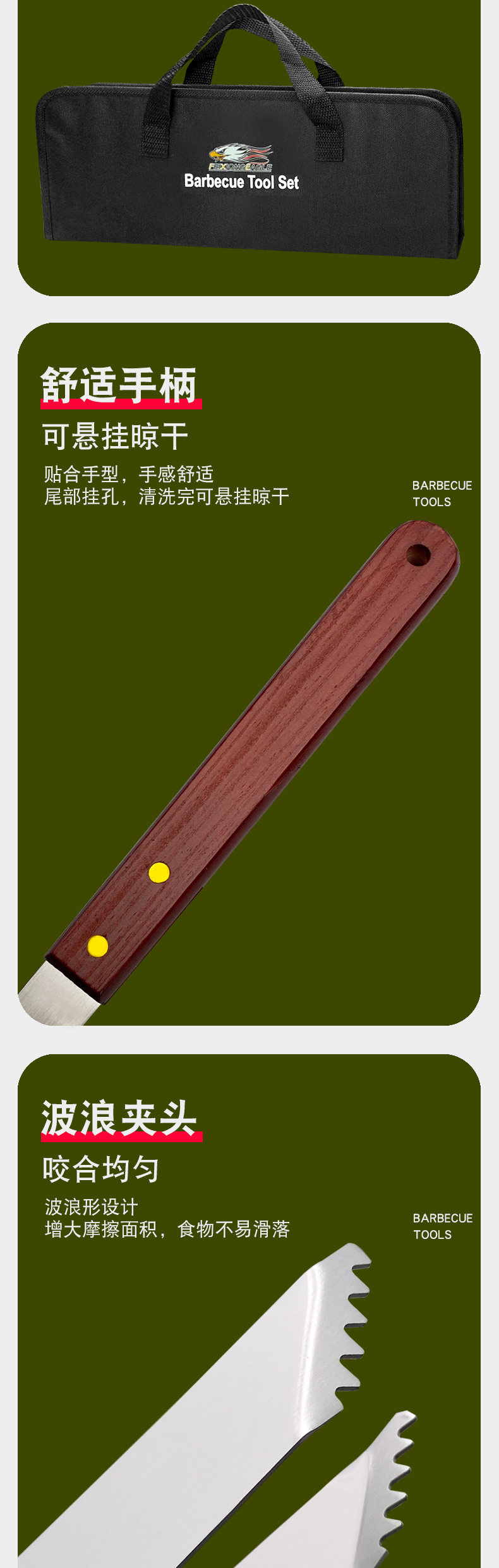 Outdoor camping barbecue tools combination stainless steel grill suit wooden handle fork shovel clip BBQ accessories cloth bag