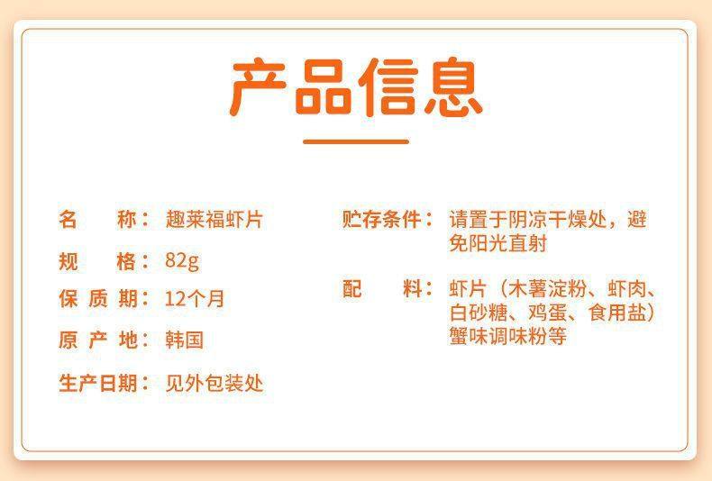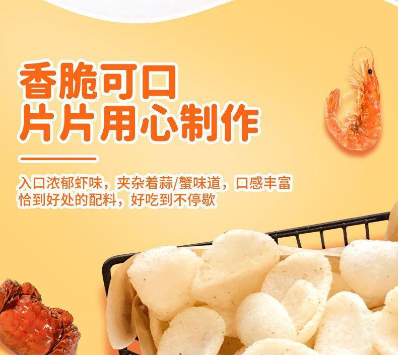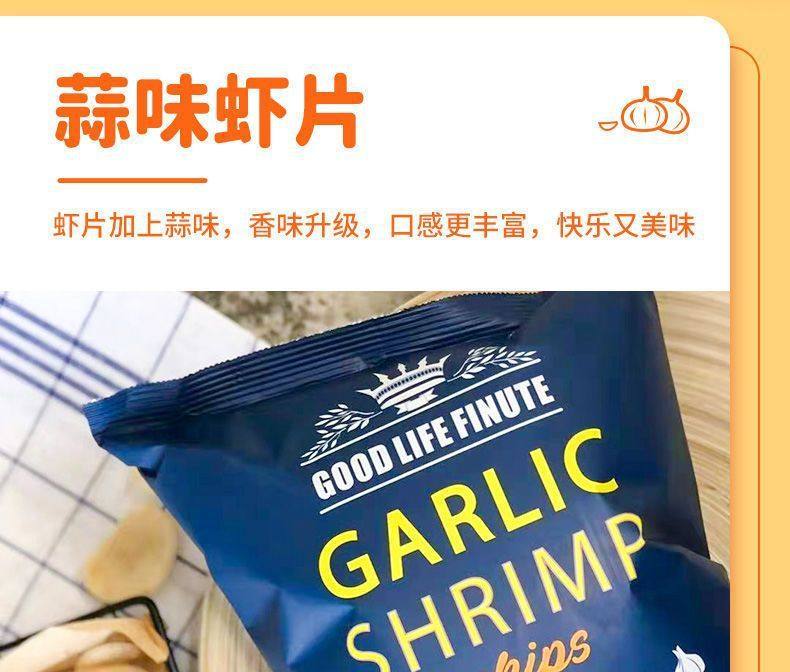 | Packaging specifications | 【1 bag】garlic shrimp crackers 82g,【1 bag】crab flavored shrimp crackers 82g |