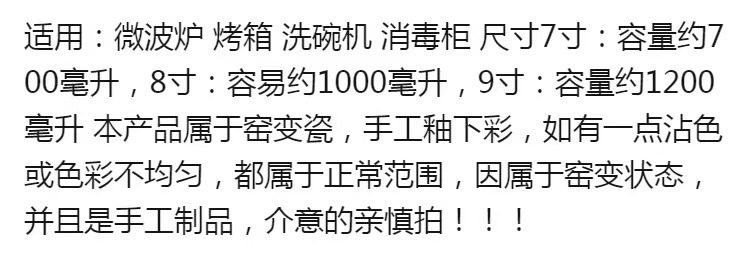 | Color | 7inch trumpet bowl blues (comes with chopsticks),7inch trumpet bowl emerald green (comes with chopsticks),7inch trumpet bowl dusk (comes with chopsticks),7inch trumpet bowl snow white (comes with chopsticks),8inch trumpet bowl blues (comes with chopsticks),8inch trumpet bowl emerald green (comes with chopsticks),8inch trumpet bowl dusk (comes with chopsticks),8inch trumpet bowl snow white (comes with chopsticks),8inch trumpet bowl blues (with spoon and chopsticks),8inch trumpet bowl emerald green (with spoon and chopsticks),8inch trumpet bowl dusk (comes with spoon and chopsticks),8inch trumpet bowl snow white (with spoon and chopsticks),9inch trumpet bowl blues (comes with chopsticks),9inch trumpet bowl emerald green (comes with chopsticks),9inch trumpet bowl dusk (comes with chopsticks),9inch trumpet bowl snow white (comes with chopsticks),9inch trumpet bowl blues (with spoon and chopsticks),9inch trumpet bowl emerald green (with spoon and chopsticks),9inch trumpet bowl dusk (comes with spoon and chopsticks),9inch trumpet bowl snow white (with spoon and chopsticks),8inch snowflake threaded bowl (comes with chopsticks),8inch snowflake threaded bowl (with spoon and chopsticks),9inch snowflake threaded bowl (comes with chopsticks),9inch snowflake threaded bowl (with spoon and chopsticks) |