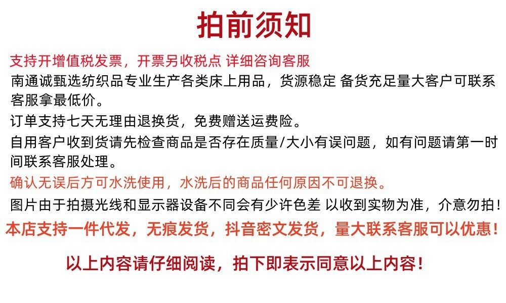| Dimensions | 0.9-1.2m bed sheet three-piece set [quilt cover 150*200 sheets 180*230 pillowcase],1.2m bed sheet four-piece set [quilt cover 150*200 sheets 180*230 pillowcases two],1.8m bed sheet four-piece set [quilt cover 180*220 sheets 230*250 pillowcases two],2.0m bed sheet four-piece set [quilt cover 200*230 sheets 230*250 pillowcases two],1.5m fitted sheet set of four [quilt cover 180*200 fitted sheet 150*200 pillowcase two],1.8m fitted sheet set of four [quilt cover 180*220 fitted sheet 180*200 pillowcase two],1.5m fitted sheet set of four [quilt cover 200*230 fitted sheet 150*200 pillowcases two],1.8m fitted sheet set of four [quilt cover 200*230 fitted sheet 180*200 pillowcases two],A pair of 48*74cm pillowcases [randomly sent] |