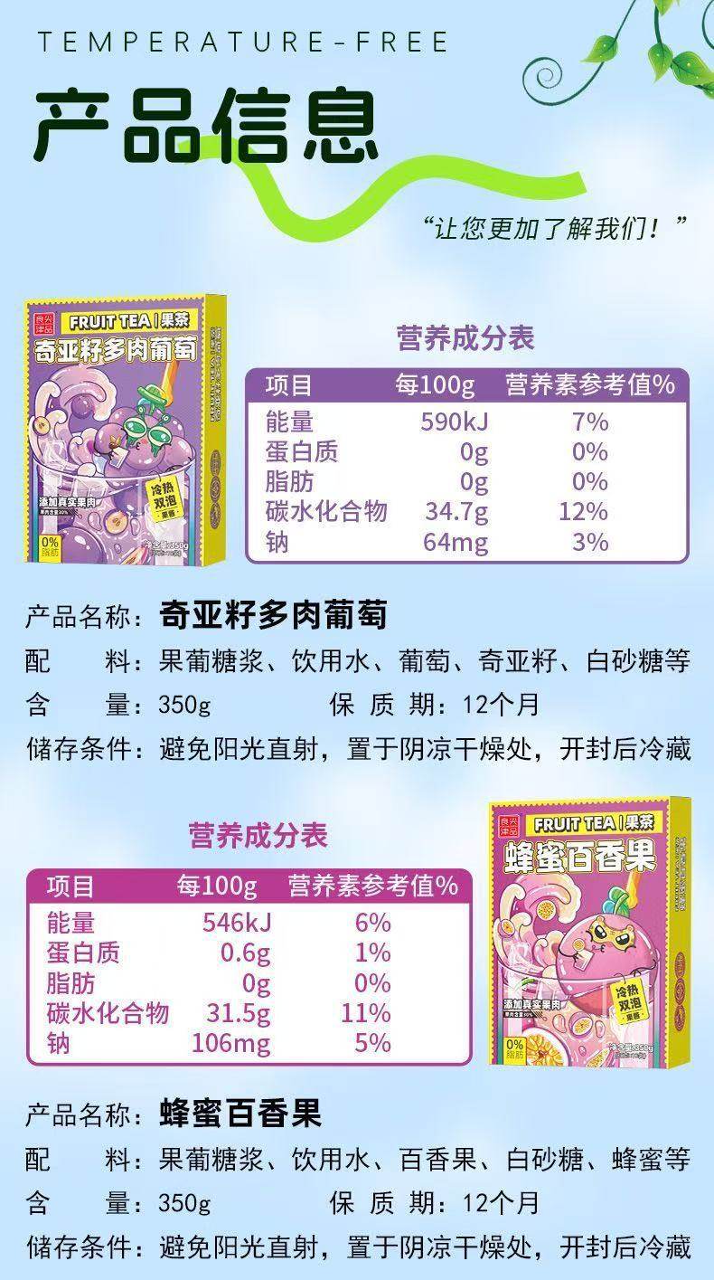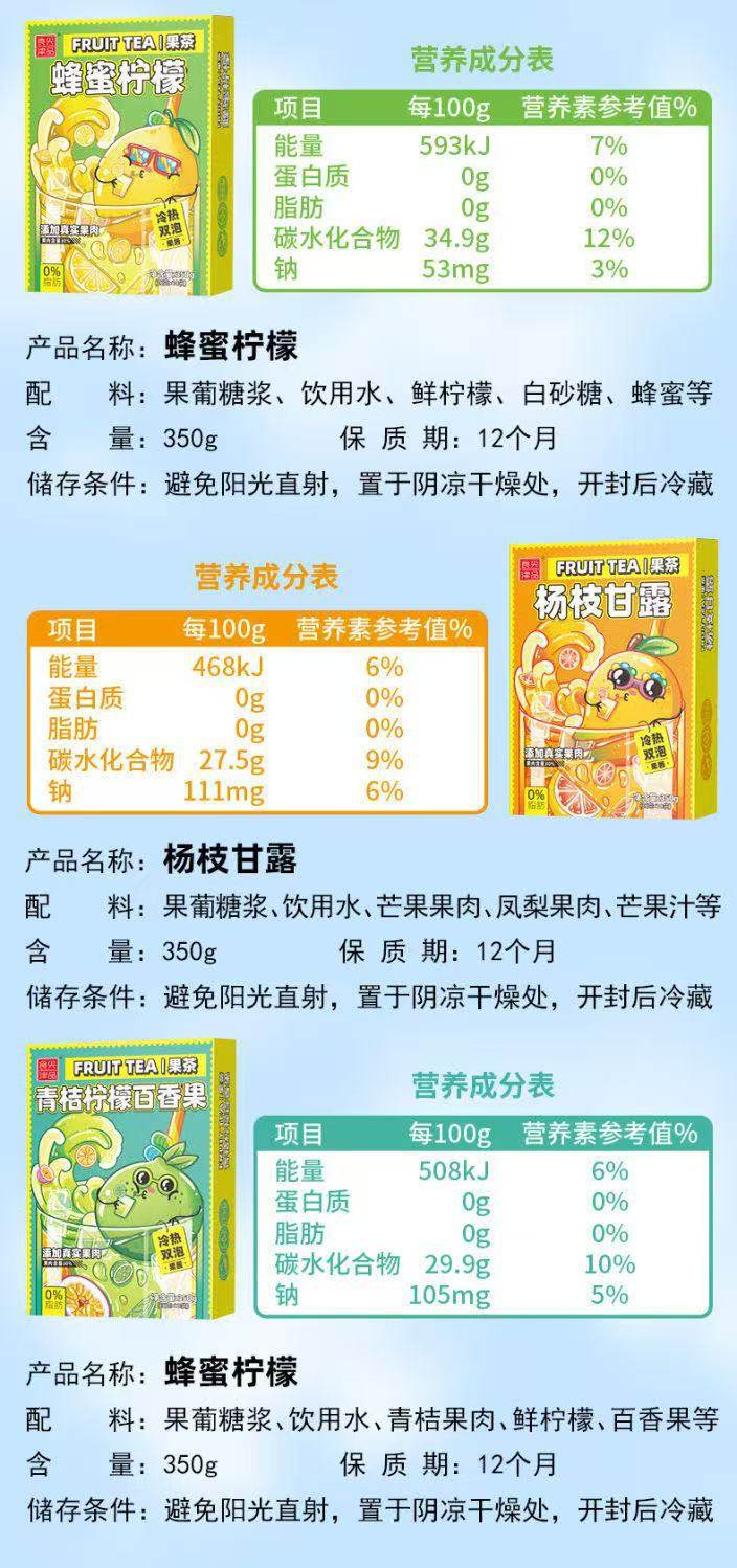 | Packaging specifications | Shijianjinpin-green orange lemon passion fruit tea 350g*1 box (contains 10 sachets),Food tip product-yangzhi manna 350g*1 box (contains 10 sachets),Shijianjinpin-honey lemon tea 350g*1 box (contains 10 sachets),Shijianjinpin-honey grapefruit tea 350g*1 box (contains 10 sachets),Shijianjinpin-honey passion fruit tea 350g*1 box (contains 10 sachets),Shijianjinpin-peach oolong lemon tea 350g*1 box (contains 10 sachets),Shijianjinpin-chia seed succulent grapes 350g*1 box (contains 10 sachets) |