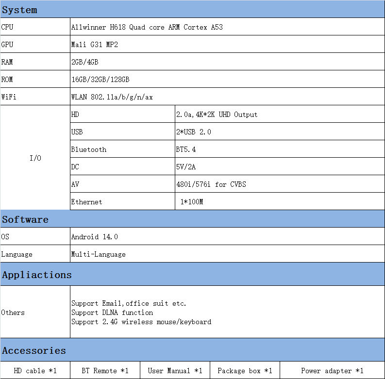 | Package list | Set-top box, power cord, hd cable, manual, color box |