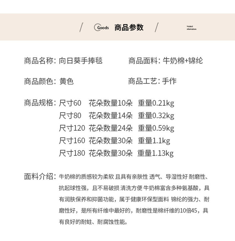 | Color | Sunflower + daisy flower (milk white blanket),Sunflower (milk white blanket),Sunflower (off-white blanket),Sunflower + yellow orange lily of the valley (milk white blanket),Sunflower + yellow orange lily of the valley (off-white blanket),Three-color daisy flower (milk white blanket),Yellow daisy flower (milk white blanket),Red daisy flower (milk white blanket),Pink daisy flower (milk white blanket),Red rose (milk white blanket),Red rose (off-white blanket),Peach makes you happy (milk white blanket) |