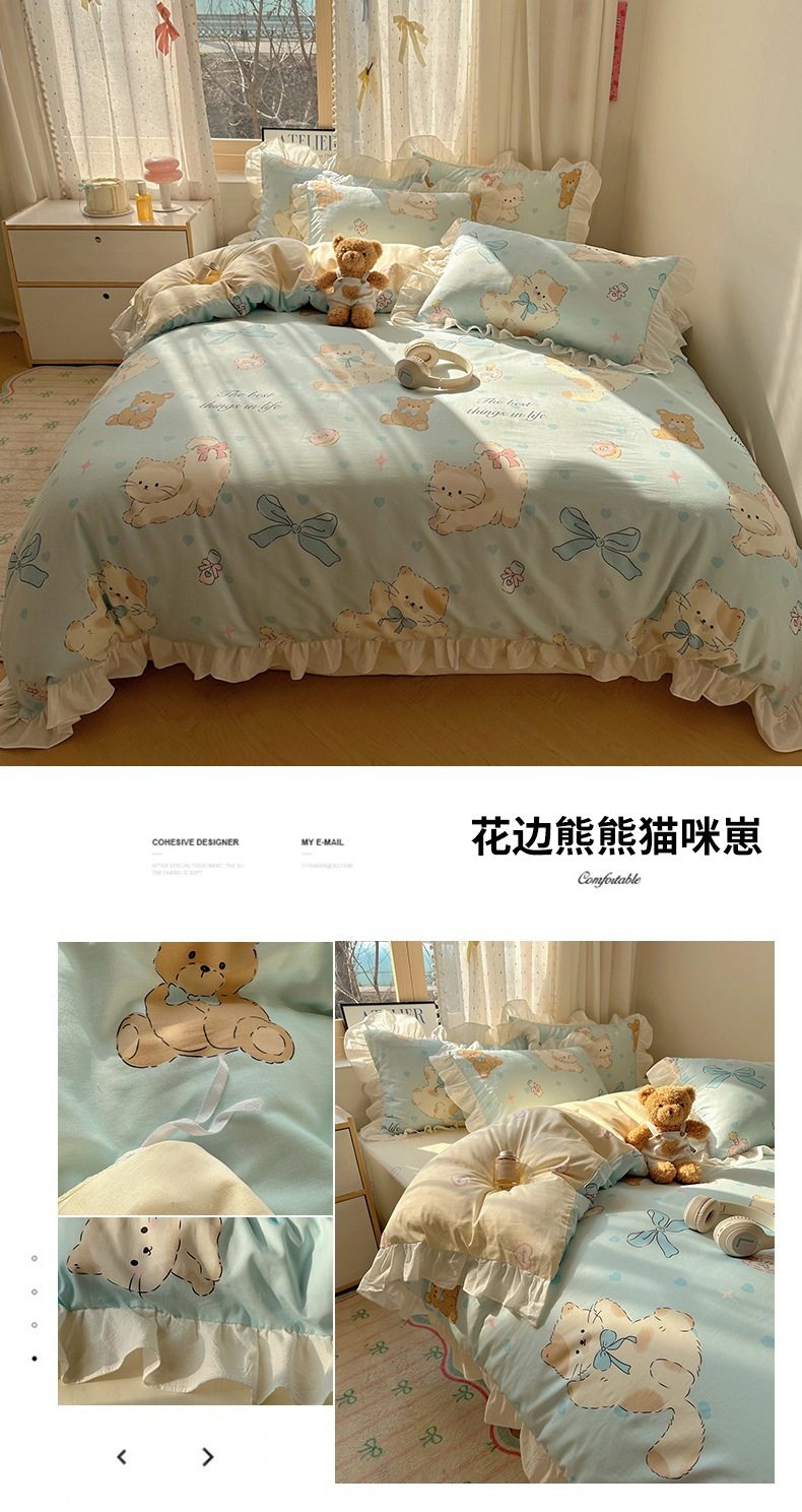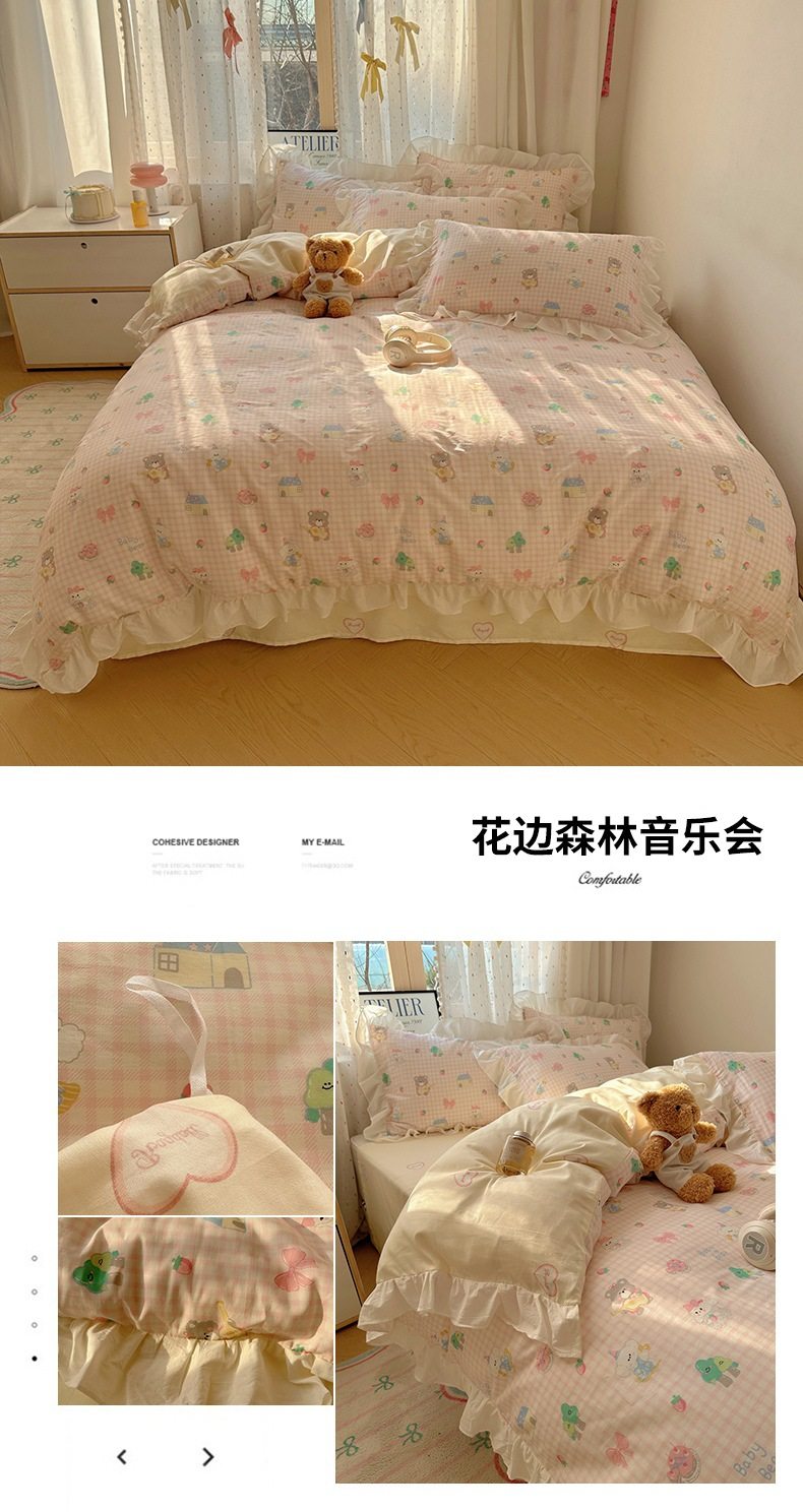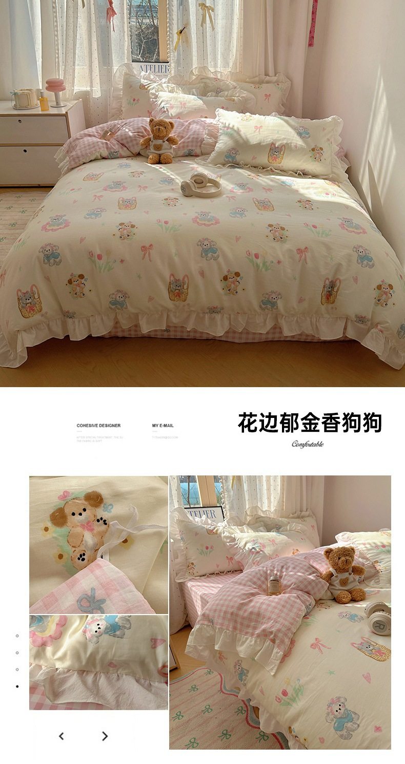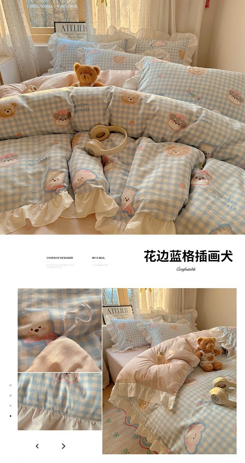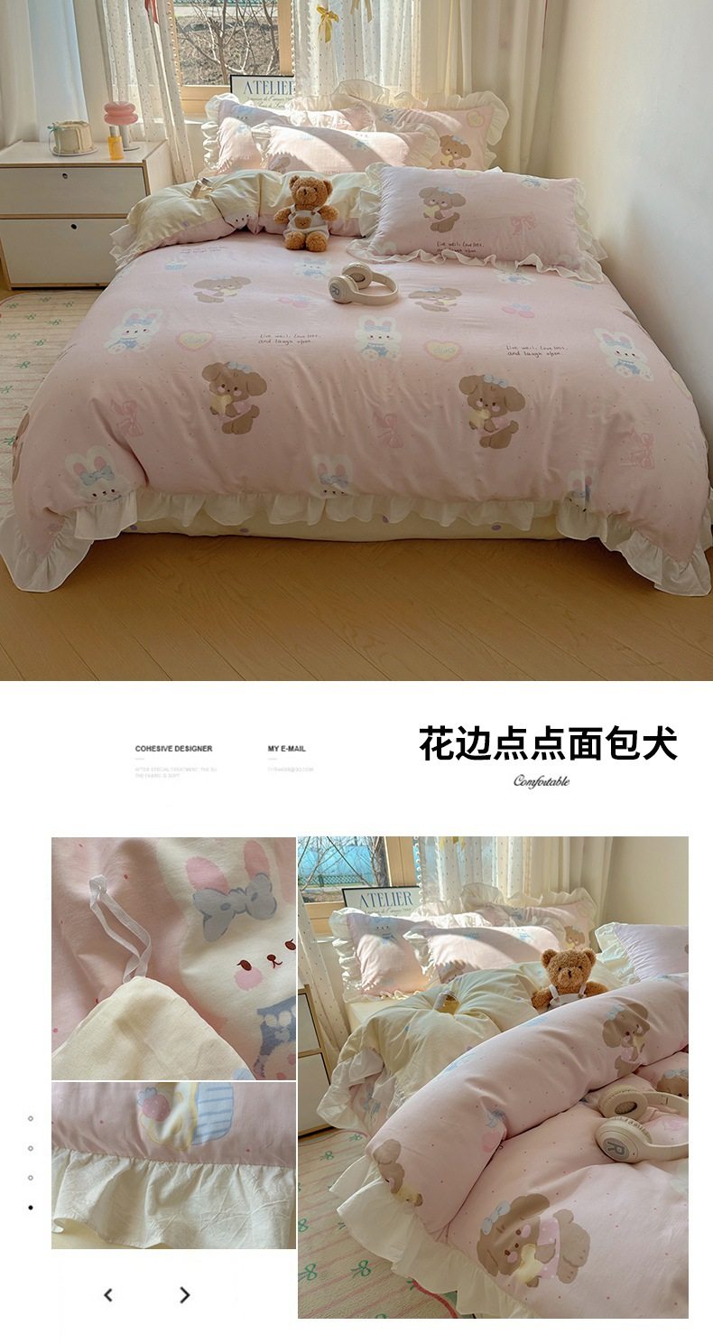 Ins Lovable Style Lace Cotton Four-piece Bedding 100 Cotton Cartoon Quilt Cover Bed Sheet Three-piece Set for Dormitory