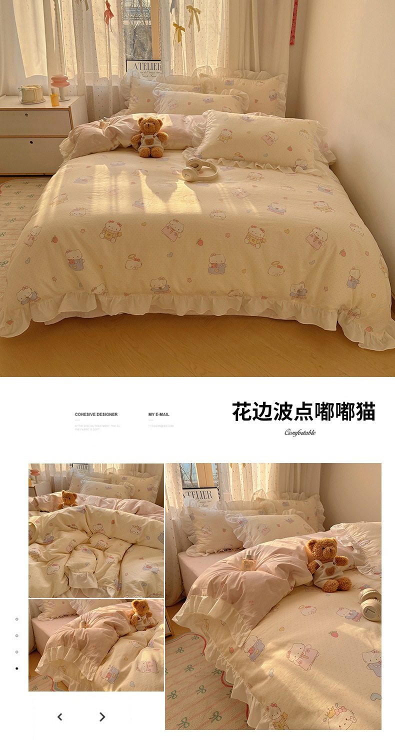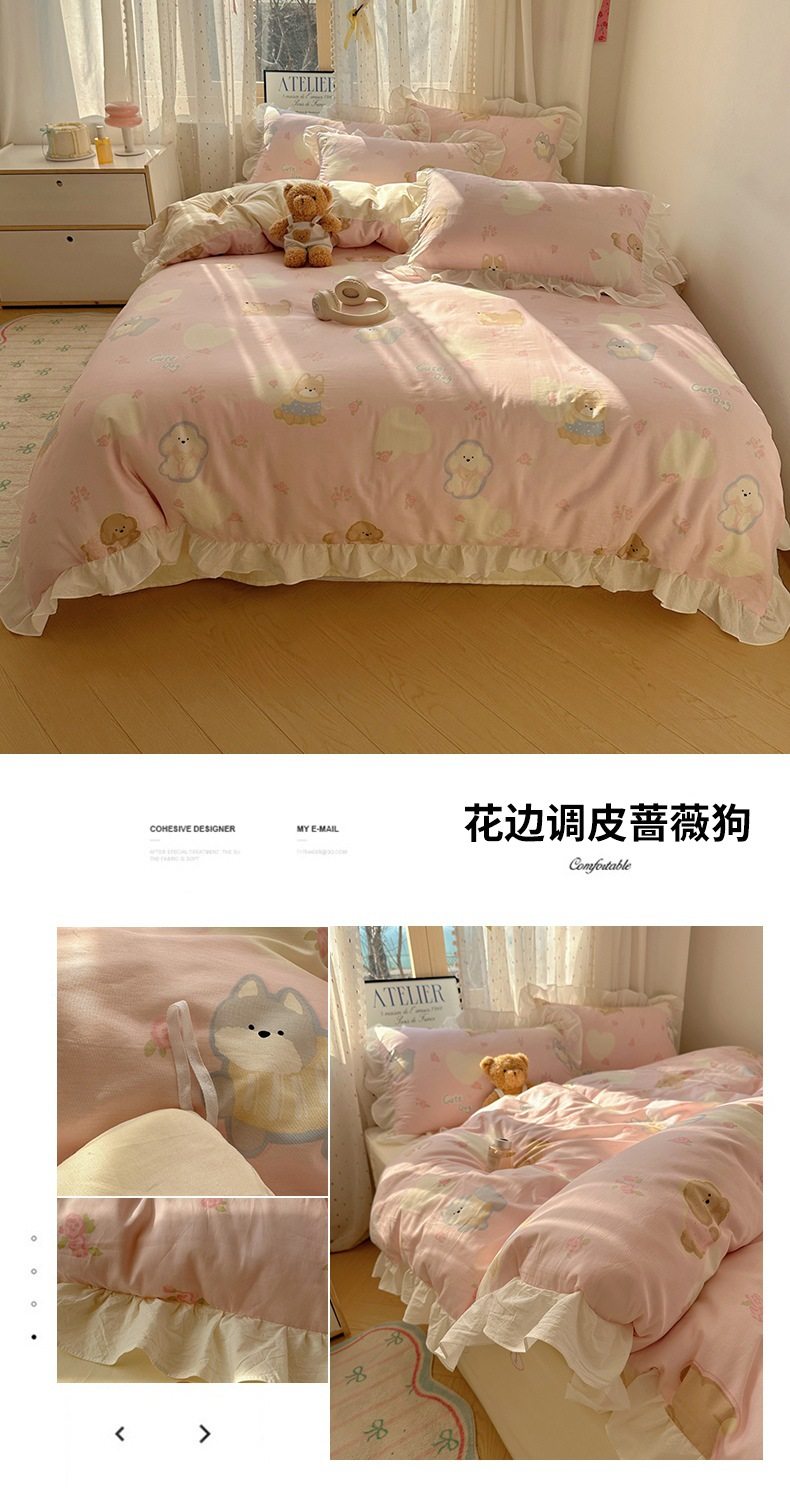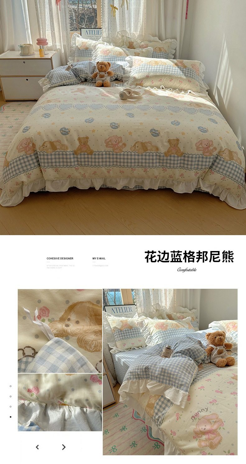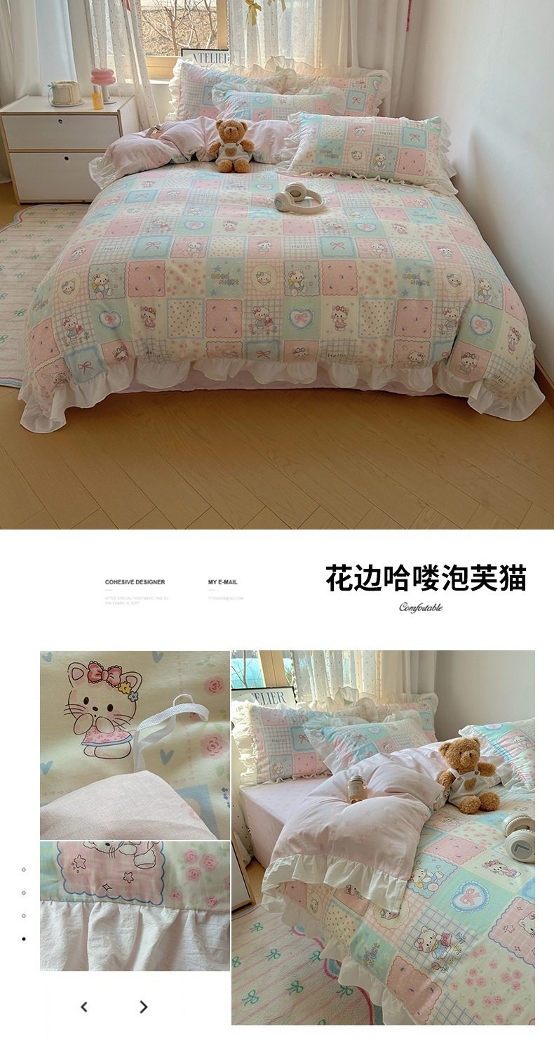 Ins Lovable Style Lace Cotton Four-piece Bedding 100 Cotton Cartoon Quilt Cover Bed Sheet Three-piece Set for Dormitory