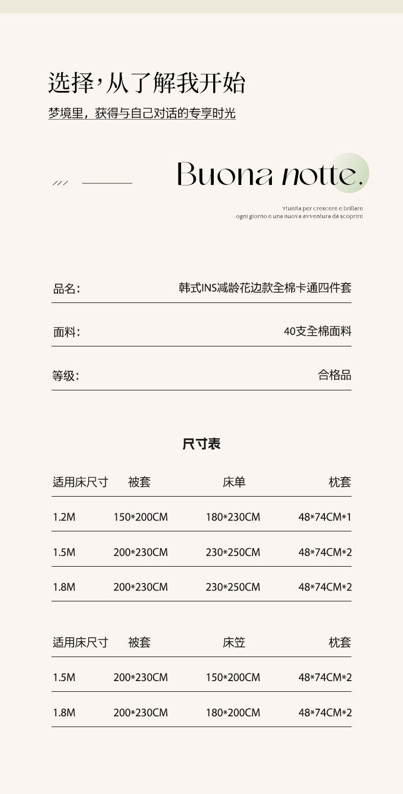 | Dimensions | 0.9/1.2m bed sheet dormitory style quilt cover 150*200,1.5m bed sheet four-piece set, quilt cover 200*230,1.8m bed sheet four-piece set, quilt cover 200*230,Fitted sheet 1.5m bed sheet set of four, quilt cover 200*230,Fitted sheet 1.8m bed sheet set of four, quilt cover 200*230 |