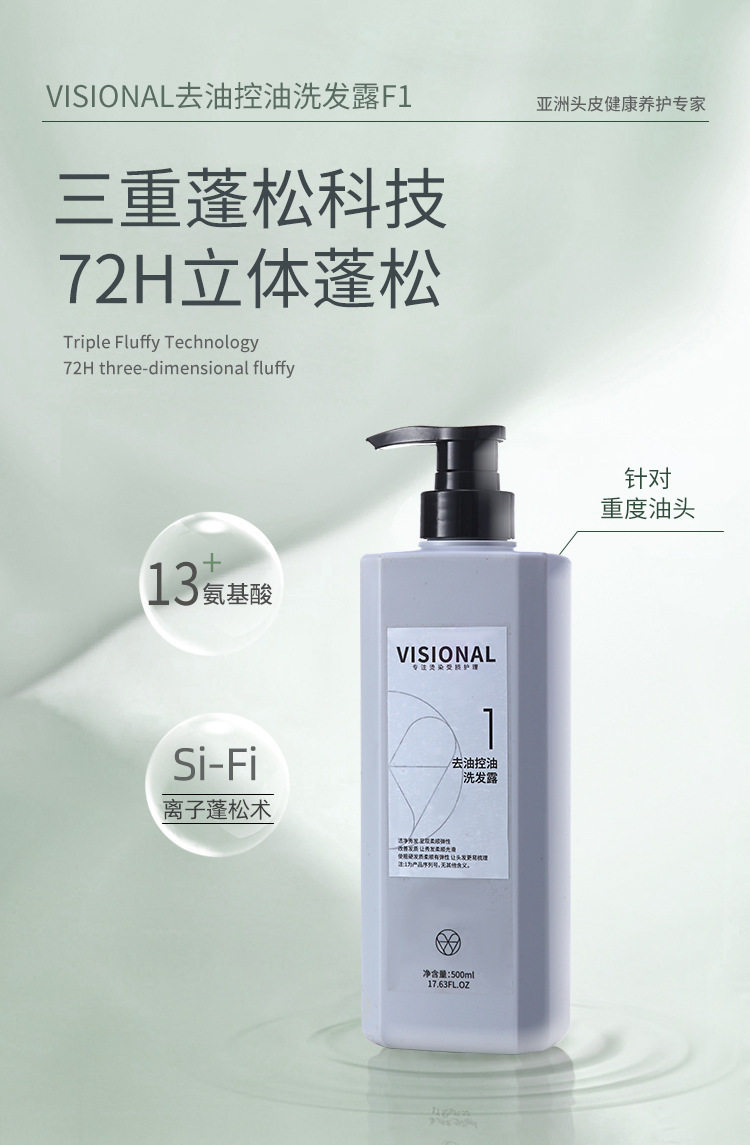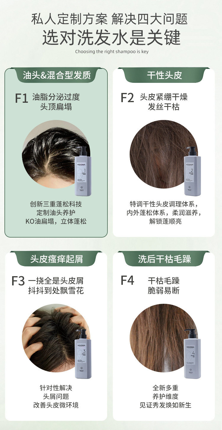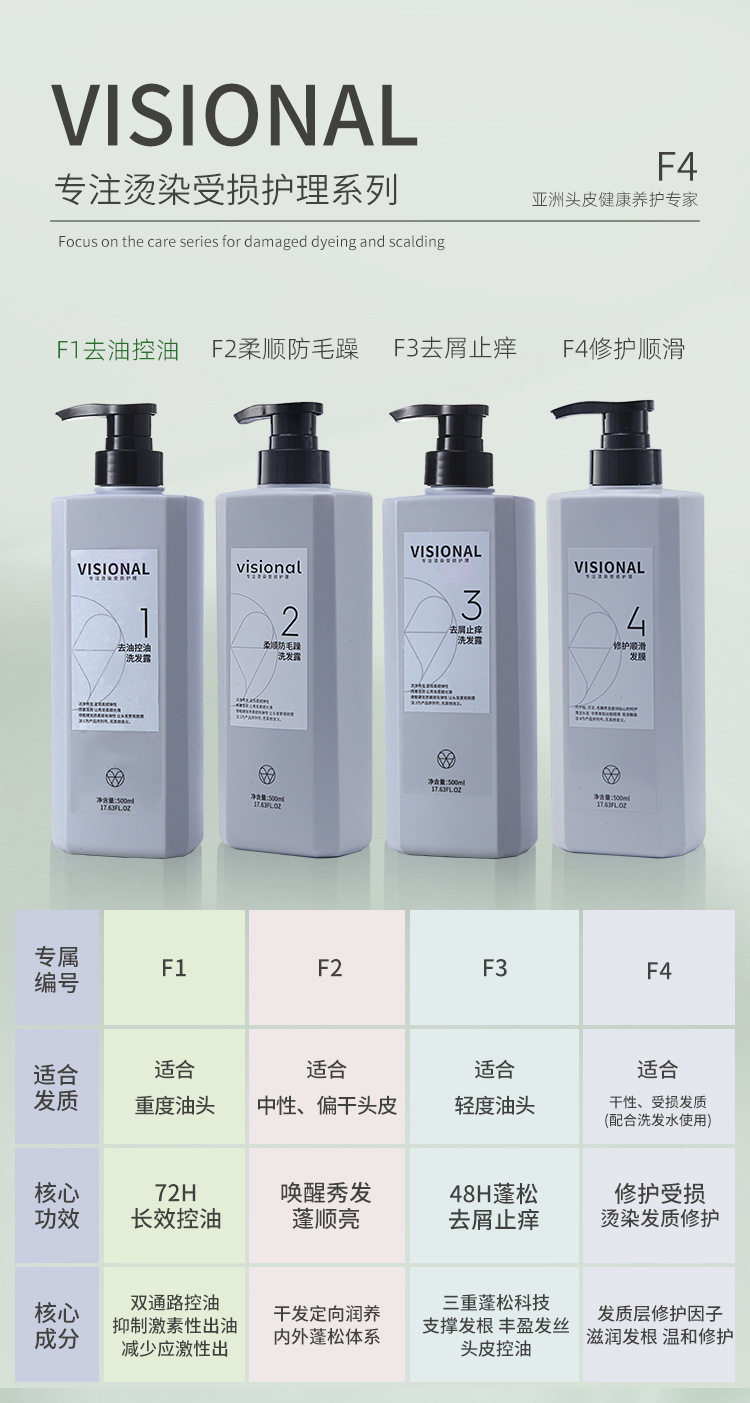 | Specification type | Visional oil removing and oil control shampoo f1,Visional smooth anti-frizz shampoo f2,Visional anti-dandruff and anti-itching shampoo f3,Visional repair and smooth hair mask f4 |