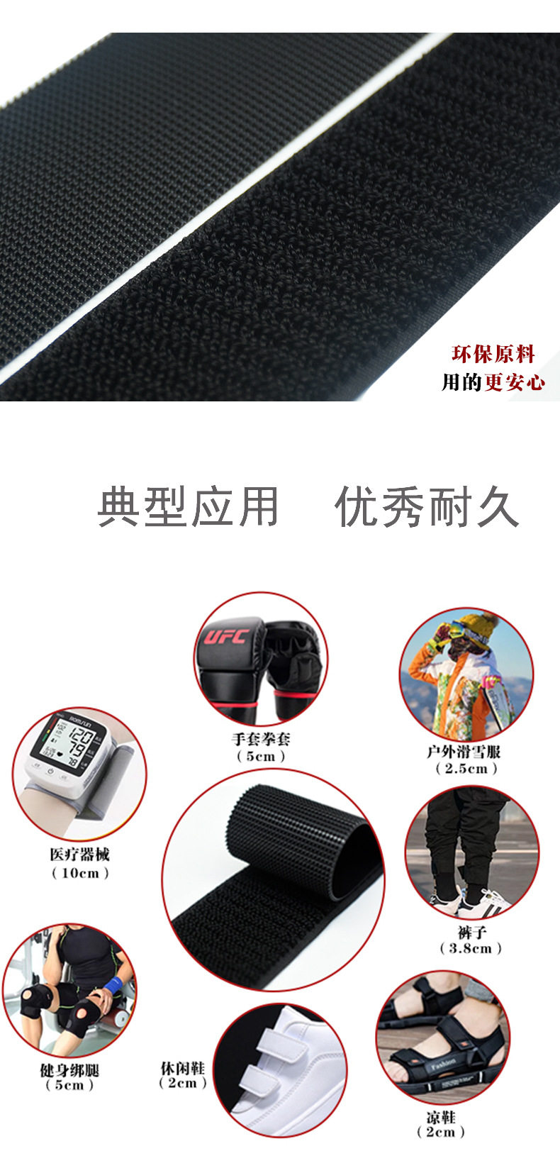 | Specifications and models | 16mm wide velcro (black),16mm wide velcro (white),20mm wide velcro (black),20mm wide velcro (white),25mm wide velcro (black),25mm wide velcro (white),30mm wide velcro (black),30mm wide velcro (white),38mm wide velcro (black),38mm wide velcro (white),50mm wide velcro (black),50mm wide velcro (white),100mm wide velcro (black),100mm wide velcro (white) |
