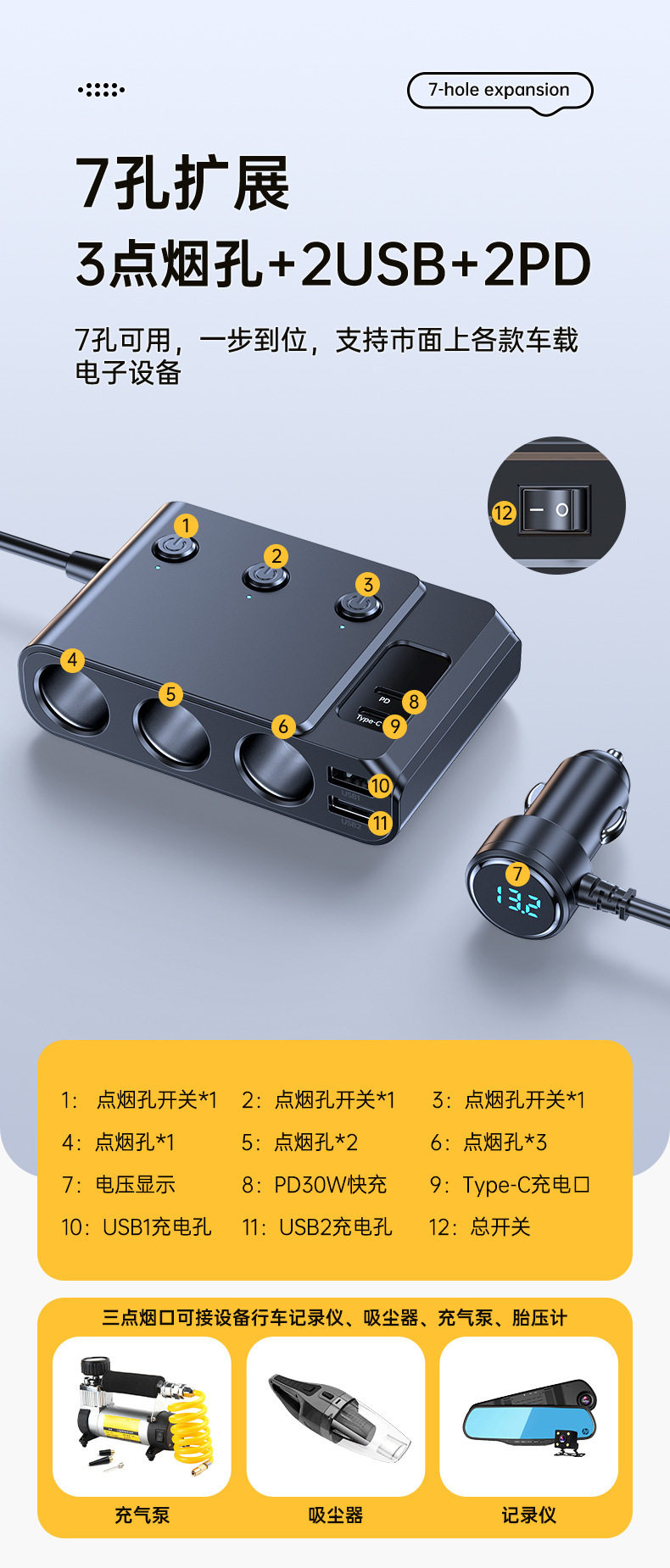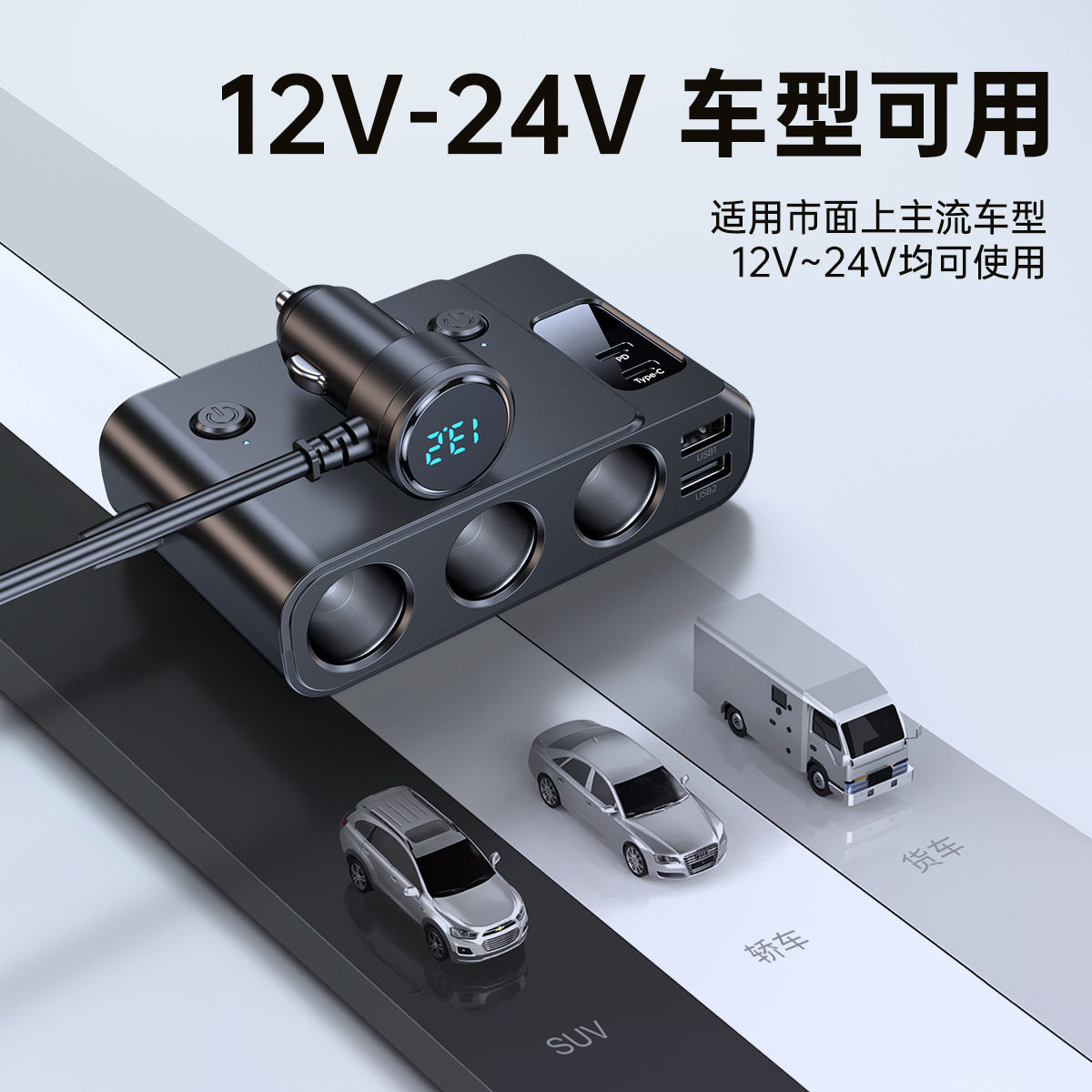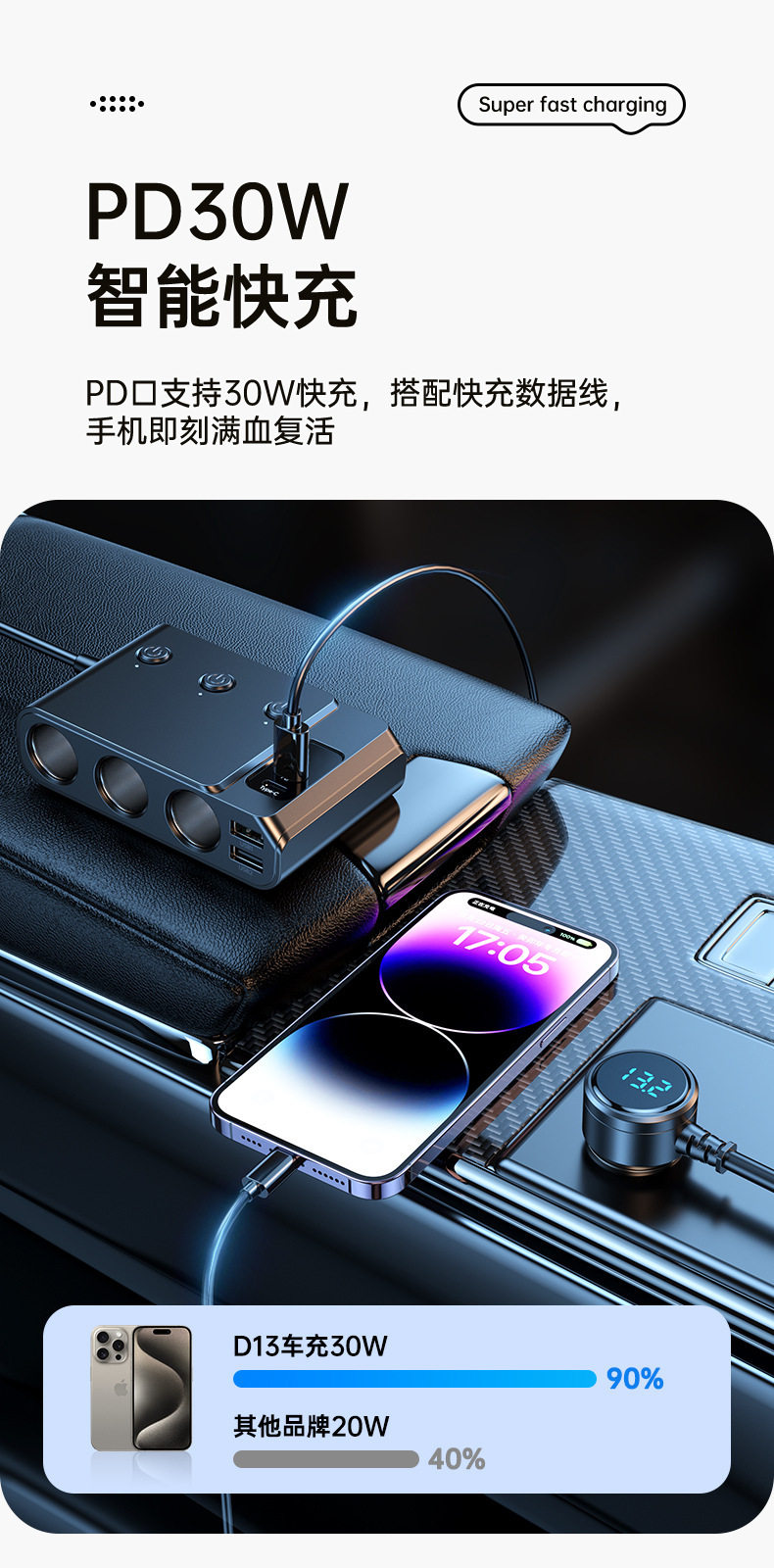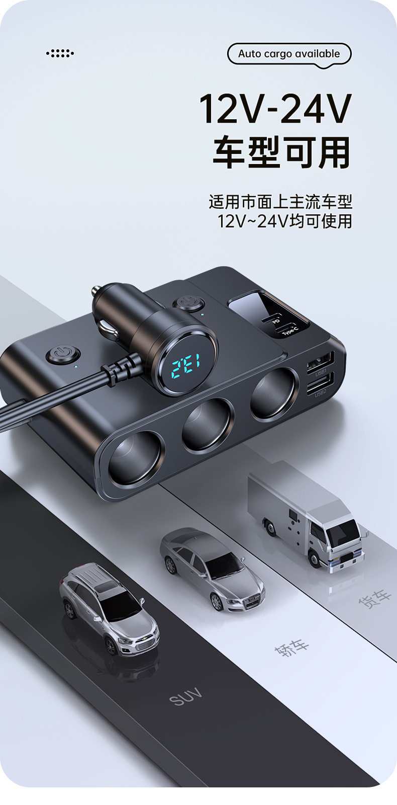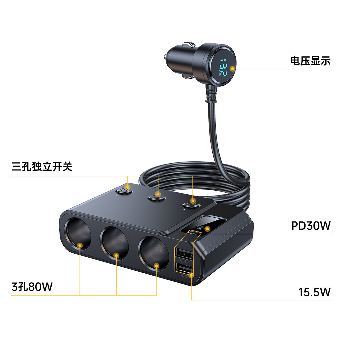 Cross-Border Hot-Selling One-To-Three Car Cigarette Lighter Multi-Function Usb3.0 and Pd Interface Car Multi-Device Charger
