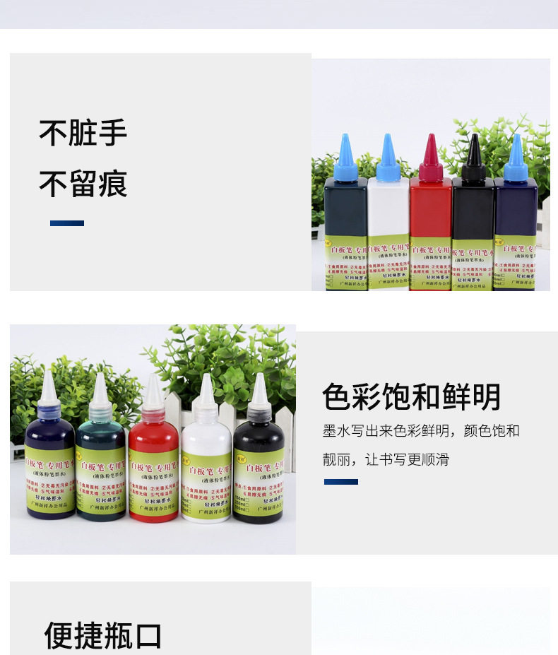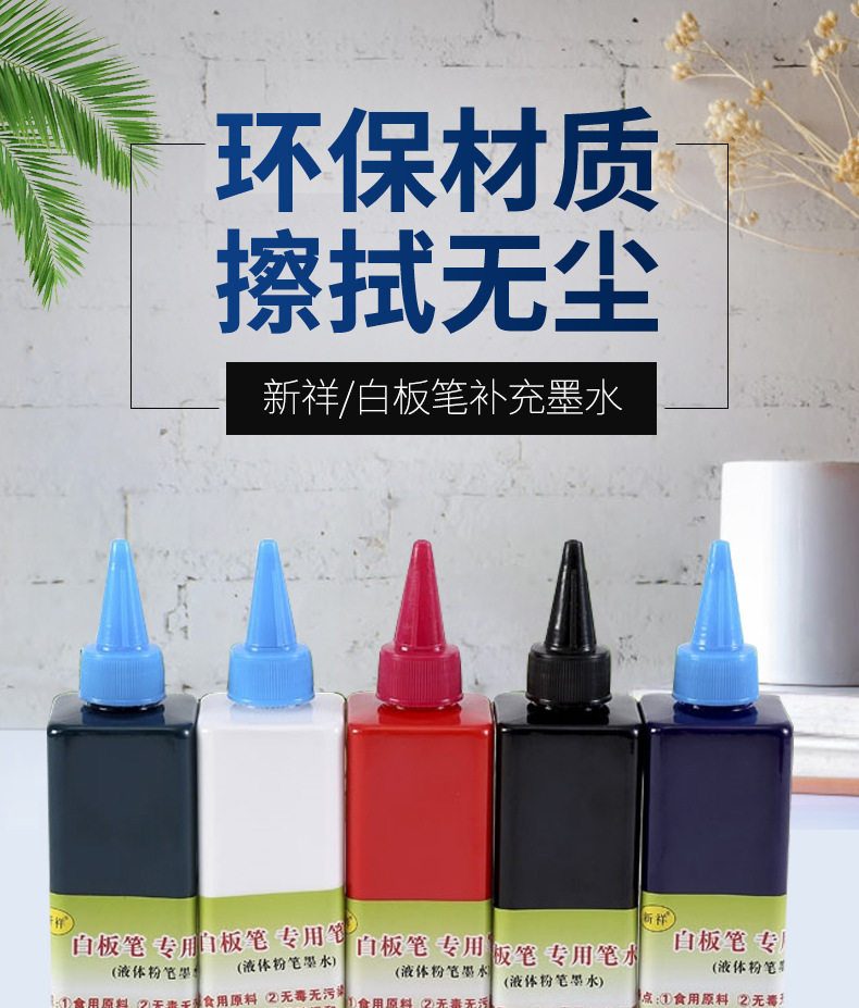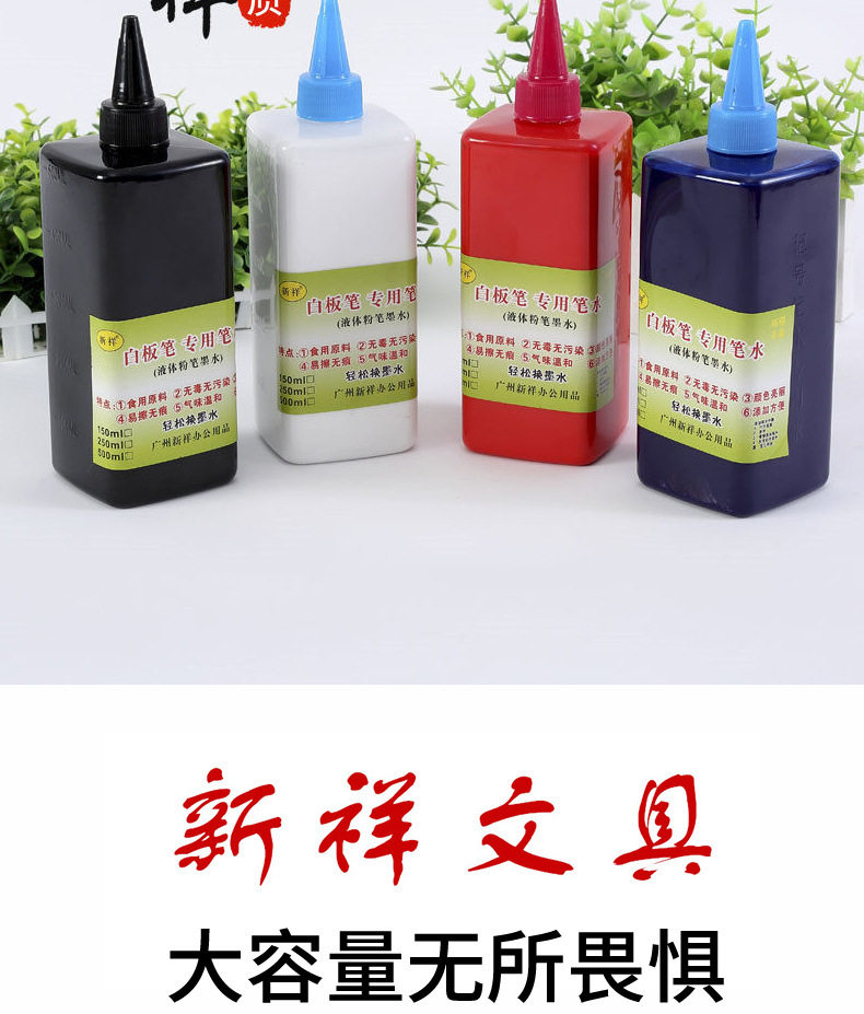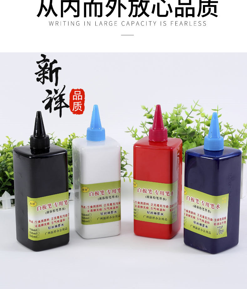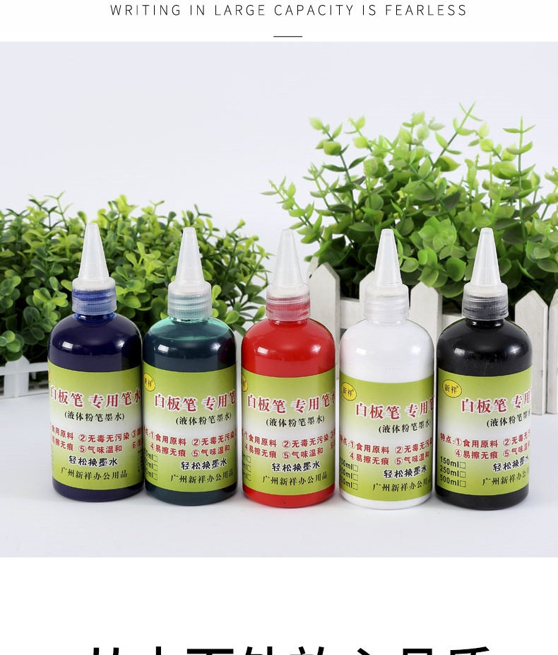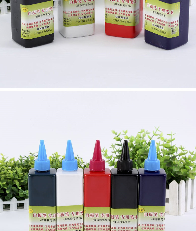 | Color | 500ml black 1 bottle (comes with whiteboard pen + straw),500ml blue 1 bottle (comes with whiteboard pen + straw),500ml red 1 bottle (comes with whiteboard pen + straw),500ml green 1 bottle (comes with whiteboard pen + straw),500ml black 2 bottles (free whiteboard pen + straw),500ml blue 2 bottles (free whiteboard pen + straw),500ml red 2 bottles (free whiteboard pen + straw),250ml blue 1 bottle (comes with whiteboard pen + straw),250ml red 1 bottle (comes with whiteboard pen + straw),250ml black 1 bottle (comes with whiteboard pen + straw),250ml green 1 bottle (comes with whiteboard pen + straw),150ml black 1 bottle,150ml red 1 bottle,150ml blue 1 bottle,Matte board whiteboard water 500ml 1 bottle color remarks,Matte board whiteboard water 250ml1 bottle color remarks,Matte board whiteboard water 150ml1 bottle color remarks,500ml white 1 bottle (liquid pen + straw),250ml white 1 bottle (liquid pen + straw),1 bottle of 150ml white (comes with whiteboard pen + straw),Whiteboard pens [12 pieces],Whiteboard cleaner 100ml 1 bottle,Trial price of 2 empty liquid pens,1 whiteboard cleaner |