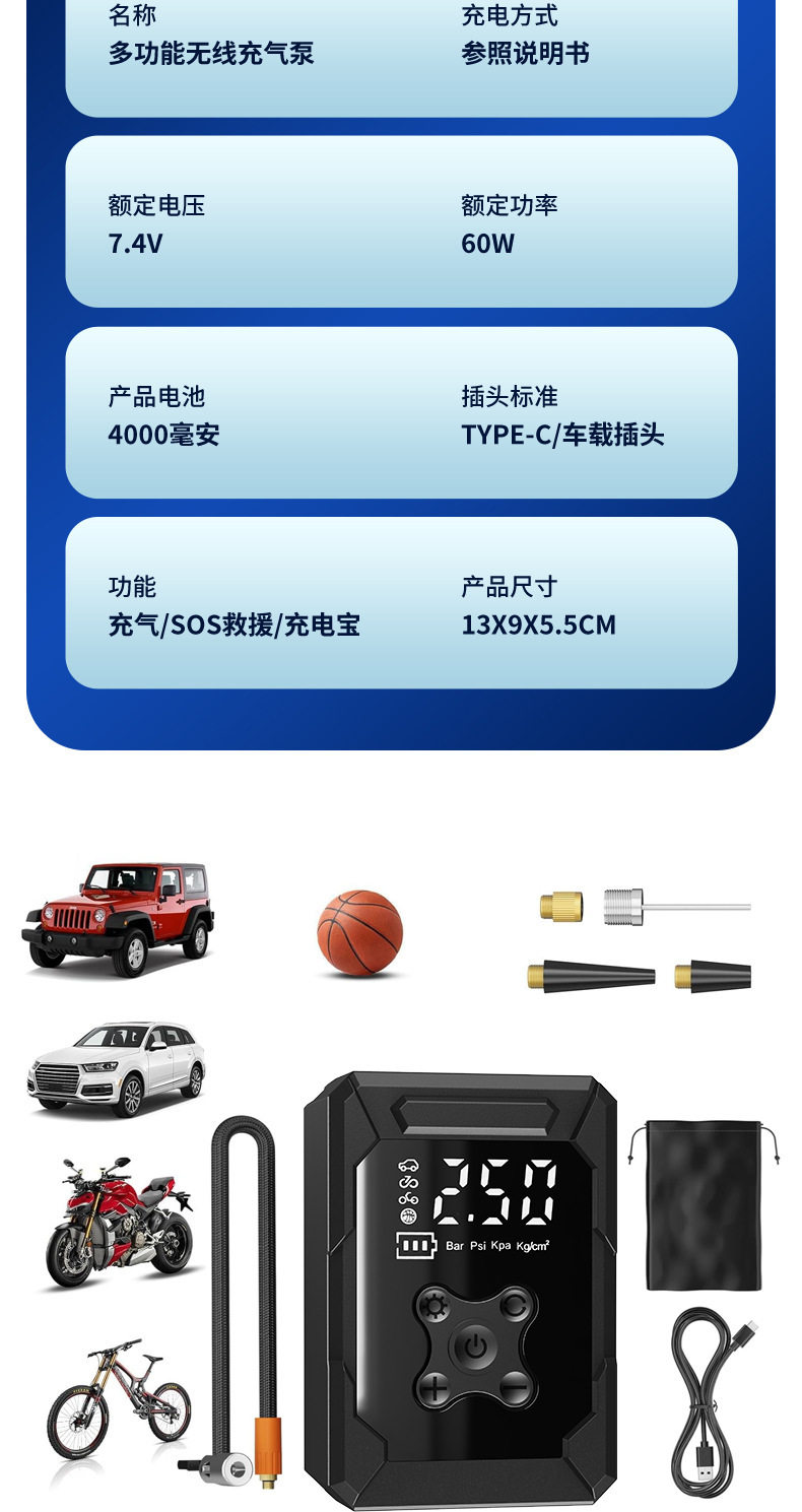 | Additional features | Lighting,Tire pressure gauge,Warning light,Usb charging |