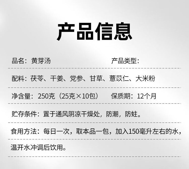| Packaging specifications | Authentic huangya soup 250g (25g*10 sticks) |