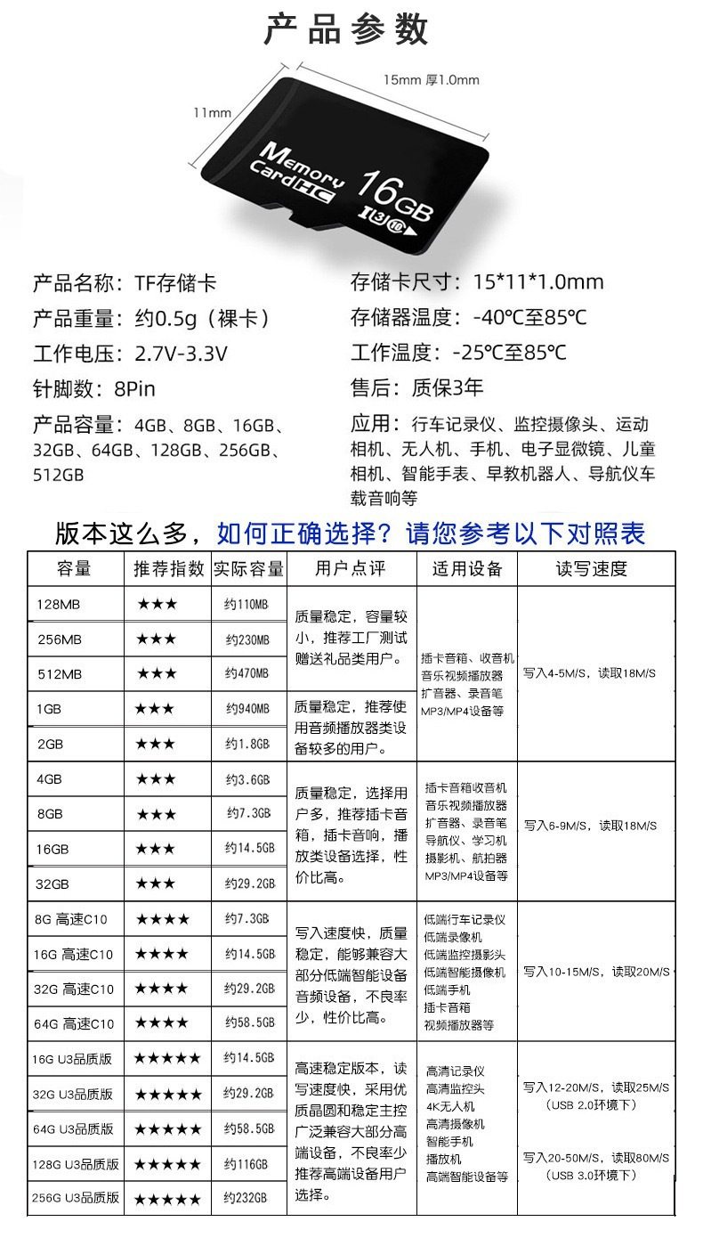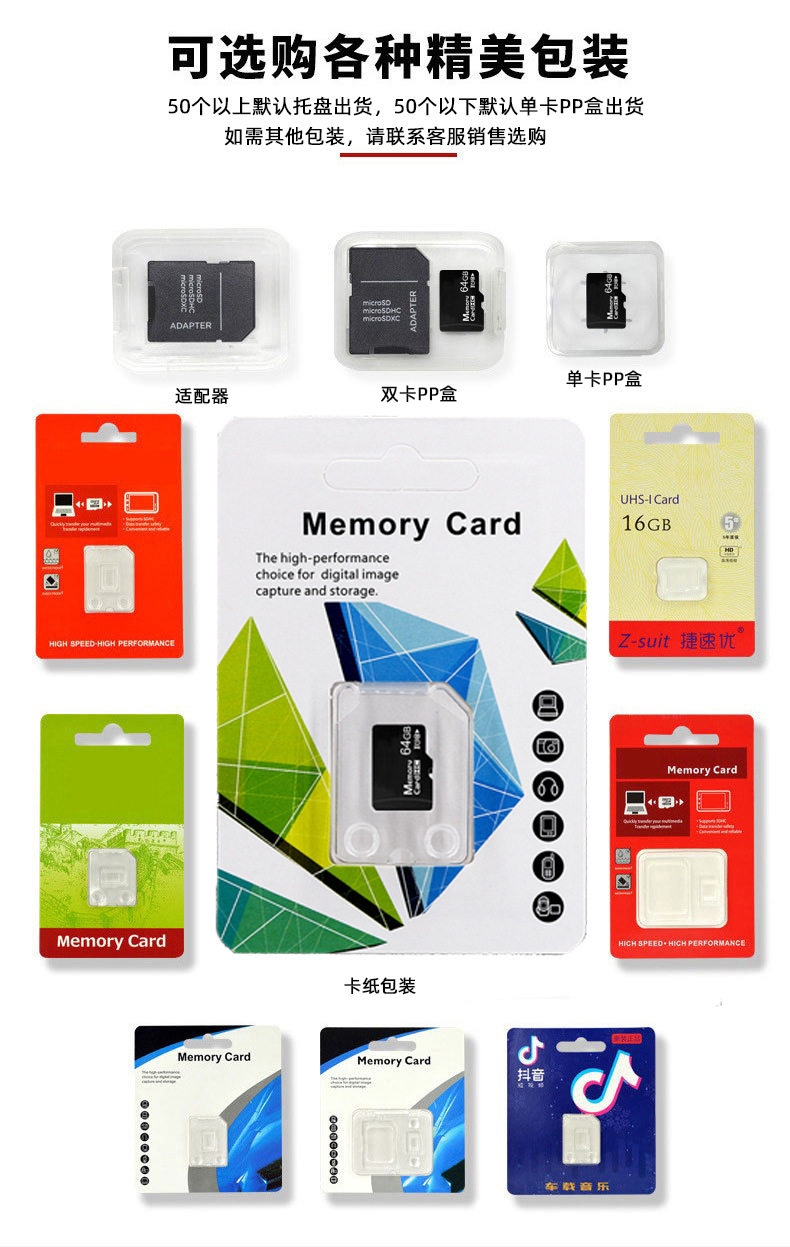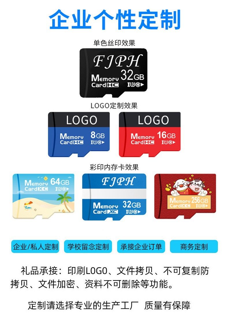 | Capacity | 128mb fixed version card,256mb fixed version card,512mb fixed version card,2gb- c10 high speed factory edition card,4gb- c10 high speed factory edition card,8gb- c10 high speed factory edition card,16gb- c10 high speed factory edition card,32gb- c10 high speed factory edition card,64gb- c10 high speed factory edition card,128gb-c10 high-speed factory version card,4gb-u1 high-speed high-quality taiwan version card,8gb-u1 high-speed high-quality taiwan version card,16gb-u3 high-speed high-quality taiwan version card,32gb-u3 high-speed high-quality taiwan version card,64gb-u3 high-speed high-quality taiwan version card,128gb-u3 high-speed high-quality taiwan version card,256gb-u3 high-speed high-quality taiwan version card,512gb-u3 high-speed high-quality taiwan version card,32gb-special card for camera recorder monitoring,64gb-special card for camera recorder monitoring,128gb-special card for camera recorder monitoring,256gb-special card for camera recorder monitoring |