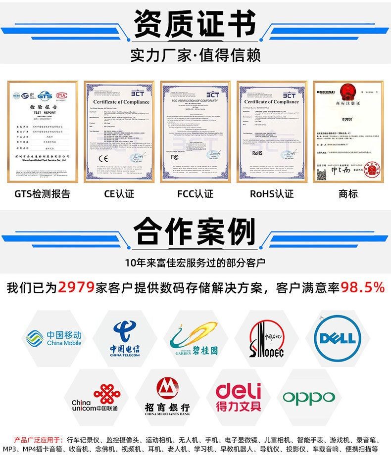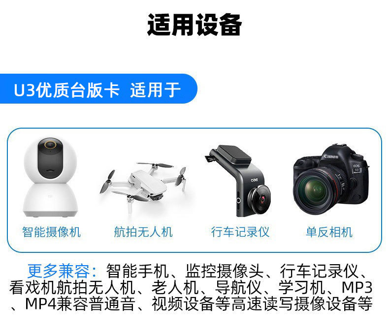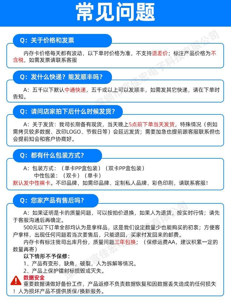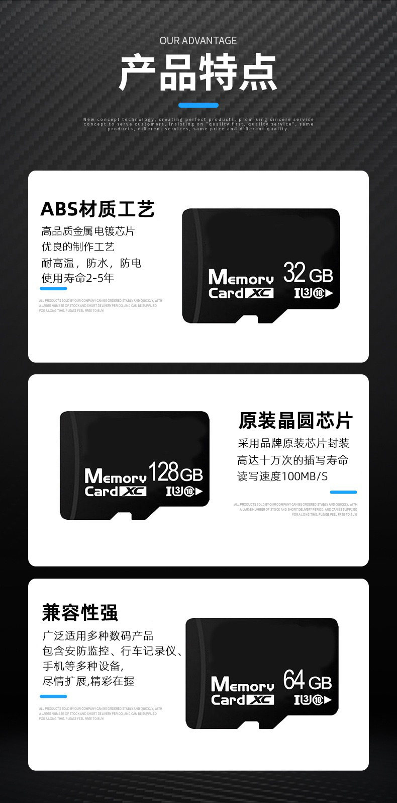 | Capacity | 128mb fixed version card,256mb fixed version card,512mb fixed version card,2gb- c10 high speed factory edition card,4gb- c10 high speed factory edition card,8gb- c10 high speed factory edition card,16gb- c10 high speed factory edition card,32gb- c10 high speed factory edition card,64gb- c10 high speed factory edition card,128gb-c10 high-speed factory version card,4gb-u1 high-speed high-quality taiwan version card,8gb-u1 high-speed high-quality taiwan version card,16gb-u3 high-speed high-quality taiwan version card,32gb-u3 high-speed high-quality taiwan version card,64gb-u3 high-speed high-quality taiwan version card,128gb-u3 high-speed high-quality taiwan version card,256gb-u3 high-speed high-quality taiwan version card,512gb-u3 high-speed high-quality taiwan version card,32gb-special card for camera recorder monitoring,64gb-special card for camera recorder monitoring,128gb-special card for camera recorder monitoring,256gb-special card for camera recorder monitoring |