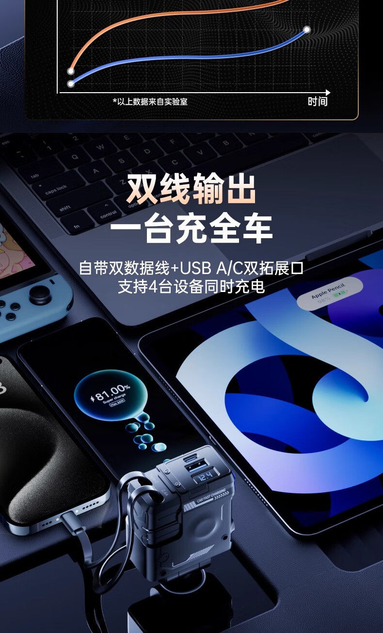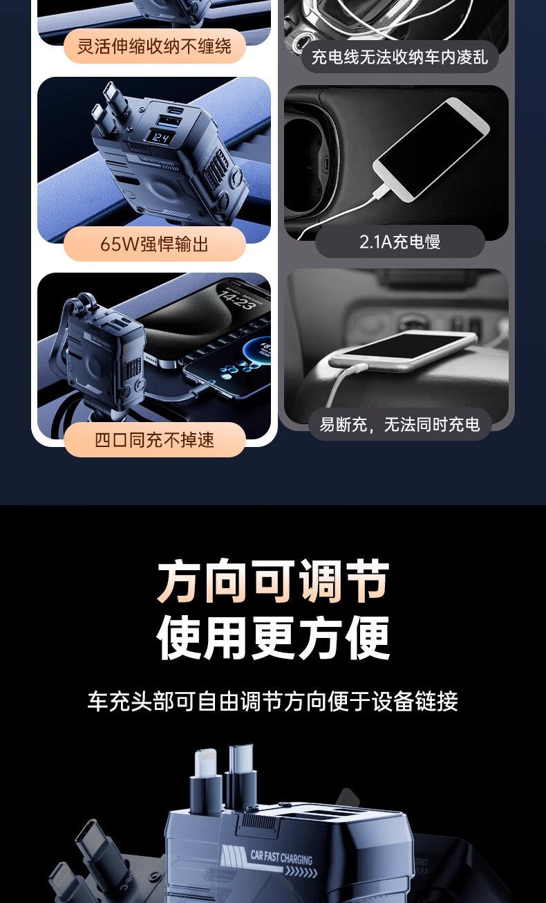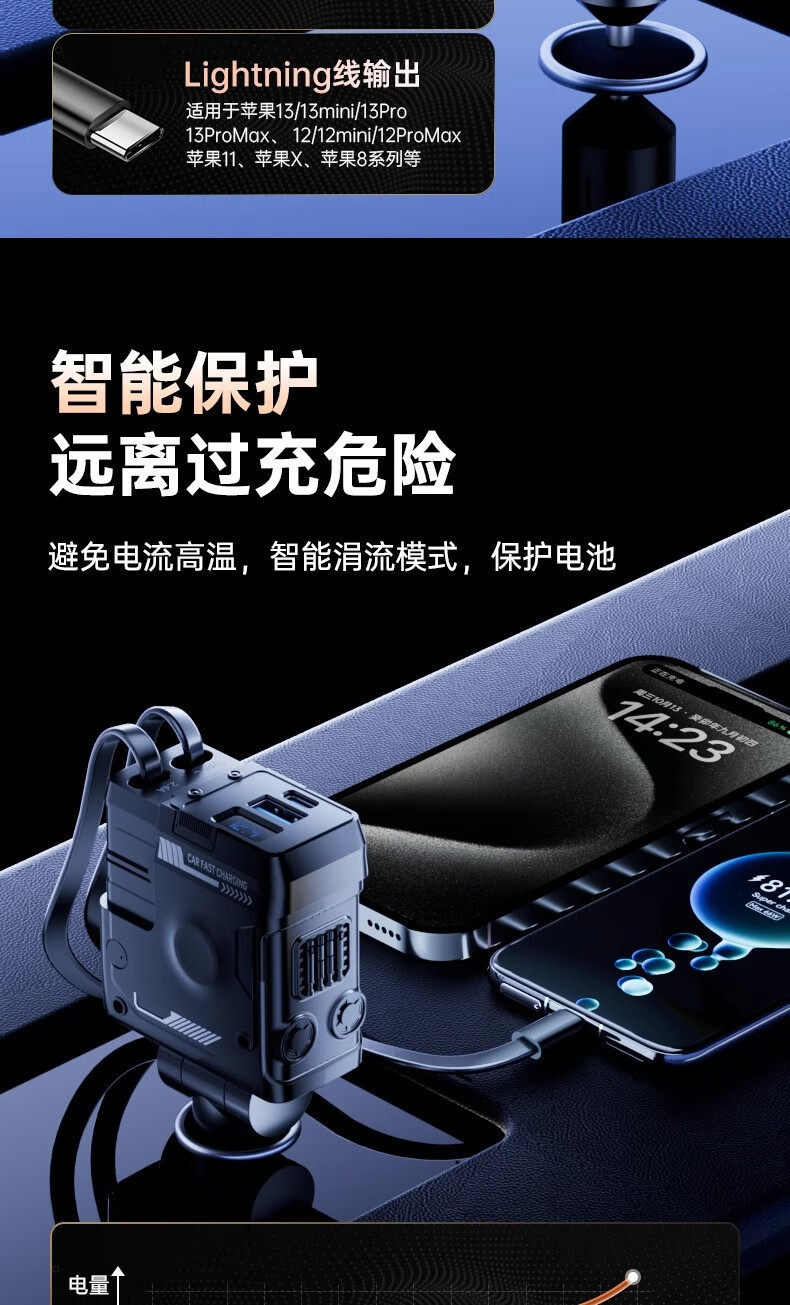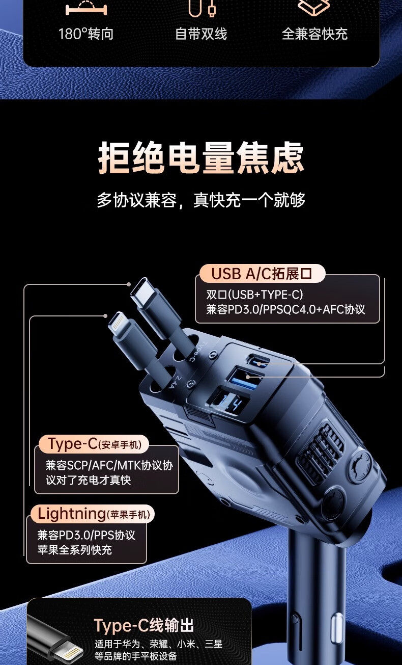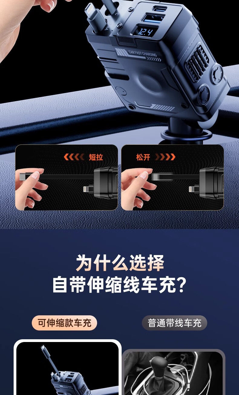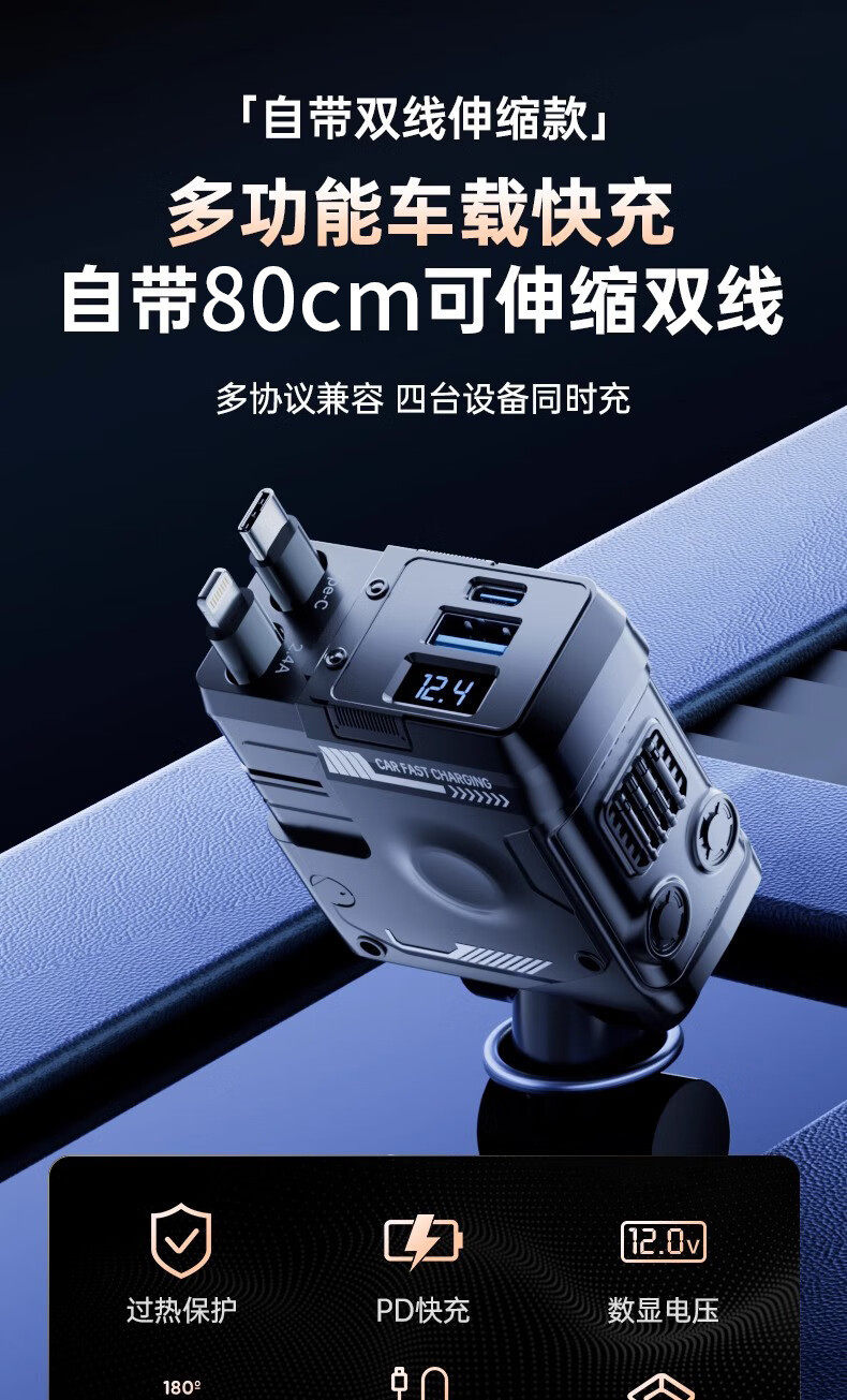 Mecha Retractable Cord Car Charger Car 120W Super Fast Charging One to Three Car Cigarette Lighter Flash Charging Car Charger