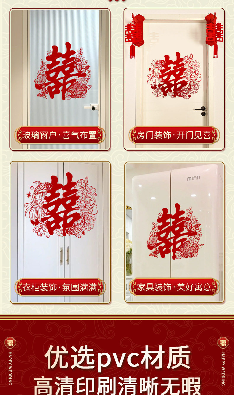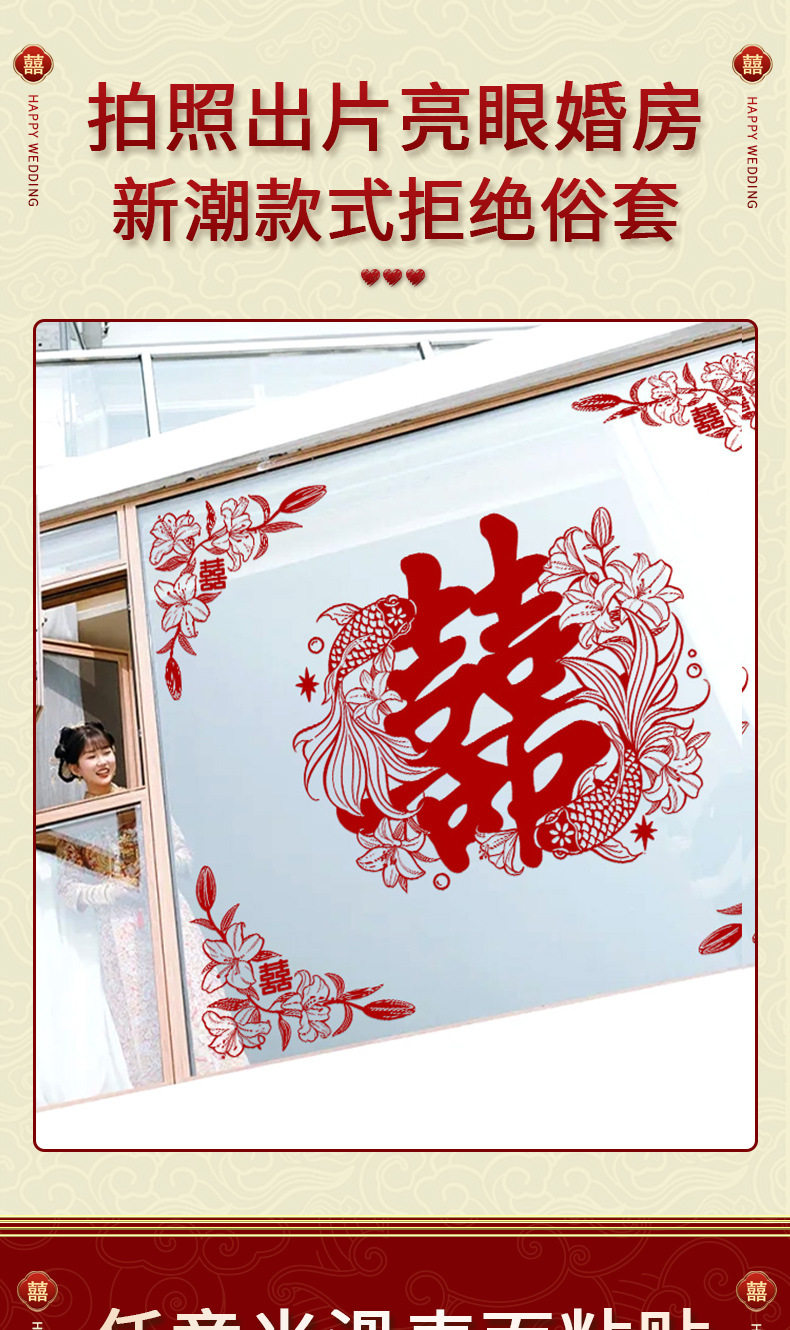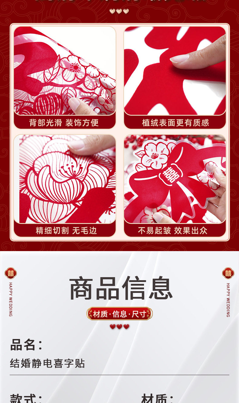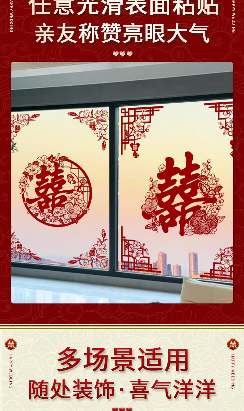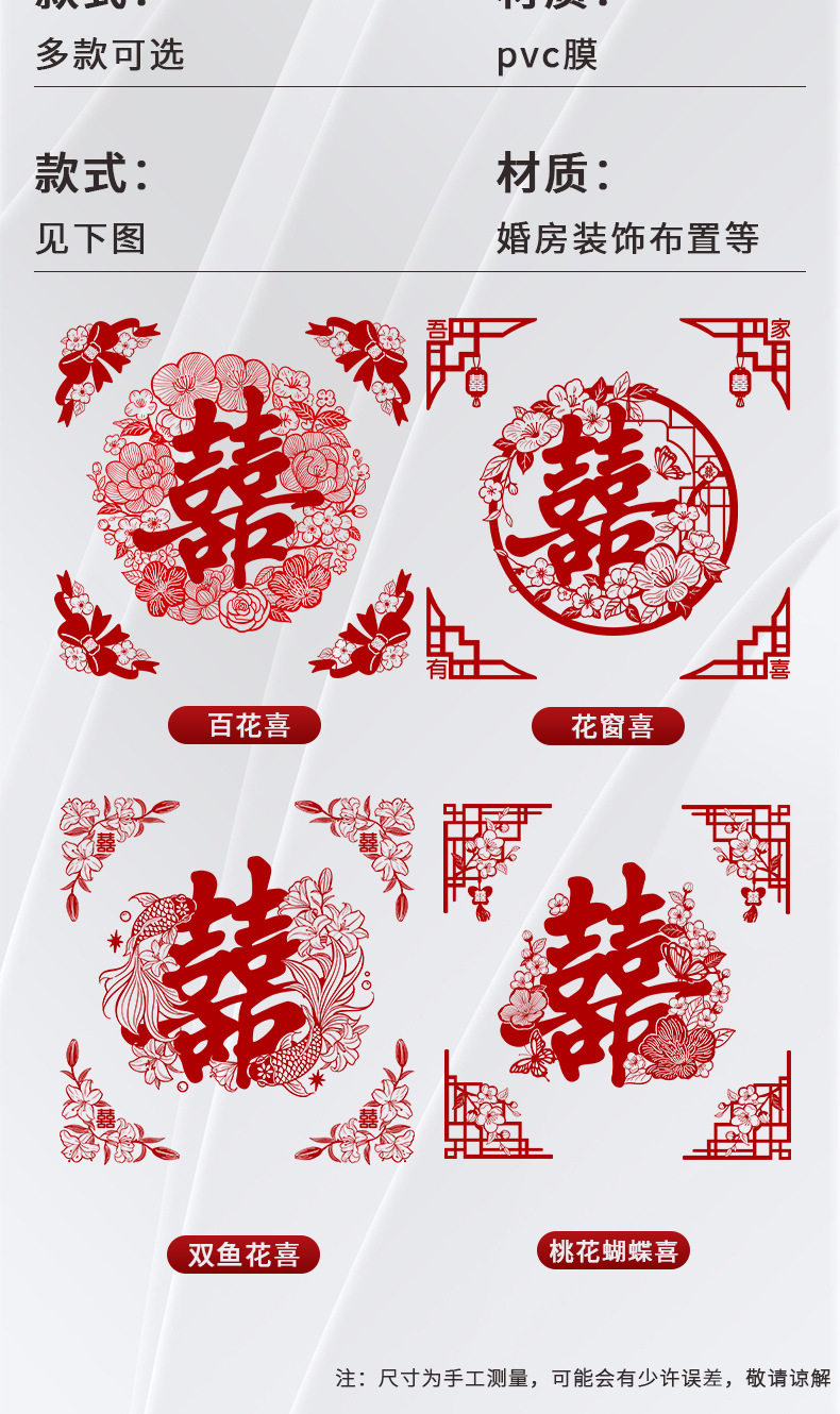 | Specification | Medium size [baihuaxi] flocking electrostatic stickers 1 set,Medium size [pisces flower joy] flocking electrostatic stickers 1 set,Medium size [huawangxi] flocking electrostatic stickers 1 set,Medium size [peach blossom butterfly joy] flocking electrostatic stickers 1 set,1 set of large [baihuaxi] flocking electrostatic stickers,Large [pisces flower joy] flocking electrostatic stickers 1 set,Large [huawangxi] flocking electrostatic stickers 1 set,Large [peach blossom butterfly joy] flocking electrostatic stickers 1 set,Medium size [hundred flowers happy + pisces flower happy] 2 sets,Medium size [flower window joy + pisces flower joy] 2 sets,Medium size [flower window joy + peach blossom butterfly joy] 2 sets,Large size [hundred flowers happy + pisces flower happy] 2 sets,Large size [flower window joy + pisces flower joy] 2 sets,Large size [flower window joy + peach blossom butterfly joy] 2 sets |