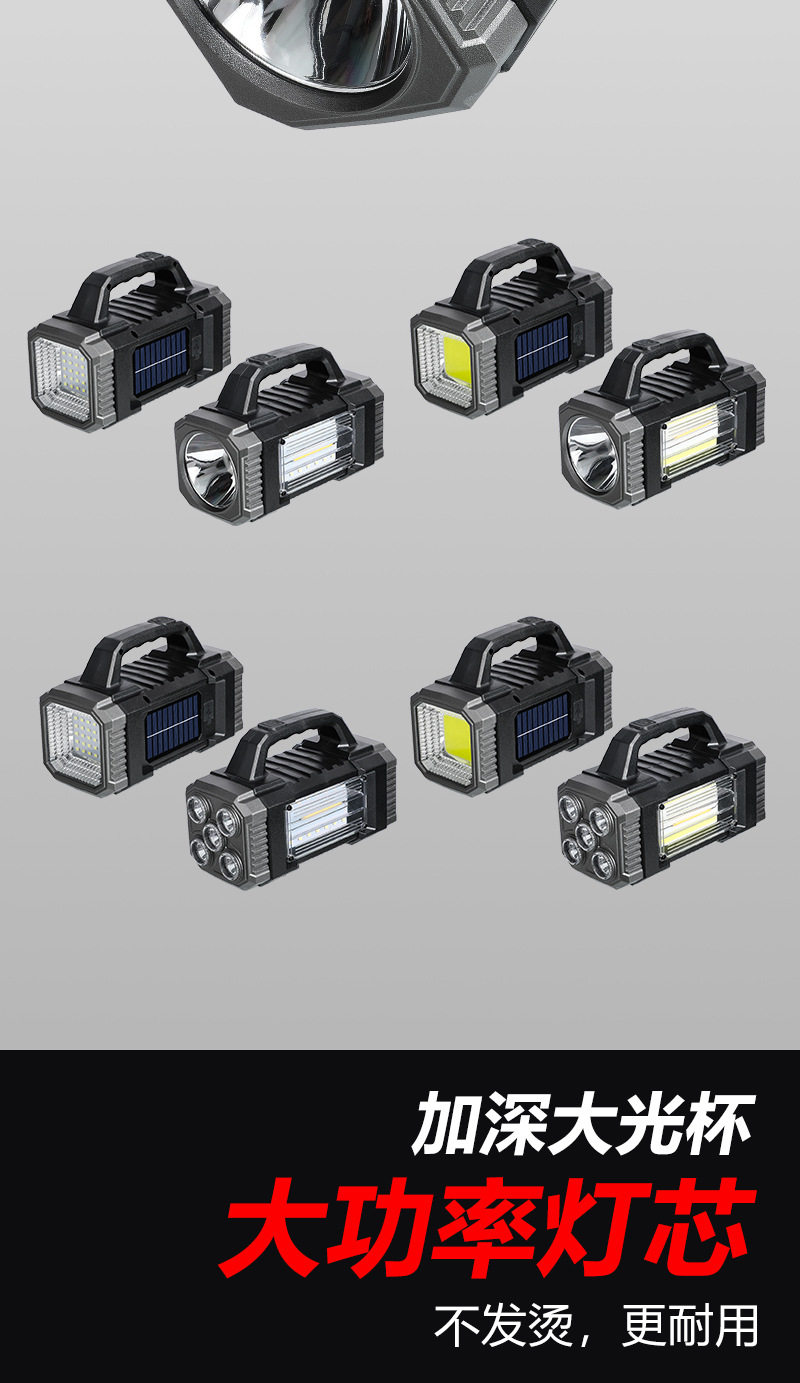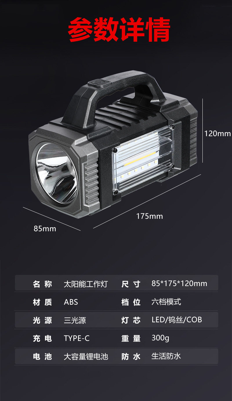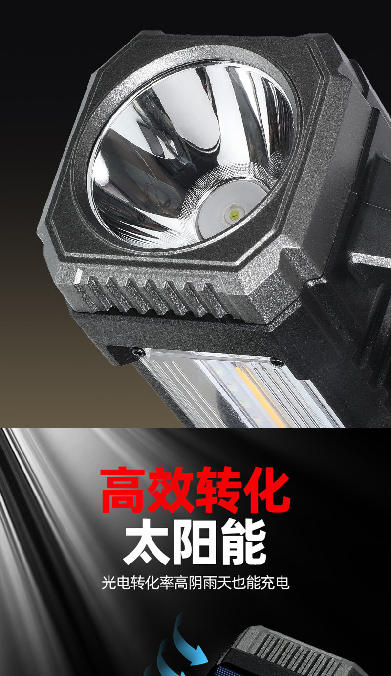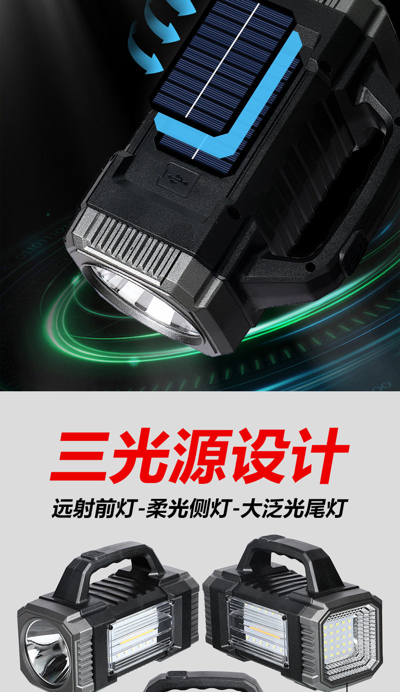 Cross-Border Solar Portable Lamp Multi-Function Three-Light Source Work Lamp Outdoor Long-Range Emergency Lighting Solar Flashlight