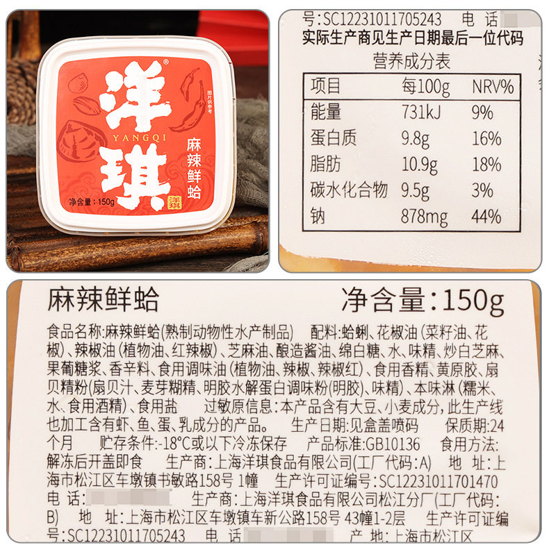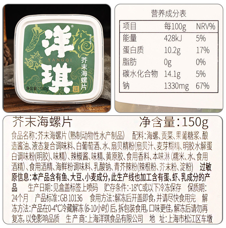 | Packaging specifications | Yangqi mustard octopus 150g,Yangqi spicy fresh clams 150g,Yangqi mustard conch slices 150g |