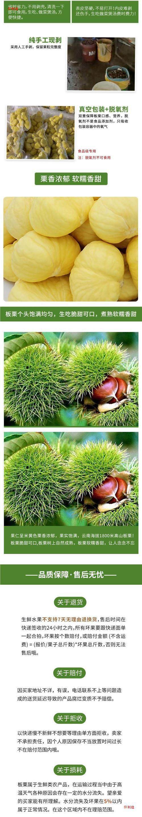 | Packaging specifications | Net weight 0.5kg fresh chestnut kernels,Net weight 1.0kg fresh chestnut kernels,Net weight 1.5kg fresh chestnut kernels,Net weight 2kg fresh chestnut kernels |