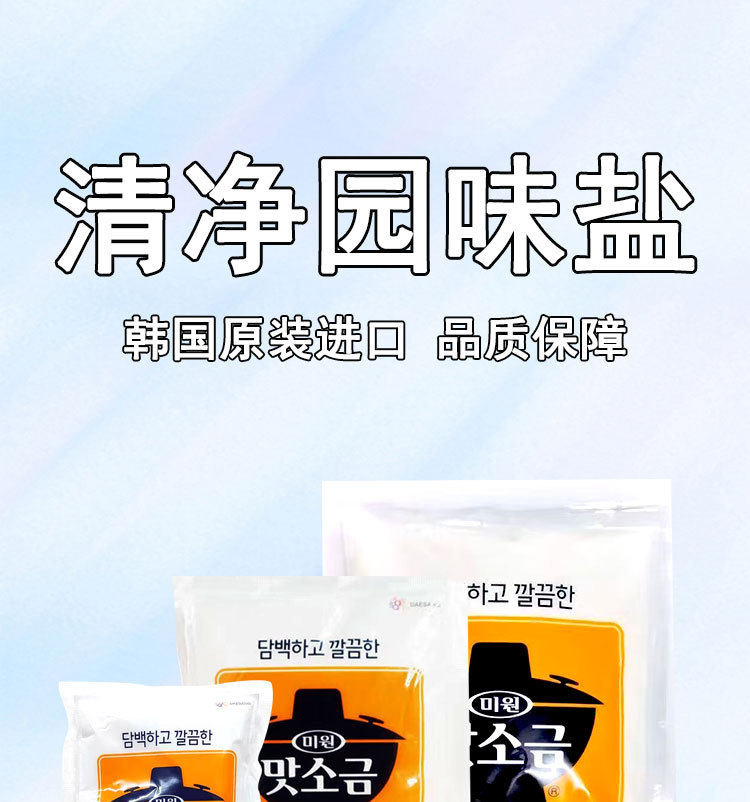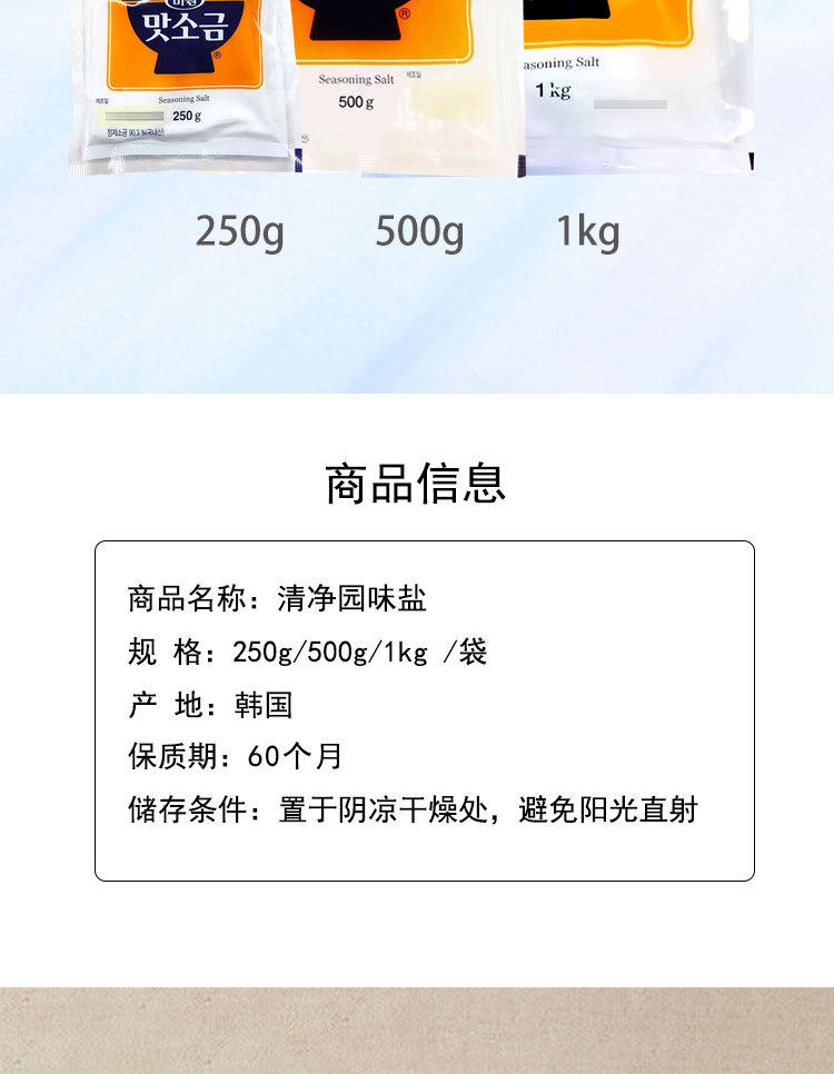 | Packaging specifications | Qingjingyuan flavor salt 250g*1 bag,Qingjingyuan flavor salt 500g*1 bag,Qingjingyuan flavor salt 1kg*1 bag |