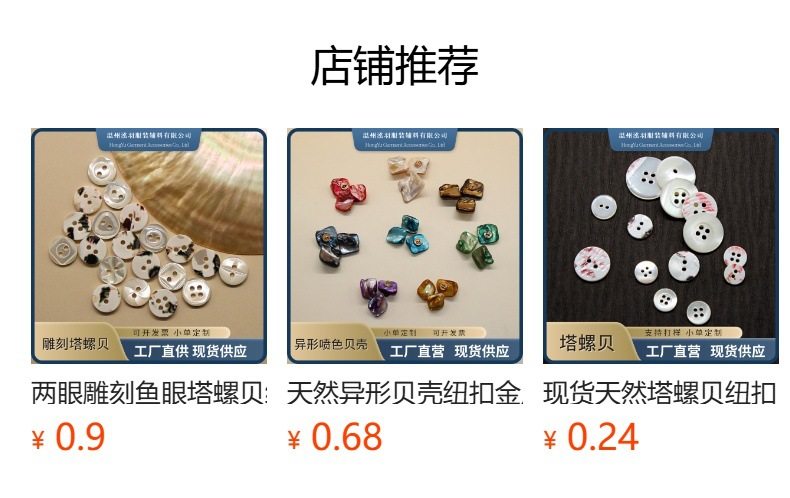 | Specifications and models | Pearl oyster^18l=11.5mm,White snail shell^16l=10mm,White tower snail shell^18l=11.5mm,White tower snail shell^28l=18.0mm,Original color tower snail shell^16l=10mm,Original color tower snail shell^18l=11.5mm,Original color tower snail shell^28l=18.0mm,Baked gray tower snails^18l=11.5mm,Baked gray tower snails^28l=18.0mm,White oval snail shell^14mm*9mm |