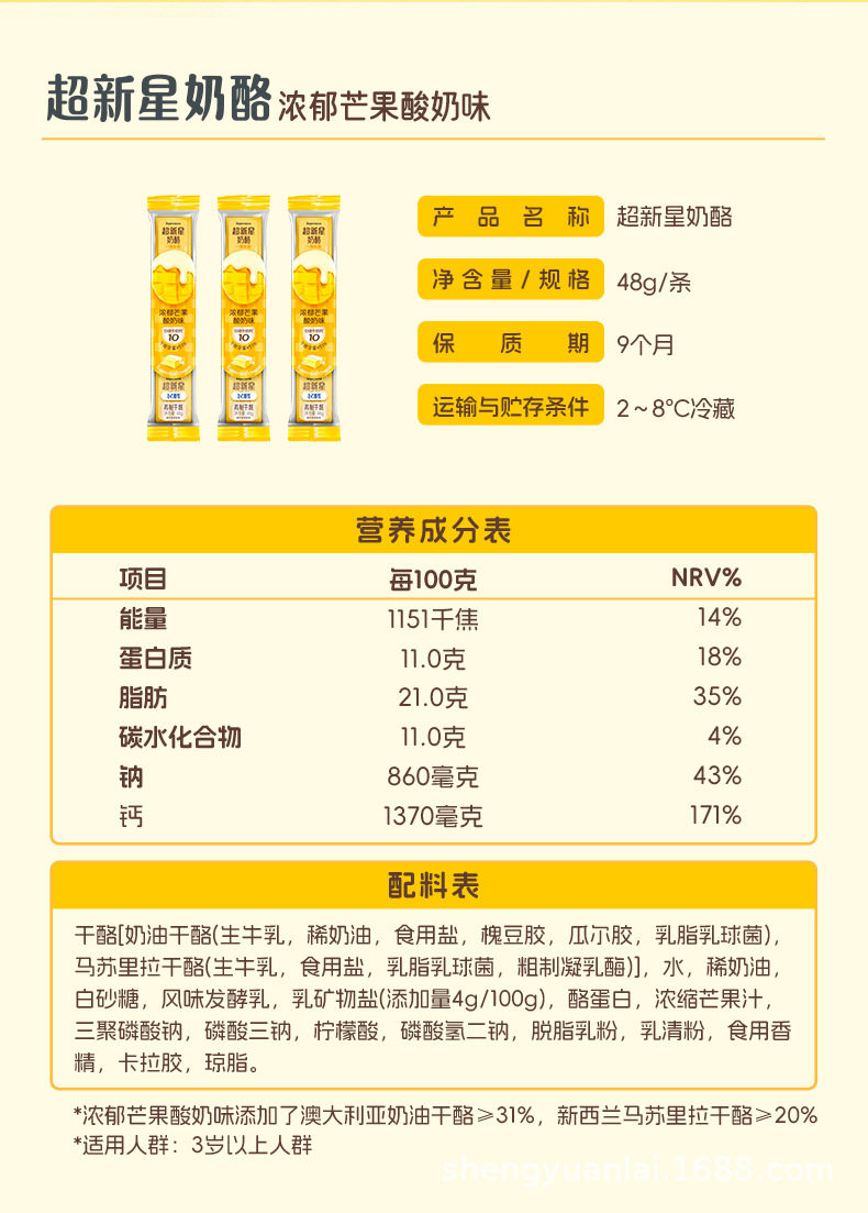 | Packaging specifications | Mango flavored cheese 48g*2,Mango flavored cheese 48g*3,Mango flavored cheese 48g*5,Mango flavored cheese 48g*10,Lime flavored cheese 48g*2,Lime flavored cheese 48g*3,Lime flavored cheese 48g*5,Lime flavored cheese 48g*10,Mango flavored cheese 48g*1,Lime flavored cheese 48g*1 |