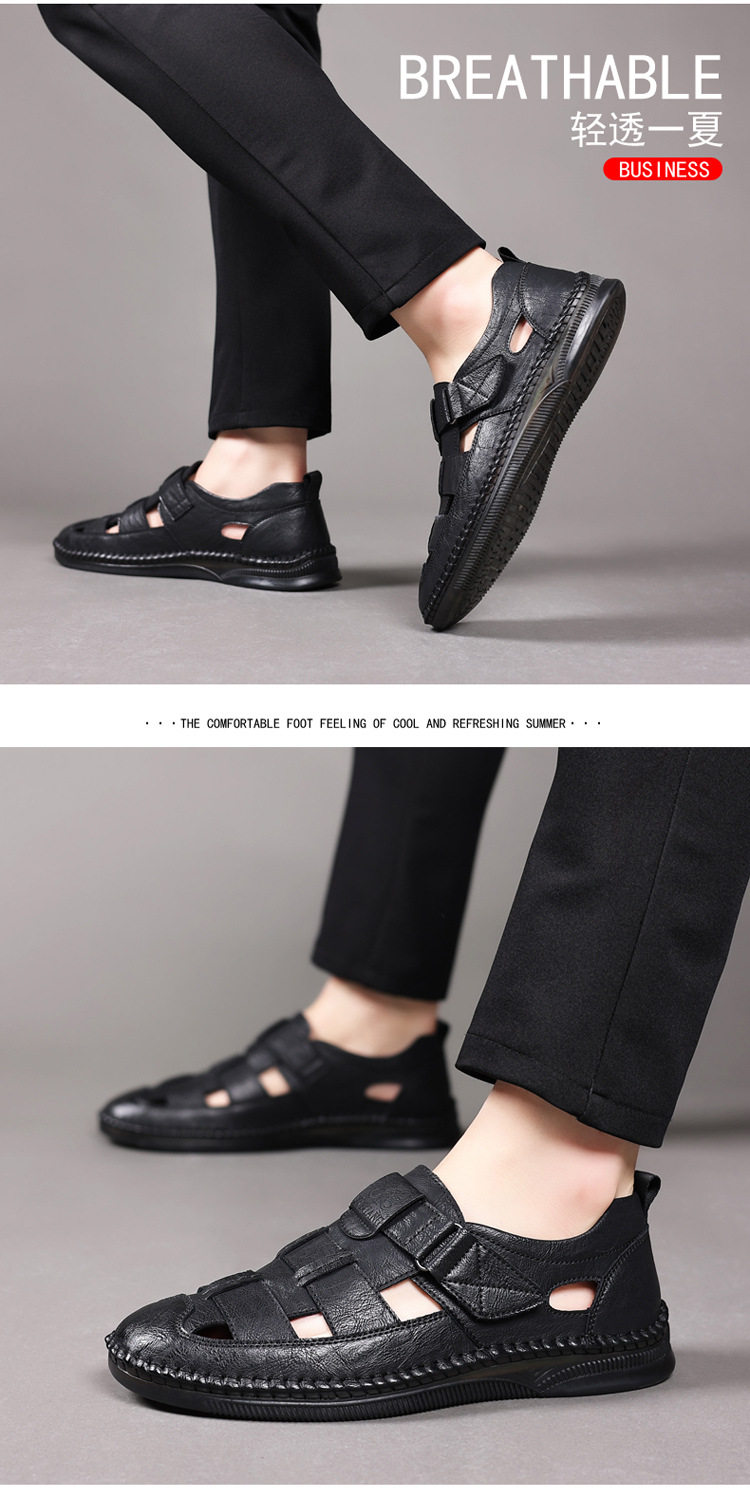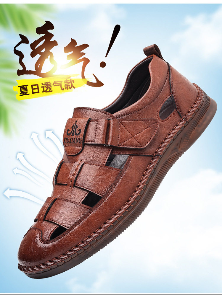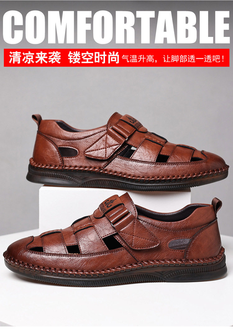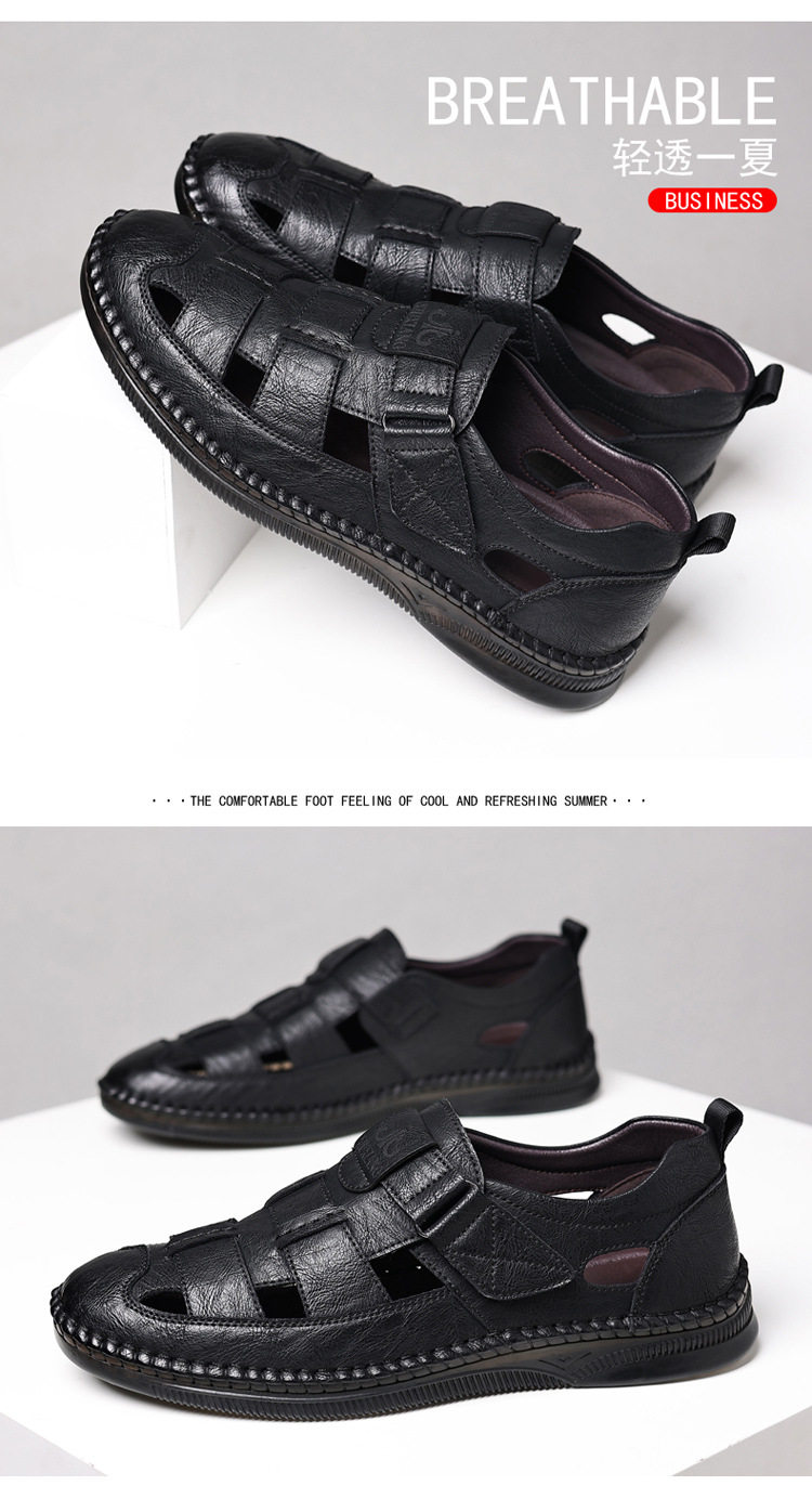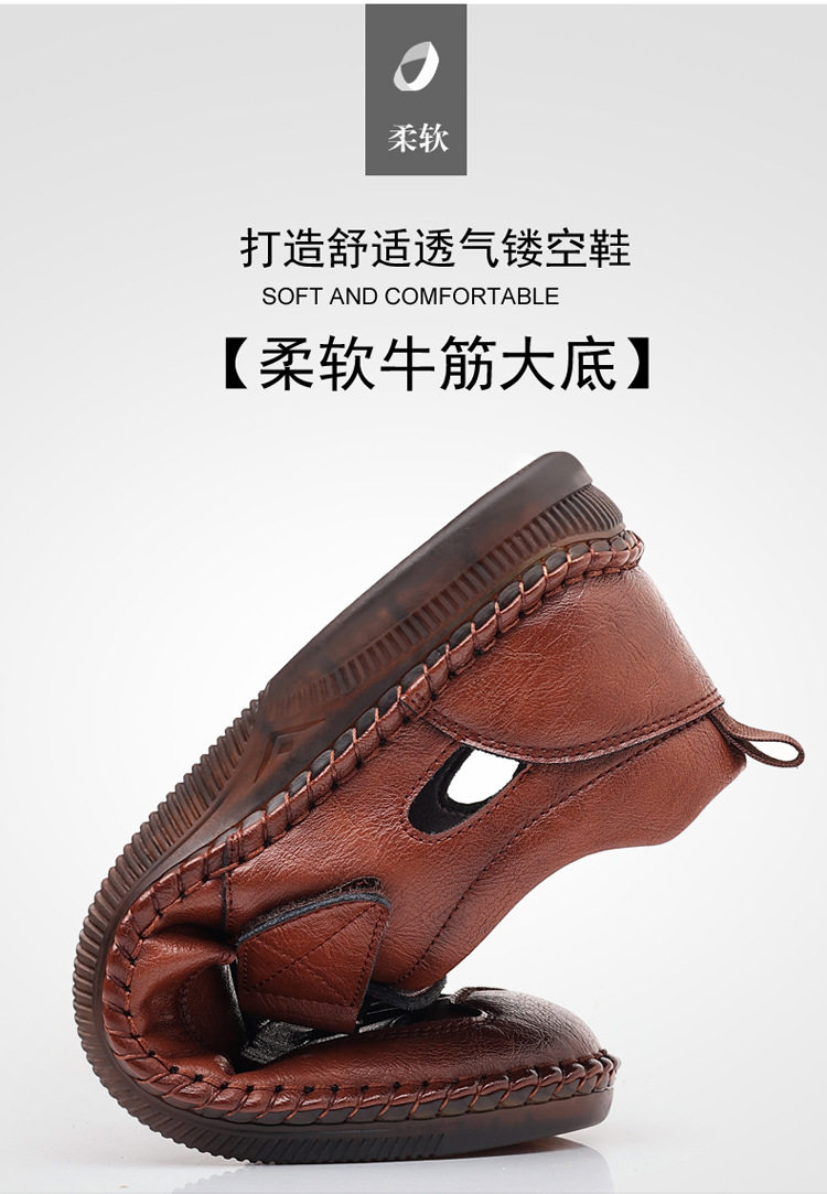 Summer Genuine Leather Hollow Sandals Velcro Hole Shoes Breathable Casual Men's Shoes Soft Sole Dad's Sandals Men's plus size