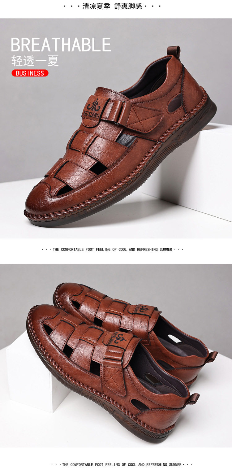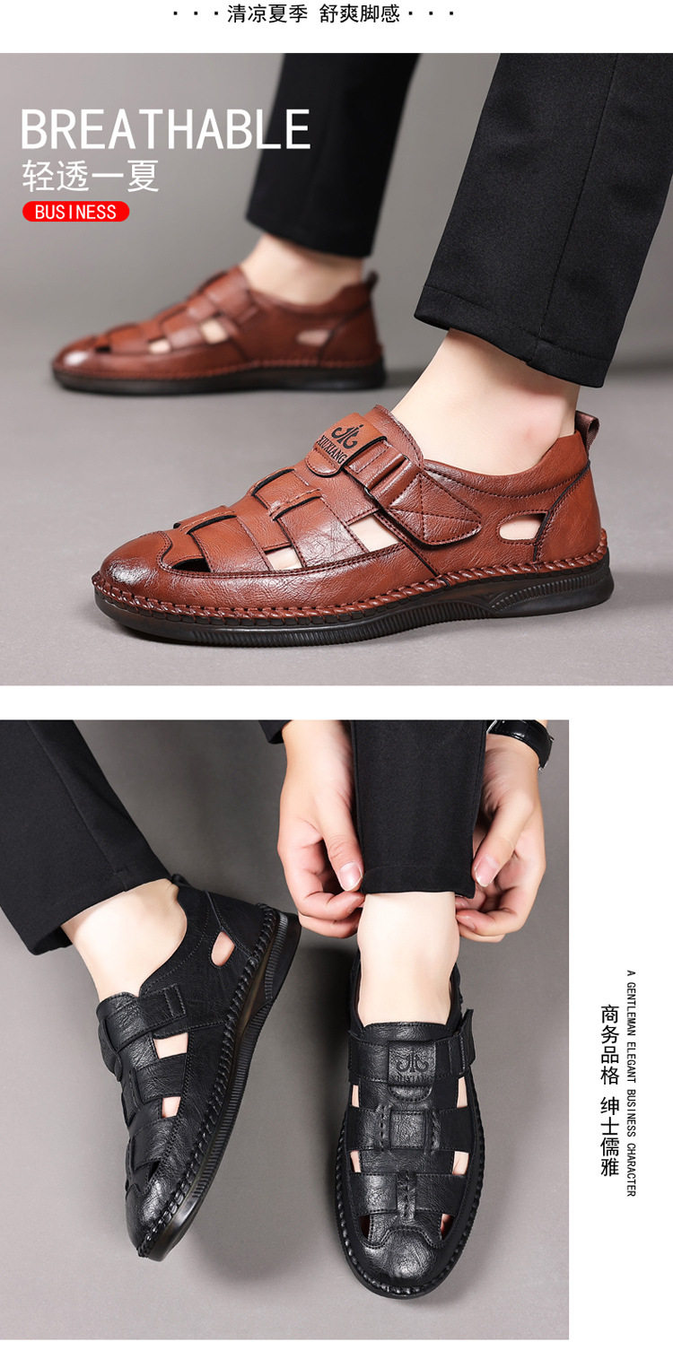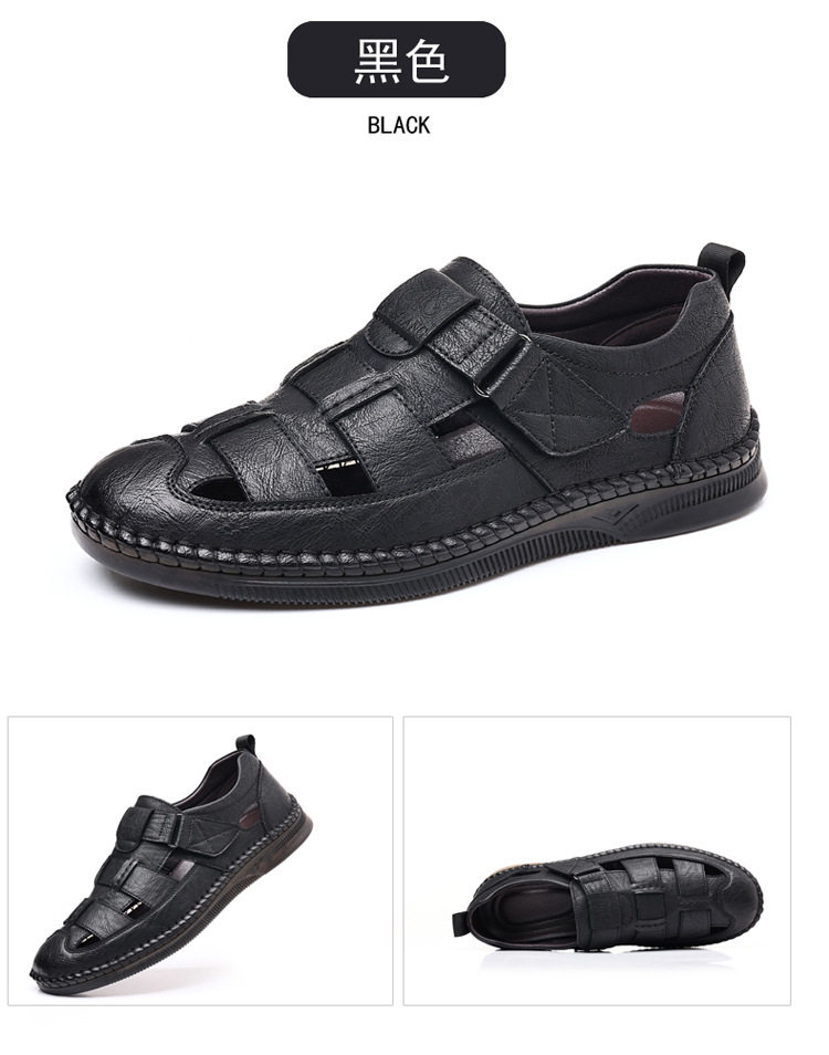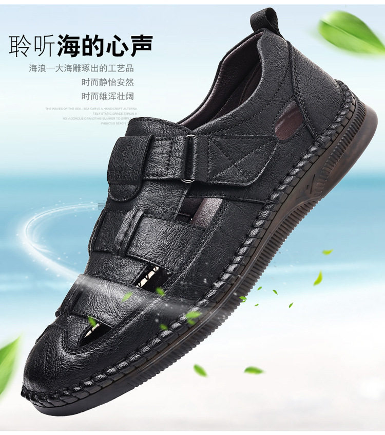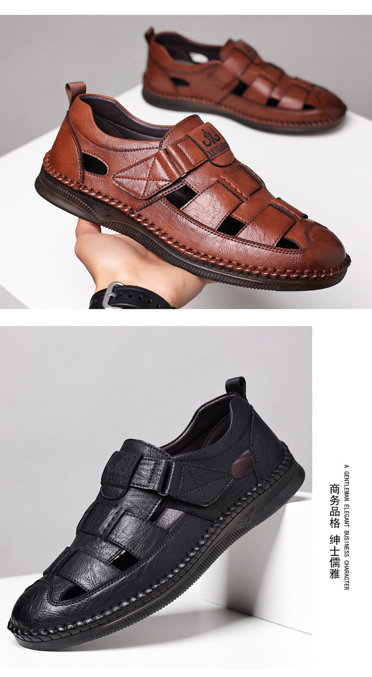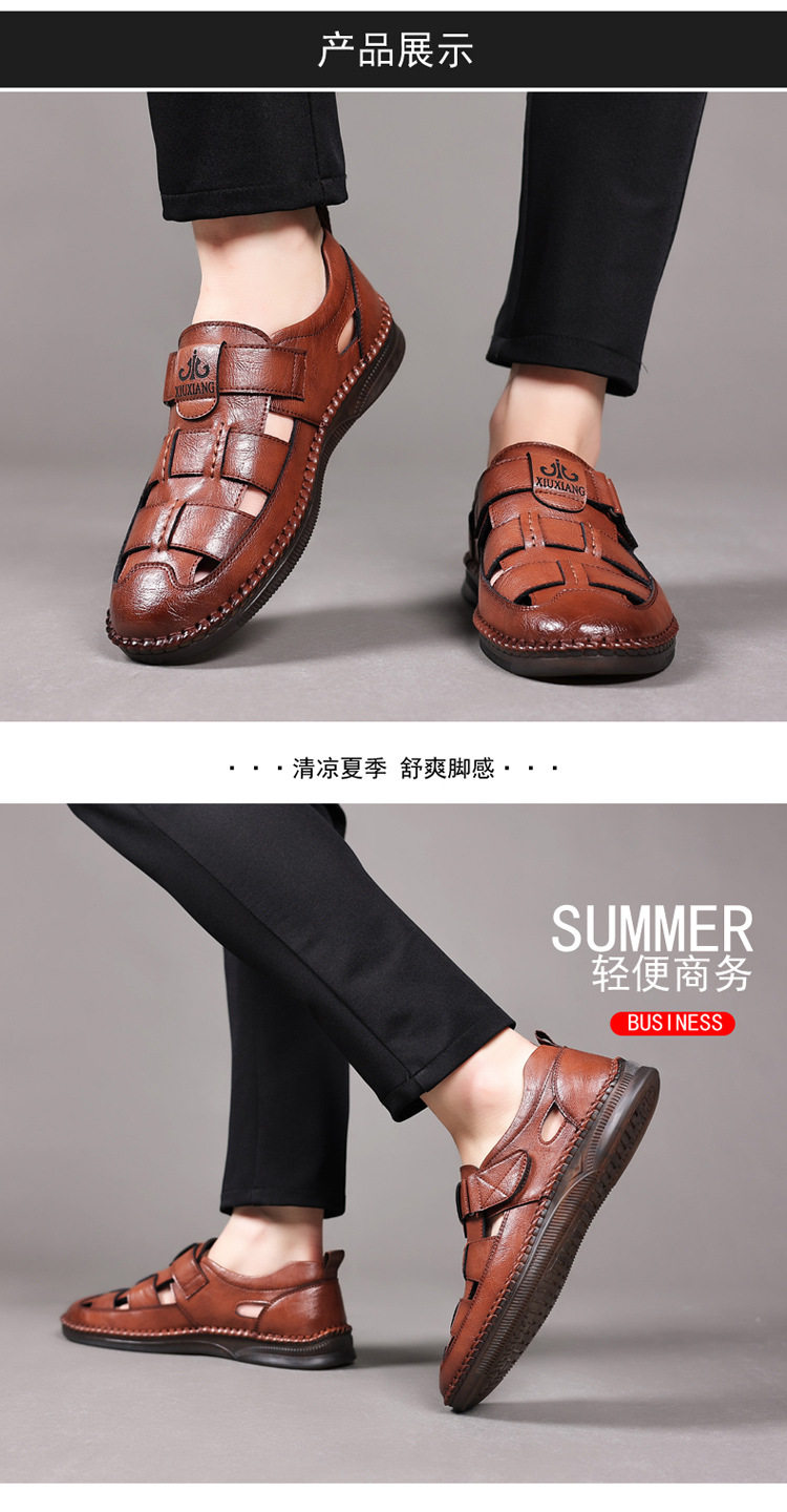 Summer Genuine Leather Hollow Sandals Velcro Hole Shoes Breathable Casual Men's Shoes Soft Sole Dad's Sandals Men's plus size