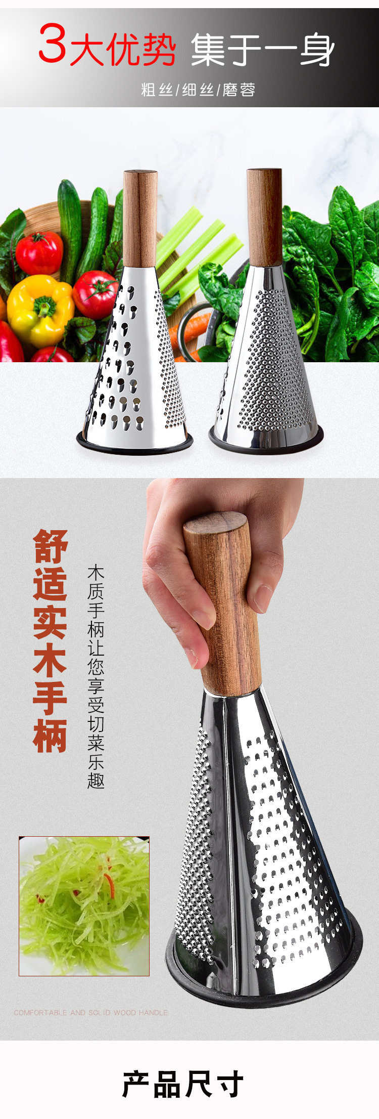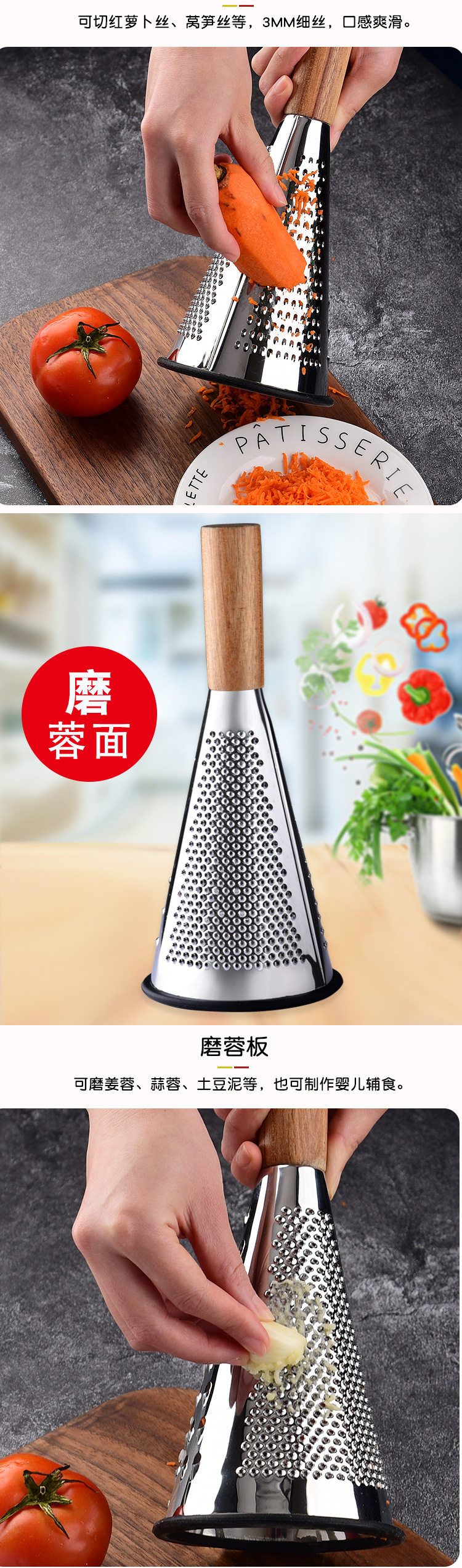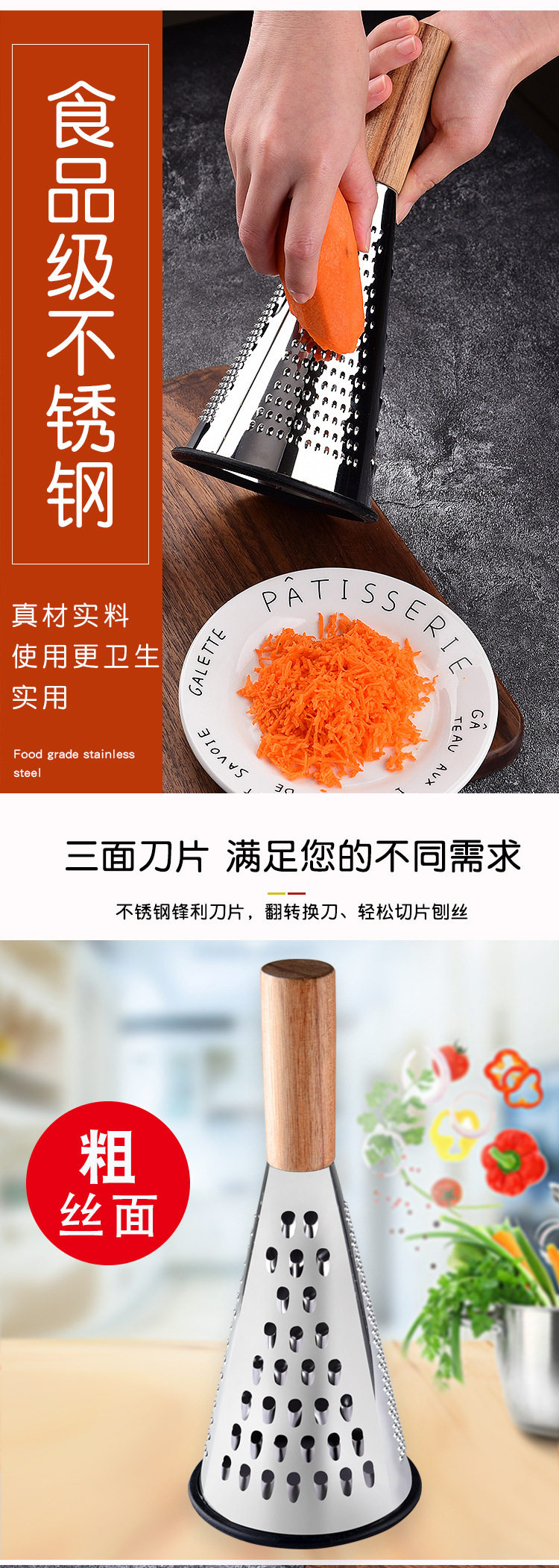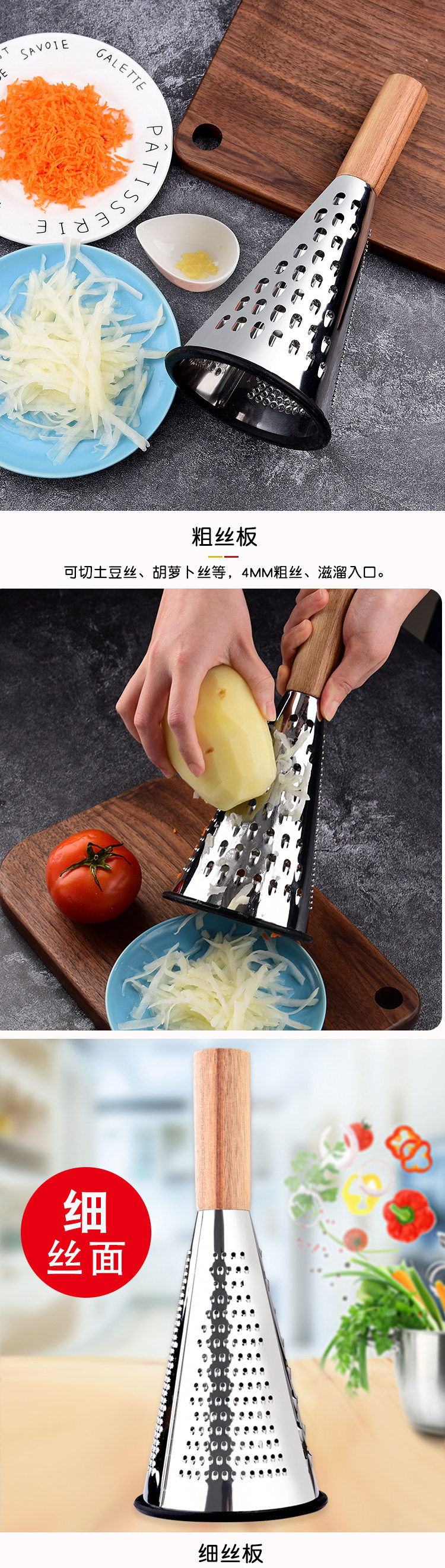 New Vertical Stainless Steel Cone Planer Three-Sided Cheese Cheese Grater Grater Fruit and Vegetable Wooden Handle Planer