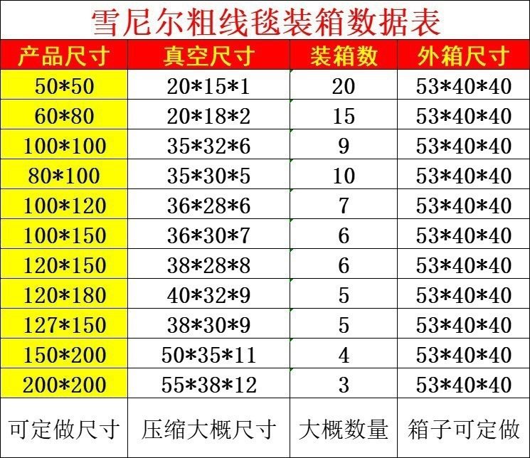| Dimensions | Machine washable 50x50cm - about 0.25kg,Machine washable 60x60cm - about 0.4kg,Machine washable 60x80cm - about 0.5kg,Machine washable 80x100cm - about 0.8kg,Machine washable 100x100cm - about 1kg,Machine washable 100x120cm - about 1.1kg,Machine washable 100x150cm - about 1.3kg,Machine washable 120x150cm - about 1.8kg,Machine washable 127x152cm - about 1.8kg,Machine washable 100x200cm - about 1.9kg,Machine washable 120x180cm - about 2kg,Machine washable 130x170cm - about 2.1kg,Machine washable 150x150cm - about 2kg,Machine washable 150x180cm - about 2.5kg,Machine washable 180x200cm - about 3.5kg,Machine washable 200x200cm - about 4.2kg,Machine washable 150x200cm - about 2.7kg |