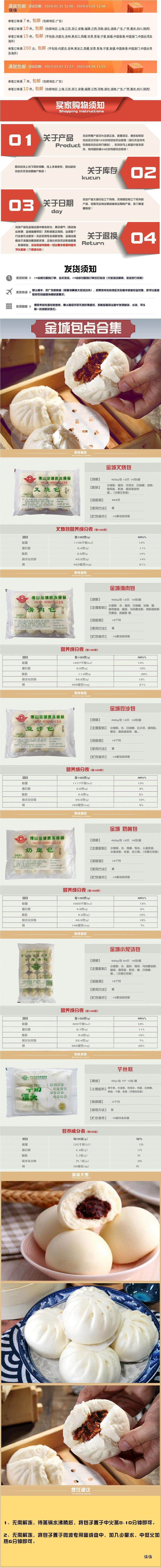 | Packaging specifications | [pack of 12] jincheng mushroom vegetarian buns 480g,[pack of 12] jincheng lotus paste buns 480g,【pack of 24】jincheng xiaolong soup dumplings 480g,[pack of 6] jincheng flower roll 240g,[pack of 4] jincheng barbecued pork meal pack 280g,[pack of 9] jincheng steamed buns 180g,[pack of 9] jincheng mala zhan 270g,[pack of 6] jincheng egg yolk quicksand buns 480g,[pack of 9] jincheng beef buns 315g,[pack of 9] jincheng barbecued pork buns 315g,[pack of 9] jincheng glutinous rice roll 360g,[pack of 9] jincheng bean paste buns 315g,[pack of 9] jincheng custard buns 360g,[pack of 9] jincheng pork buns 315g,[pack of 9] jincheng milk steamed buns 405g |
