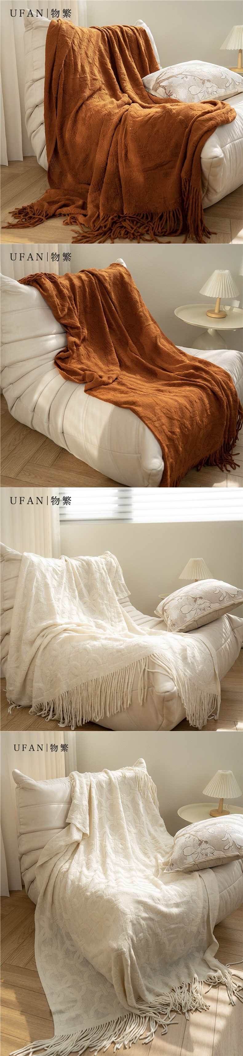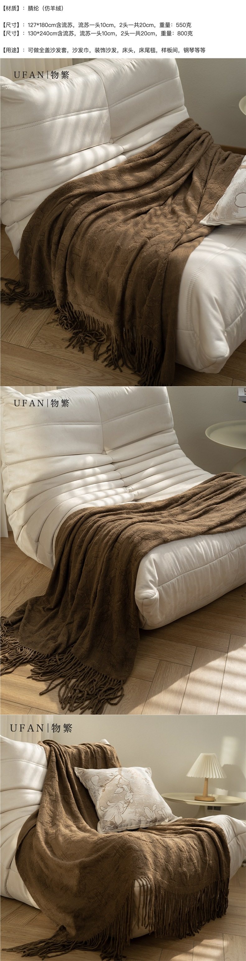 | Dimensions | About 130x180cm (including tassels) 550g,About 130x240cm (including tassels) 800g,About 65x240cm (suitable for double bed and bed end blanket) |