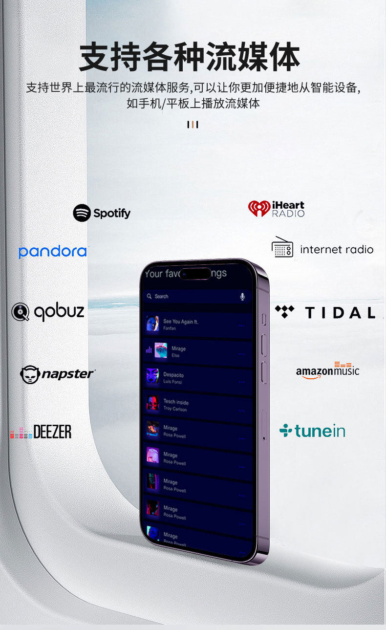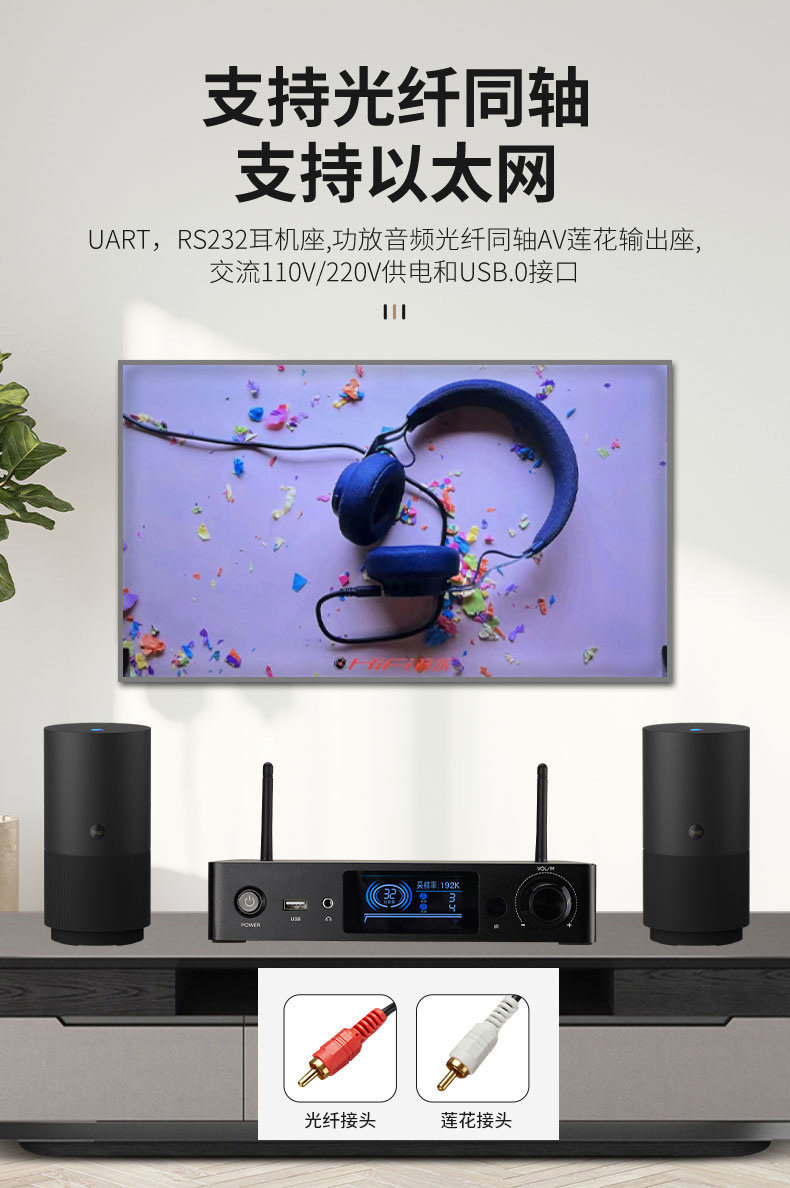 | Receiving method | Wifi, wired network, bluetooth, aux, fiber optic |