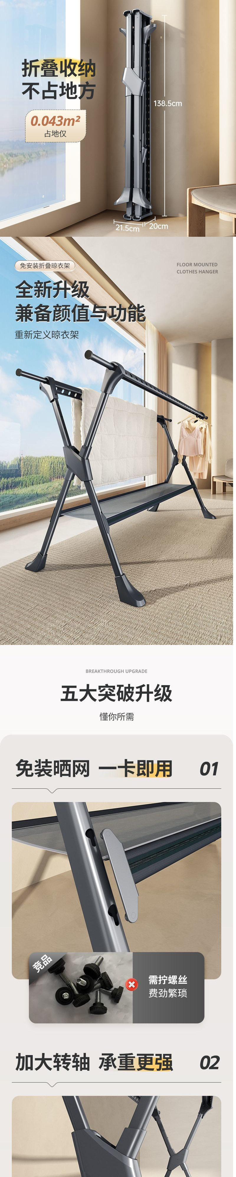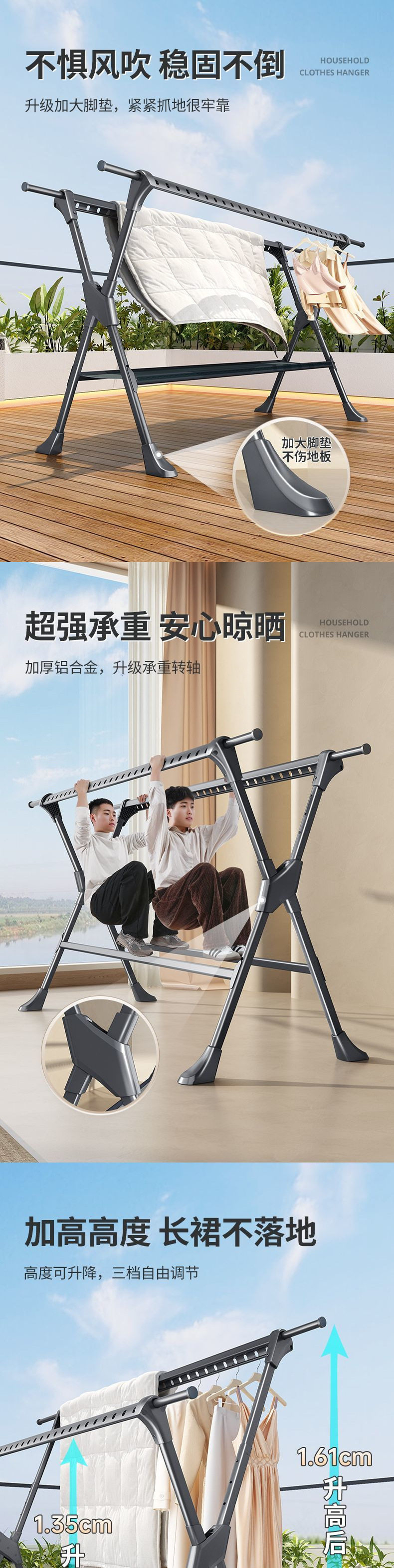 Retractable Floor-Standing Clothes Drying Rack with Double Poles, Windproof and Thickened Aluminum Alloy Balcony Quilt Drying Artifact