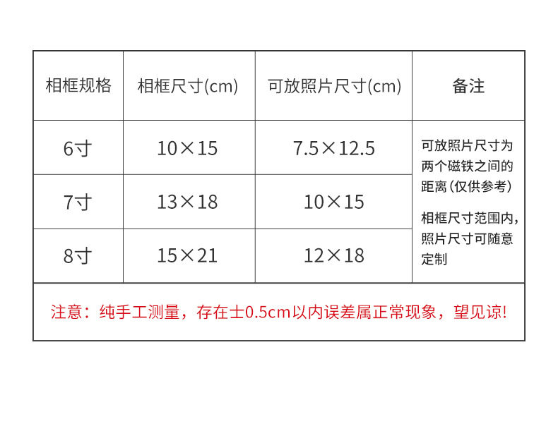 | Frame size | 6inch (inner diameter 10.2*15.2),7inch (inner diameter 12.7*17.8),8inch (inner diameter 15.2*20.3) |