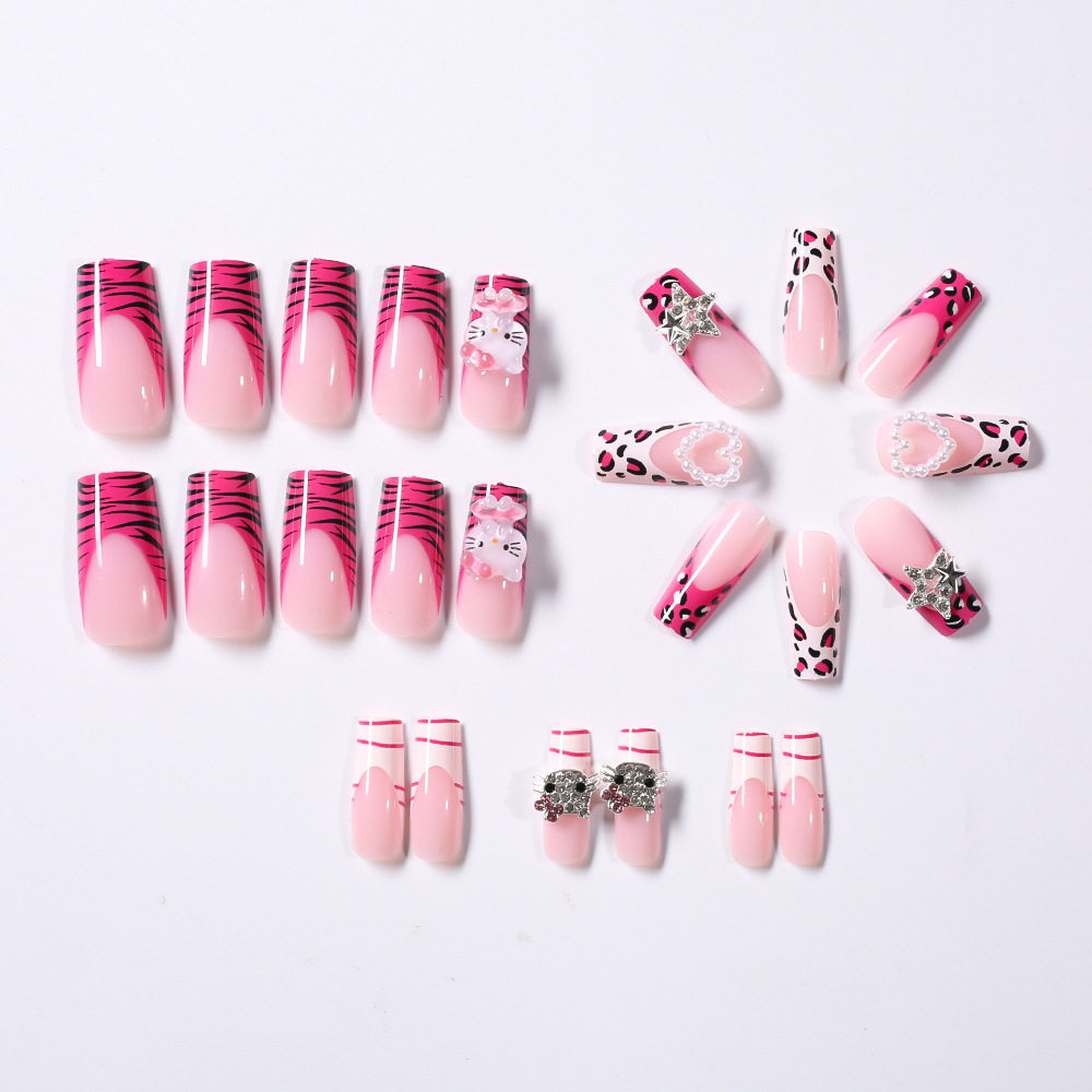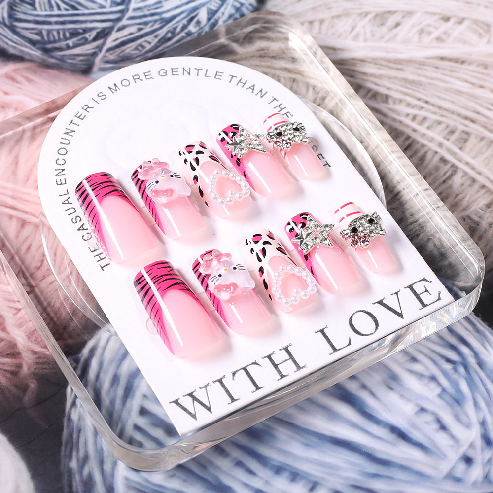 Xiaohongshu's Popular 24-Piece Kt Cat French Manicure Nail Tips, Handmade Wearable Nails, Girl's Wearable Nail Stickers