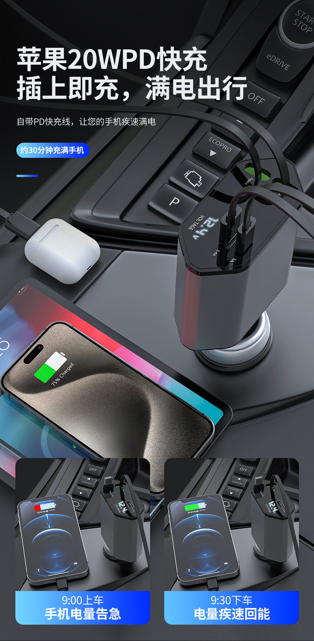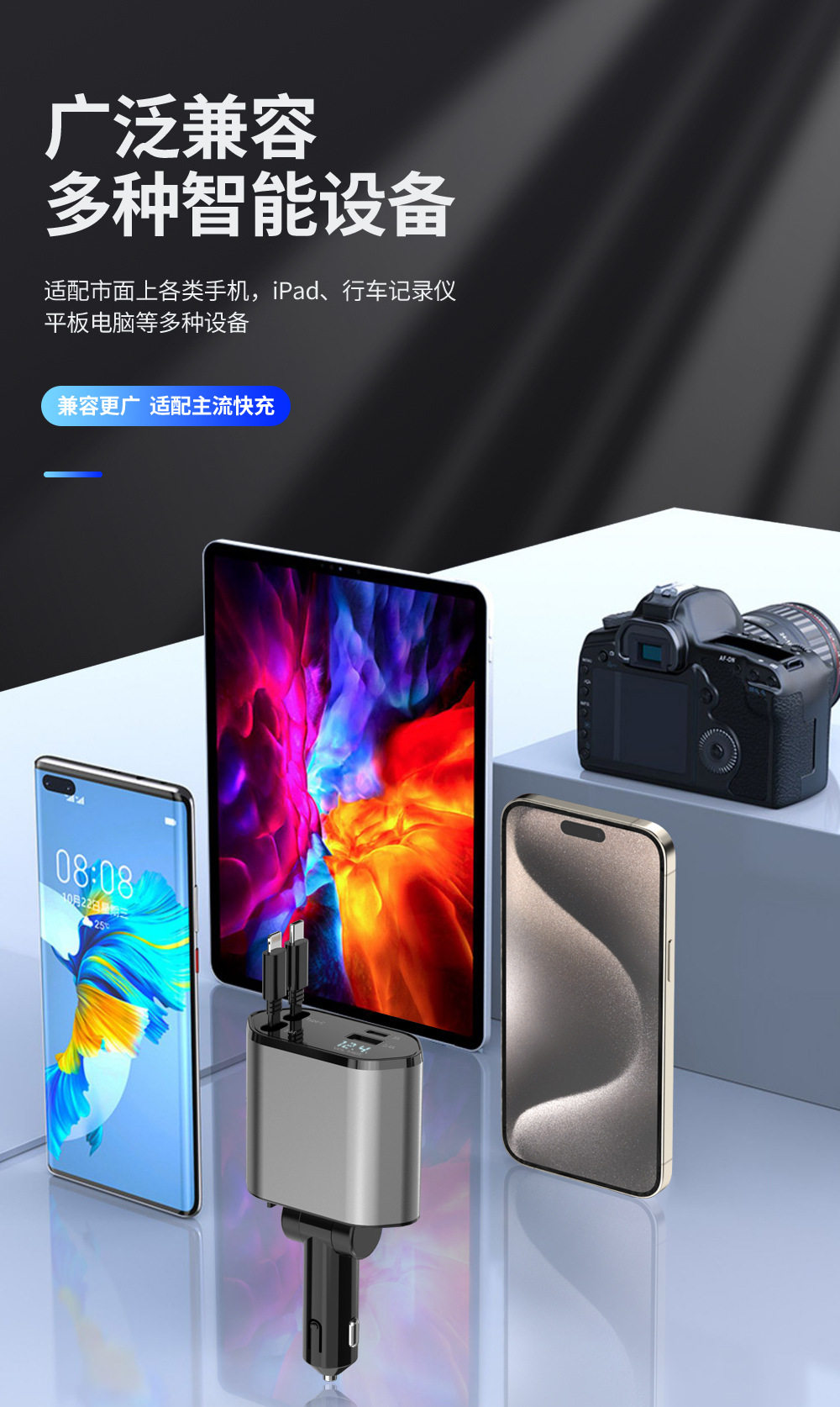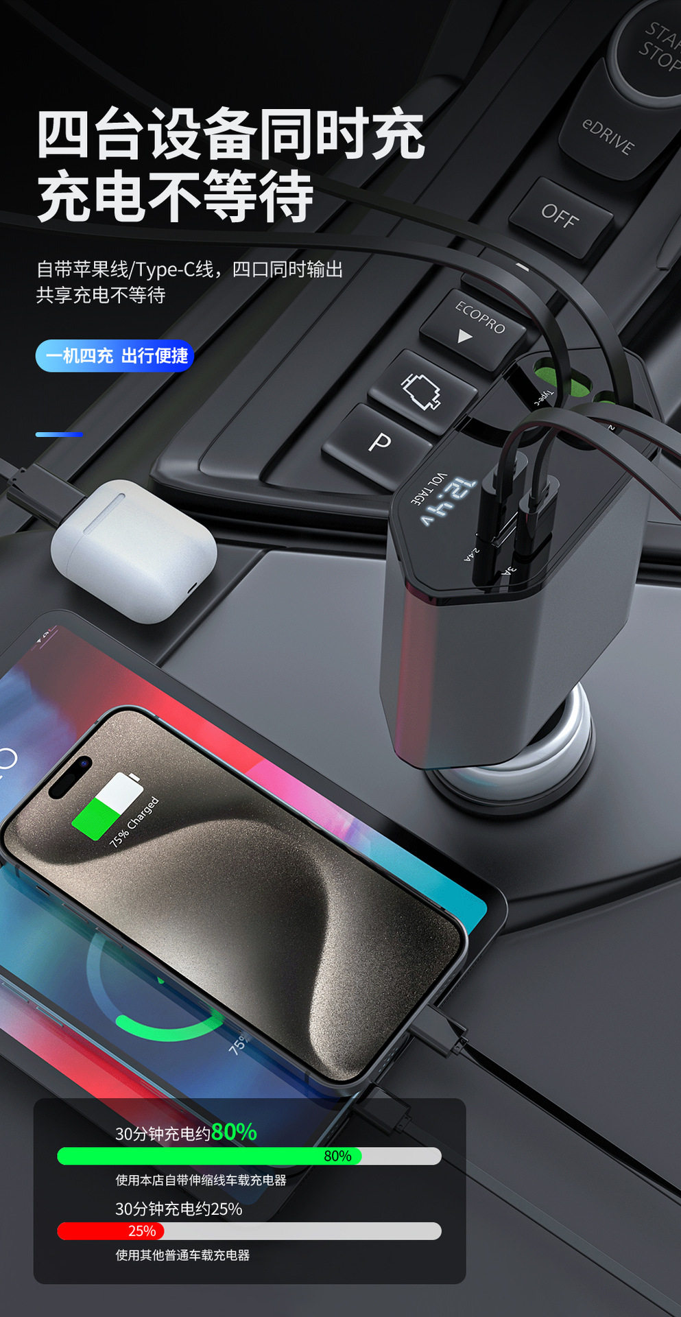 Four-in-one car charger super fast charger car cigarette lighter conversion socket for Apple 16 Huawei mobile phone