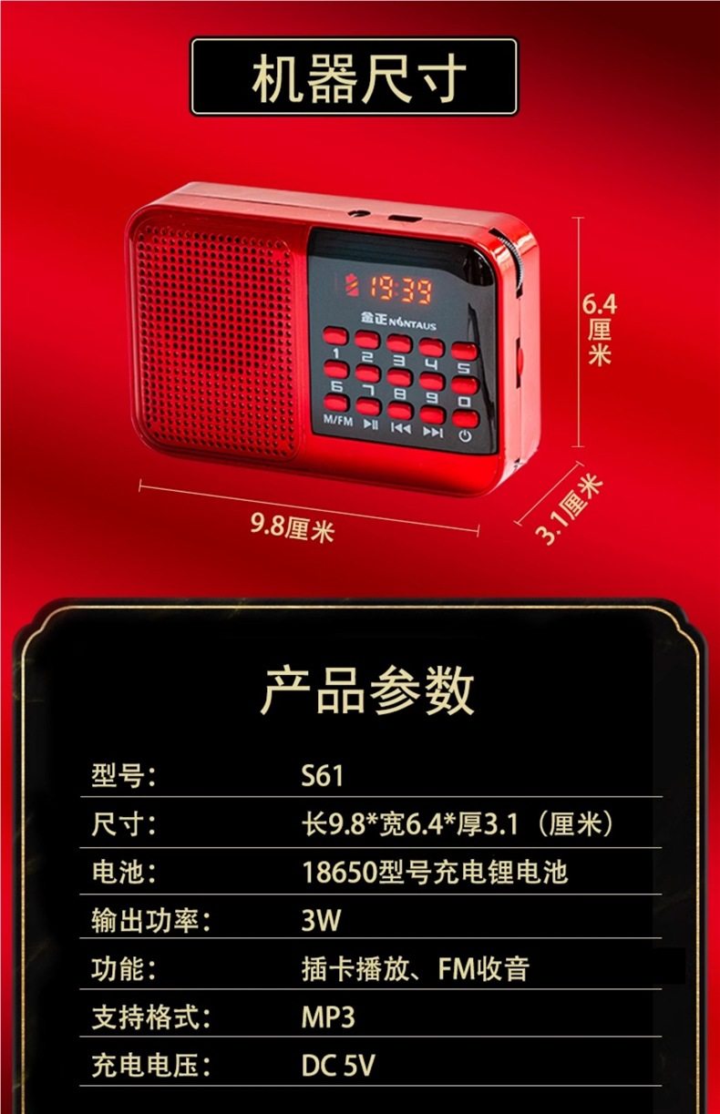 | Color | Red standard configuration [host + 18650 rechargeable battery + charging cable] no memory,Red standard + 258 song cards 512 megabytes,Red standard + 1234 classic red songs and folk songs 8g,Red standard + 3699 comprehensive content cards 16g,Red standard +9999 collection of storytelling cards 32g,Red standard + 2876 children's cards 16g,Red standard + 3207 pieces of cross talk, sketch, and storytelling cards 16g,Red standard + 6789 pure song cards 32g,Red standard +2099 pure opera card 16g,Red standard +668 popular square dance 16g,Red standard + empty card without content 8g + card reader 8g,Red standard + spare battery + special charger, no memory,Red standard + tai chi aerobics chant music + catalog 115 songs |