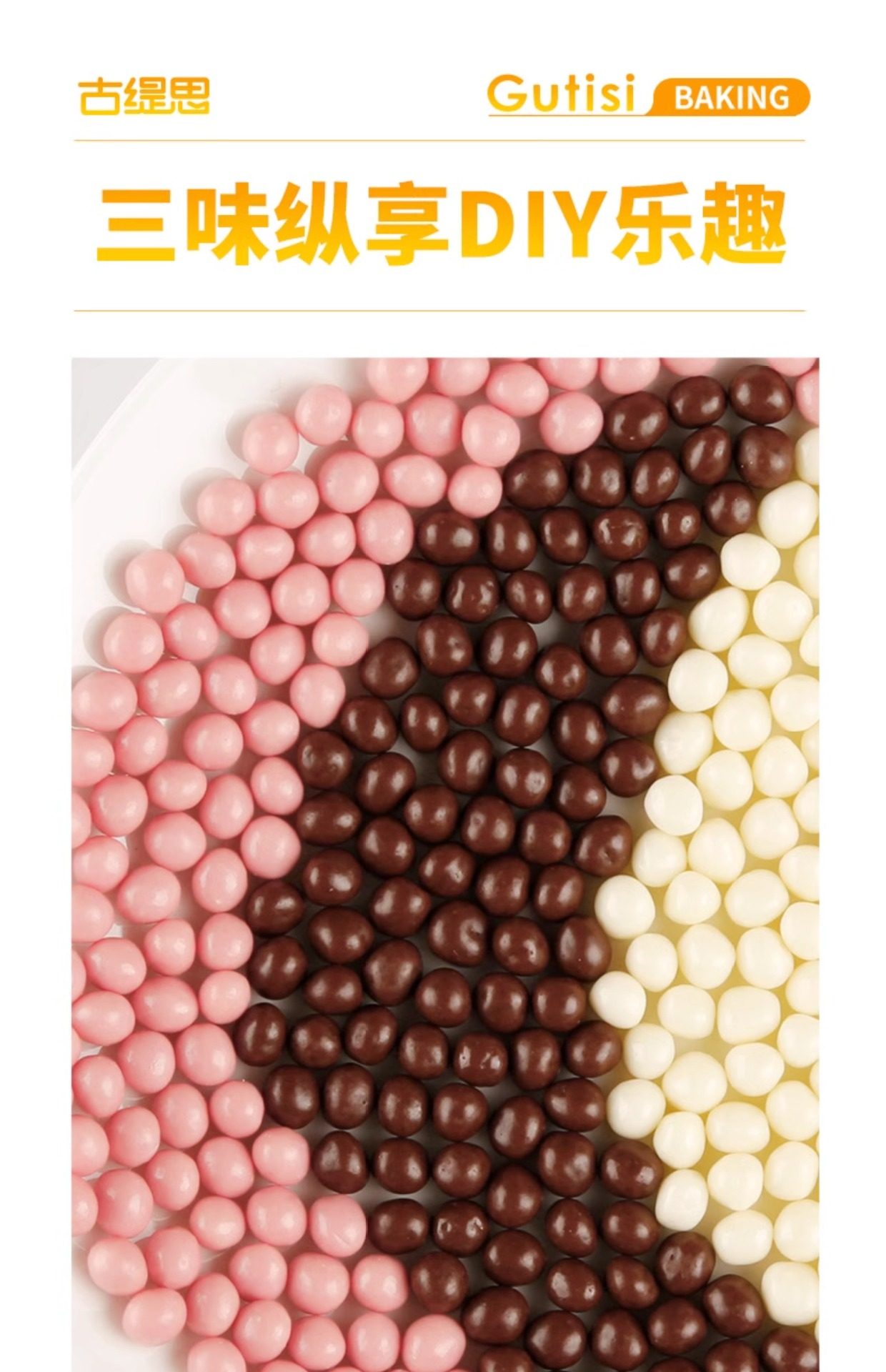 | Packaging specifications | Dark chocolate crispy beads 250g*4 bags,White chocolate crisp beads 250g*4 bags,Strawberry flavored chocolate crisp beads 250g*4 bags,Cranberry red chocolate crisp beads 250g*4 bags,Black crispy beads 250g*2 bags + white crispy beads 250g*2 bags,Strawberry crisp beads 250g*2 bags + black crisp beads 250g*2 bags,Strawberry crisp beads 250g*2 bags + white crisp beads 250g*2 bags |