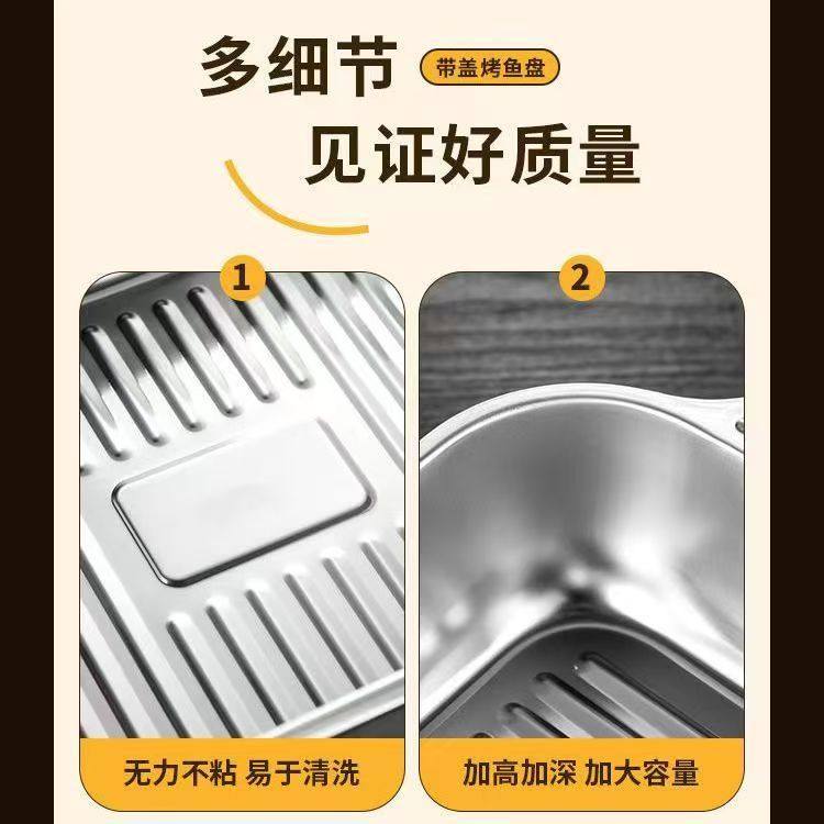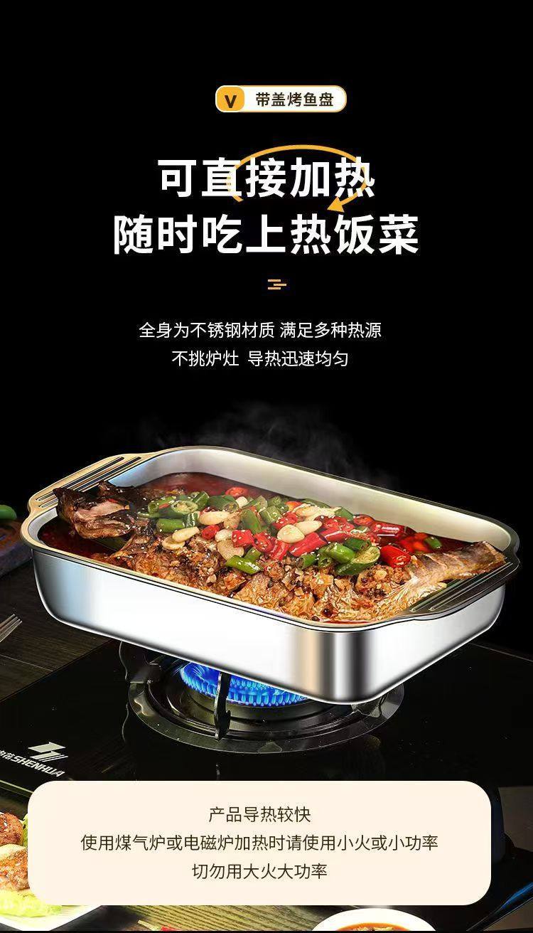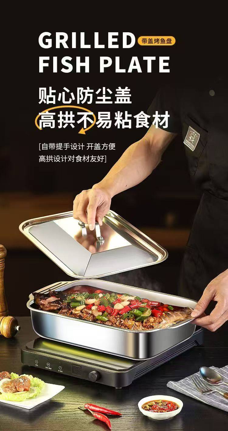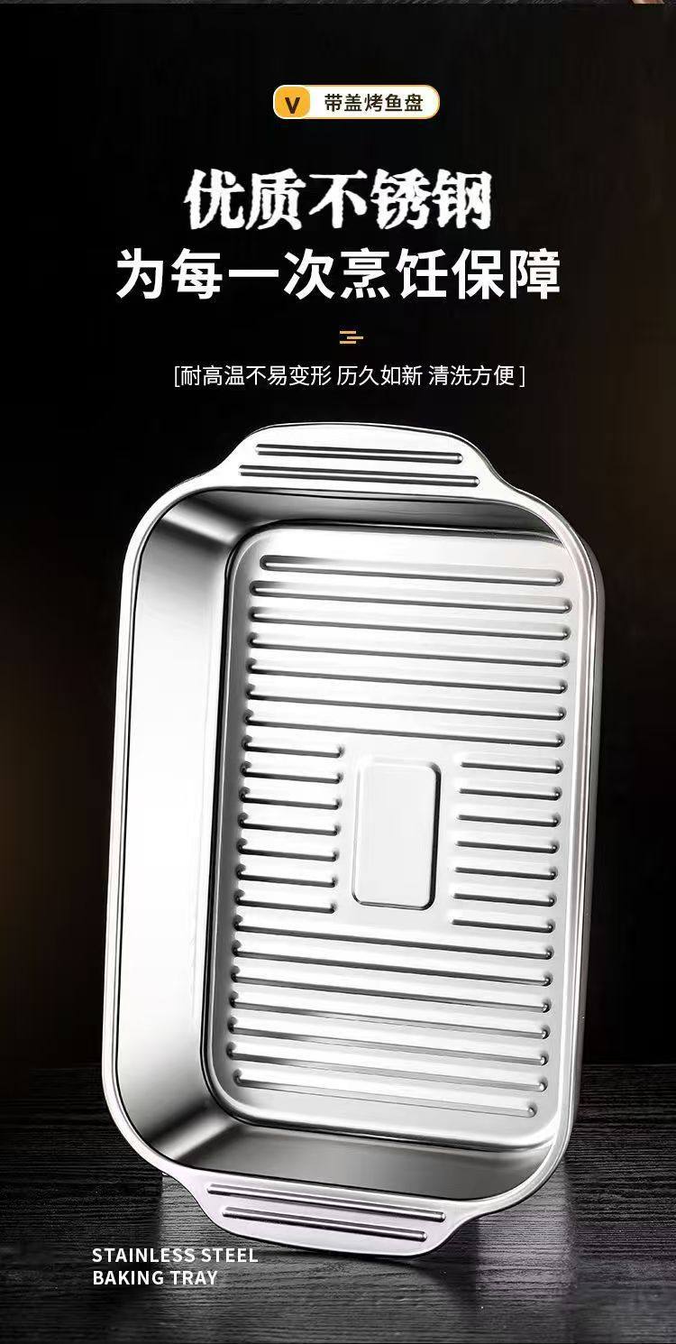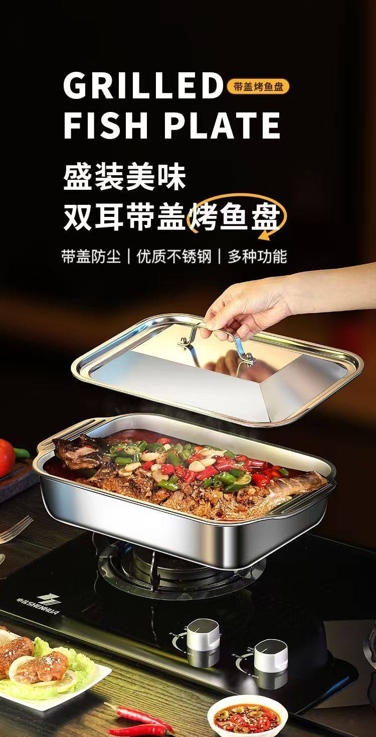 Stainless Steel Baked Fish Plate with Lid Rectangular Household Korean-style Square Plate Cake Plate Deepened Binaural Fish Plate Crayfish Plate