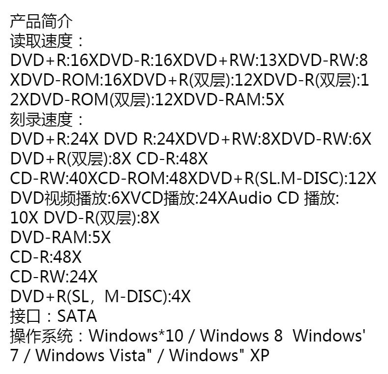 | Writing speed | DVD-R:24X;CD-R:48X |