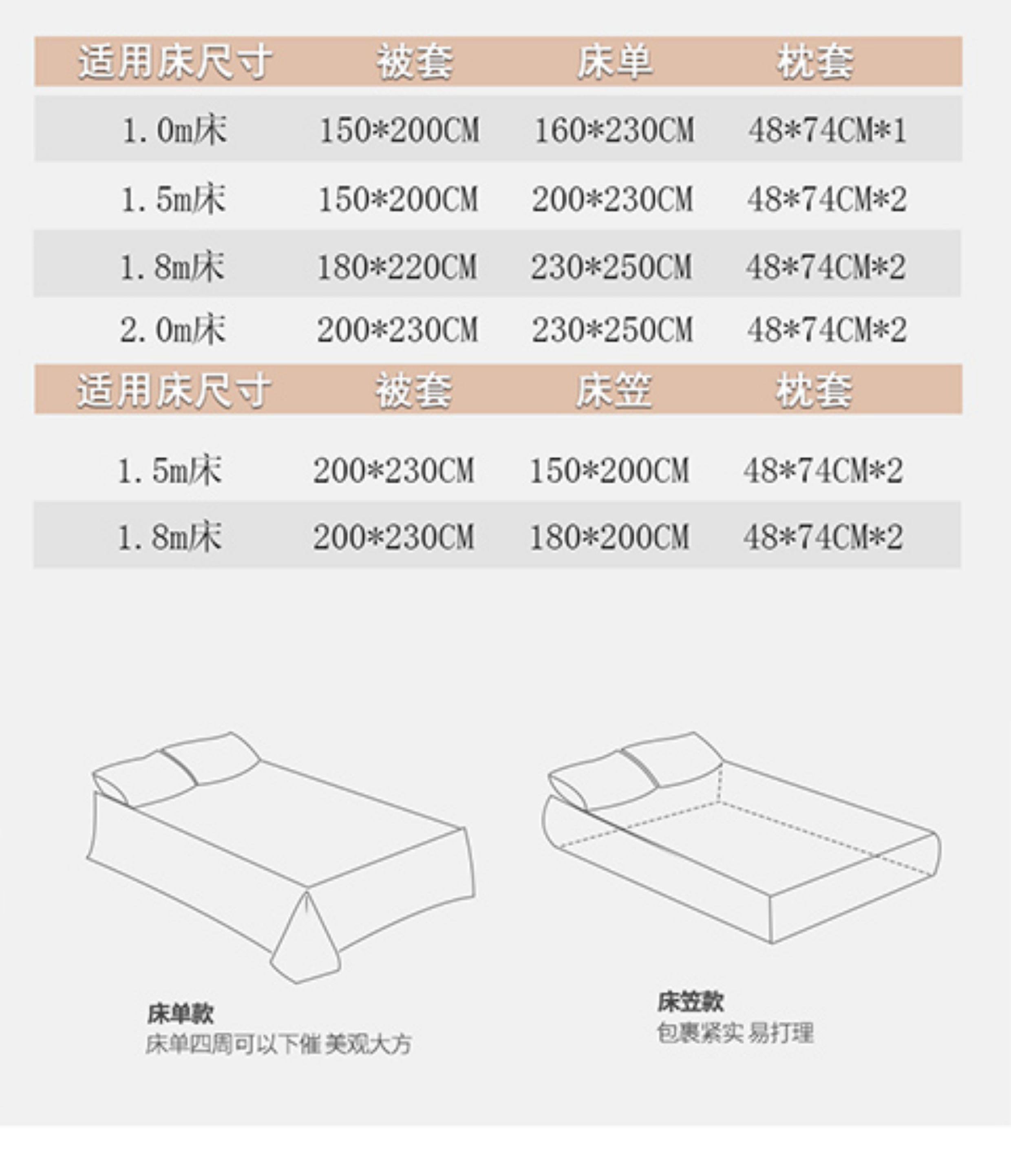 | Size Specifications | 0.9m dormitory bed sheet [quilt cover 150x200cm] three-piece set,1.2m bed sheet [quilt cover 150x200cm] four-piece set,1.5m bed sheet [quilt cover 150x200cm] four-piece set,1.5m bed sheet [quilt cover 180x220cm] four-piece set,1.5m bed sheet [quilt cover 200x230cm] four-piece set,1.8m bed sheet [quilt cover 180x220cm] four-piece set,1.8m bed sheet [quilt cover 200x230cm] four-piece set,2.0m bed sheet [quilt cover 200x230cm] four-piece set,1.5m fitted sheet [quilt cover 180x220cm] four-piece set |