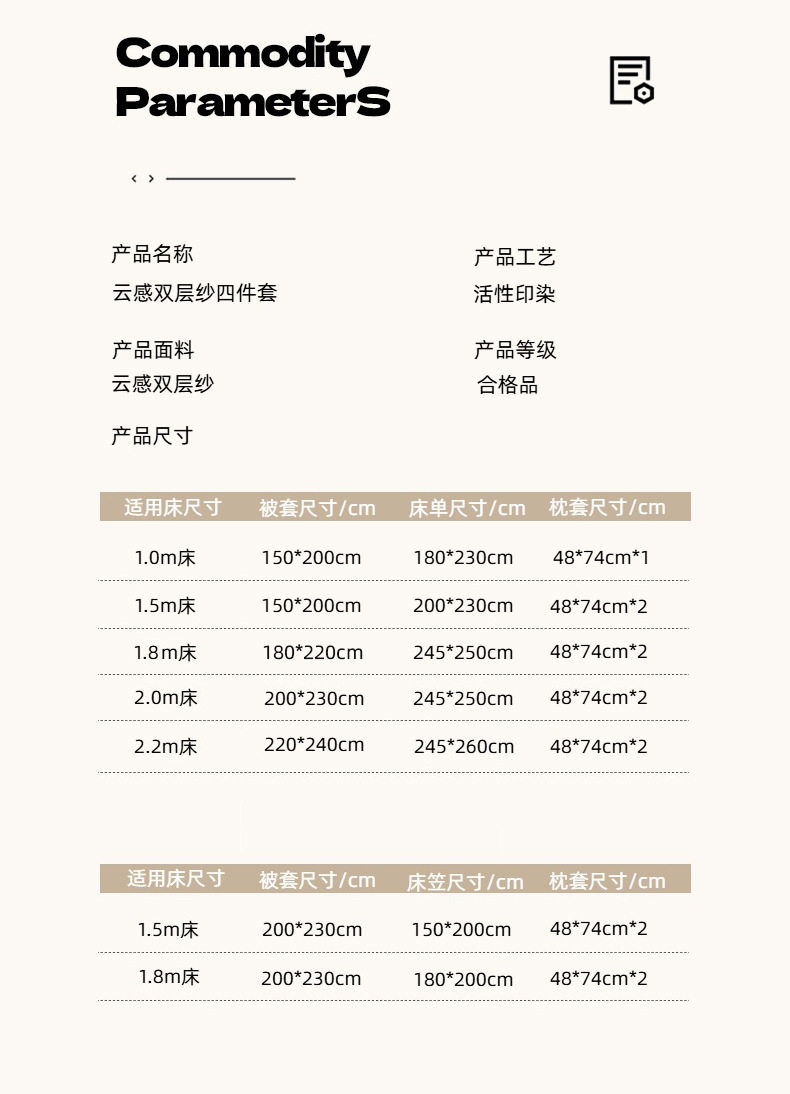 | Dimensions | 0.9-1.2m bed sheets three pieces [quilt cover 1.5*2m],1.5m bed sheet four-piece set [quilt cover 1.5*2m],1.8m bed sheet four-piece set [quilt cover 1.8*2.2m],2.0m bed sheet four-piece set [quilt cover 2*2.3m],2.2m bed sheet four-piece set [quilt cover 2.2*2.4m],1.5m fitted sheet four-piece quilt cover 1.5*2.0,1.8m fitted sheet four-piece quilt cover 1.5*2.0,1.5m fitted sheet four-piece quilt cover 1.8*2.2,1.8m fitted sheet four-piece quilt cover 1.8*2.2,1.5m fitted sheet set of four [quilt cover 2*2.3m],1.8m fitted sheet set of four [quilt cover 2*2.3m],1.8m fitted sheet set of four [quilt cover 2.2*2.4m] |