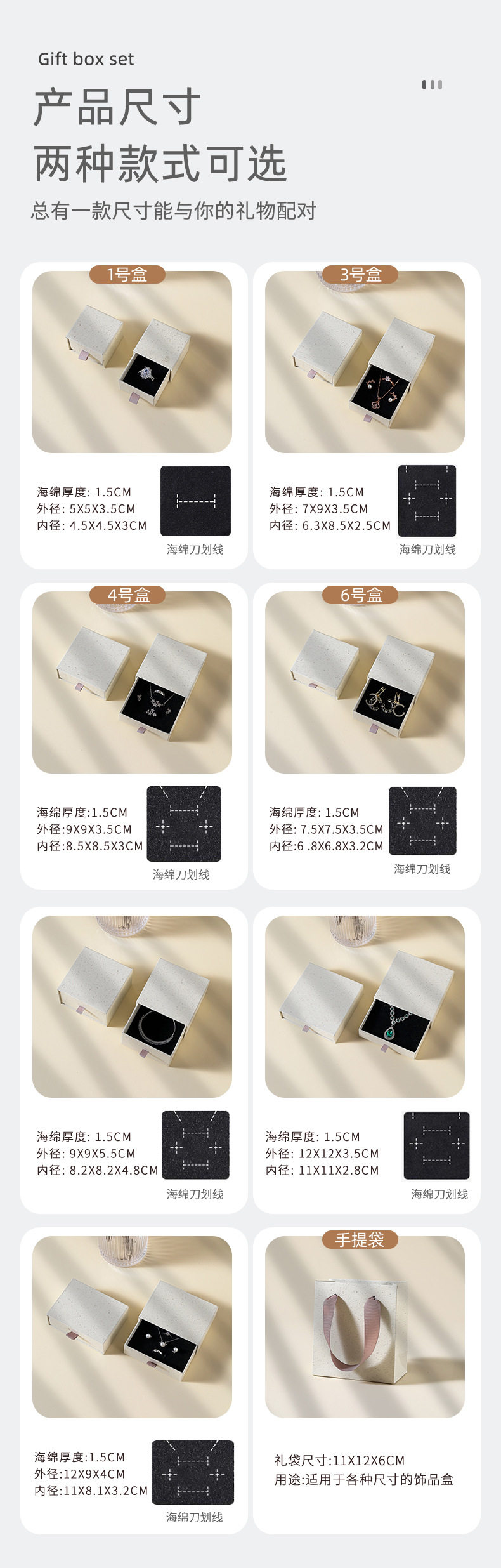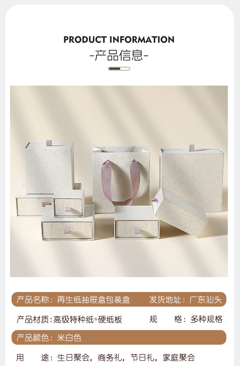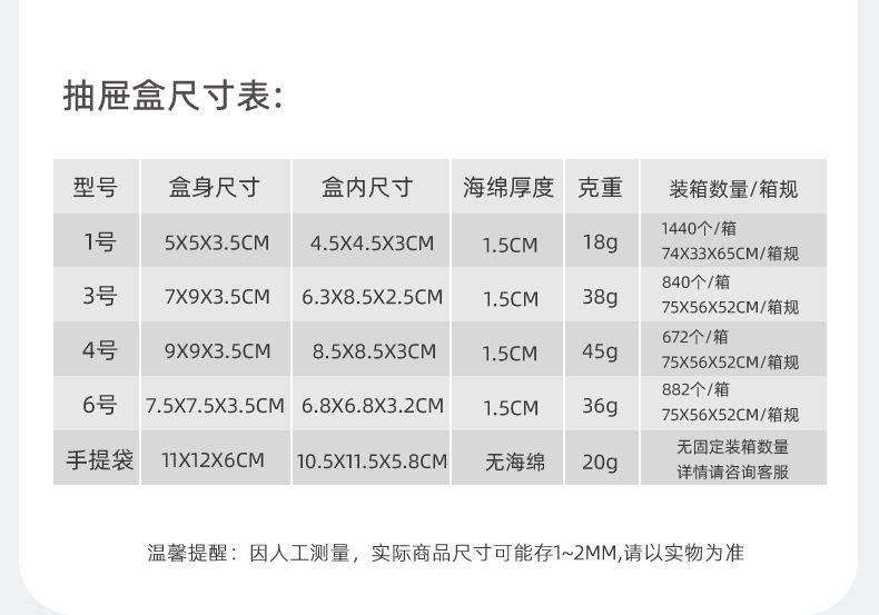 | Specifications and models | Recycled paper drawer box; 5*5*3.5cm (with sponge),Recycled paper drawer box; 7*9*3.5cm (with sponge),Recycled paper drawer box; 9*9*3.5cm (with sponge),Recycled paper drawer box; 7.5*7.5*3.5cm (with sponge),Recycled paper drawer box; 9*9*5.5cm (with sponge),Recycled paper drawer box; 12*9*4cm (with sponge),Recycled paper drawer box; 12*12*3.5cm (with sponge),Recycled paper drawer box; handbag 11*12*6cm,Blue and pink drawer box; 5*5*3.5cm (with sponge),Blue and pink drawer box; 7*9*3.5cm (with sponge),Blue and pink drawer box; 9*9*3.5cm (with sponge),Blue and pink drawer box; 7.5*7.5*3.5cm (with sponge),Blue and pink drawer box; handbag 11*12*6cm,White powder drawer box; 5*5*3.5cm (with sponge),White powder drawer box; 7*9*3.5cm (with sponge),White powder drawer box; 9*9*3.5cm (with sponge),White powder drawer box; 7.5*7.5*3.5cm (with sponge),White powder drawer box; handbag 11*12*6cm,Ash black drawer box; 5*5*3.5cm (with sponge),Ash black drawer box; 7*9*3.5cm (with sponge),Ash black drawer box; 9*9*3.5cm (with sponge),Ash black drawer box; 7.5*7.5*3.5cm (with sponge),Ash black drawer box; handbag 11*12*6cm,White and black drawer box (blank version); 5*5*3.5cm (with sponge),White and black drawer box (blank version); 7*9*3.5cm (with sponge),White and black drawer box (blank version); 9*9*3.5cm (with sponge),White and black drawer box (blank version); 7.5*7.5*3.5cm (with sponge),White and black drawer box (blank version); handbag 11*12*6cm,Bronze drawer box; 5*5*3.5cm (with sponge),Bronze drawer box; 7*9*3.5cm (with sponge),Bronze drawer box; 9*9*3.5cm (with sponge),Bronze drawer box; 7.5*7.5*3.5cm (with sponge),Bronze drawer box; handbag 11*12*6cm,Enamel green drawer box; 5*5*3.5cm (with sponge),Enamel green drawer box; 7*9*3.5cm (with sponge),Enamel green drawer box; 9*9*3.5cm (with sponge),Enamel green drawer box; 7.5*7.5*3.5cm (with sponge),Enamel green drawer box; handbag 11*12*6cm,Blue drawer box; 5*5*3.5cm (with sponge),Blue drawer box; 7*9*3.5cm (with sponge),Blue drawer box; 9*9*3.5cm (with sponge),Blue drawer box; 7.5*7.5*3.5cm (with sponge),Blue drawer box; handbag 12*16*6cm,Brick powder drawer box; 5*5*3.5cm (with sponge),Brick powder drawer box; 7*9*3.5cm (with sponge),Brick powder drawer box; 9*9*3.5cm (with sponge),Brick powder drawer box; 7.5*7.5*3.5cm (with sponge),Brick powder drawer box; handbag 12*16*6cm,Recycled paper drawer suspension box; 7*7*2cm,Recycled paper drawer suspension box; 9*9*2cm,Recycled paper drawer suspension box; 11*11*2cm,Recycled paper drawer suspension box; handbag 11*12*6cm,Recycled paper drawer suspension box; handbag 12*16*6cm |