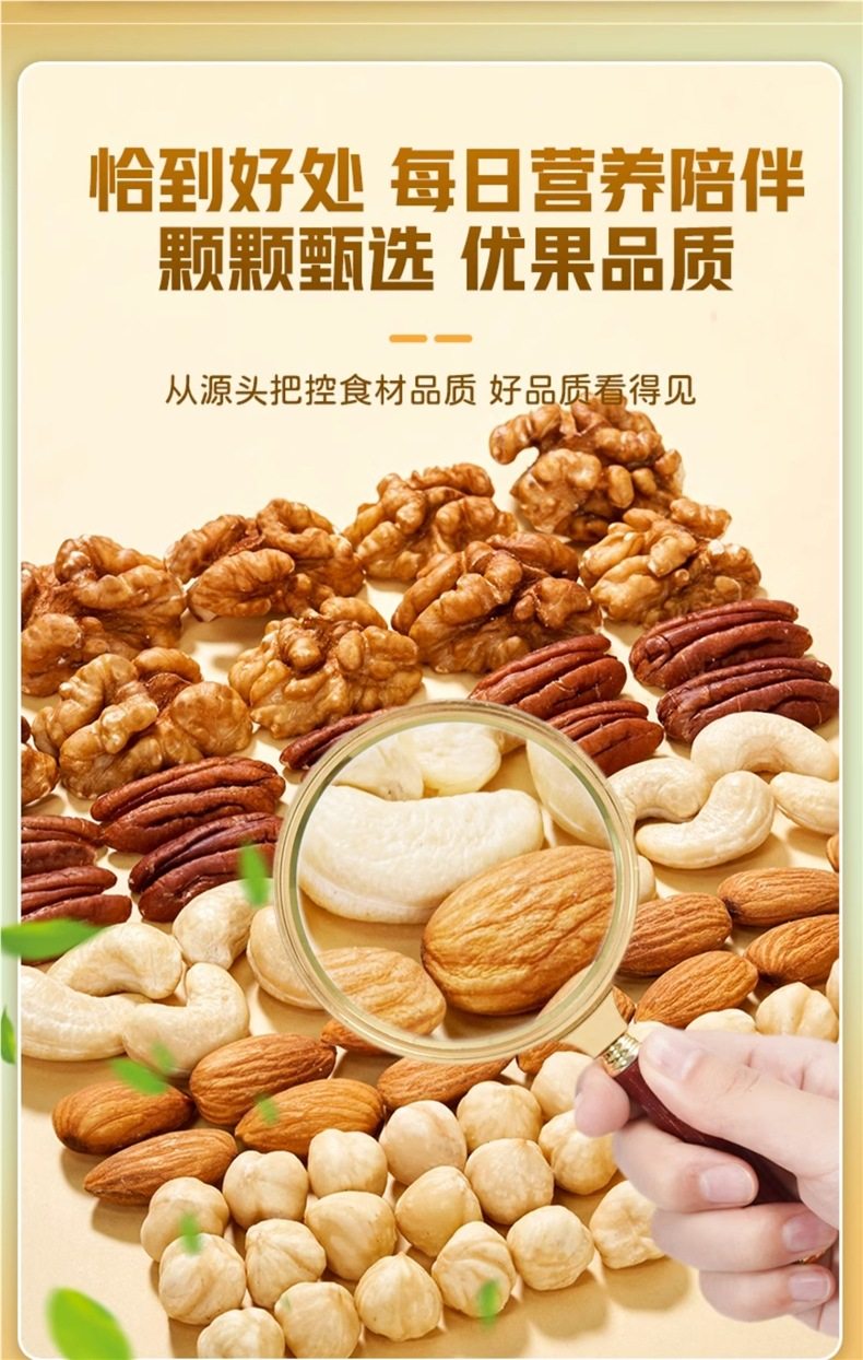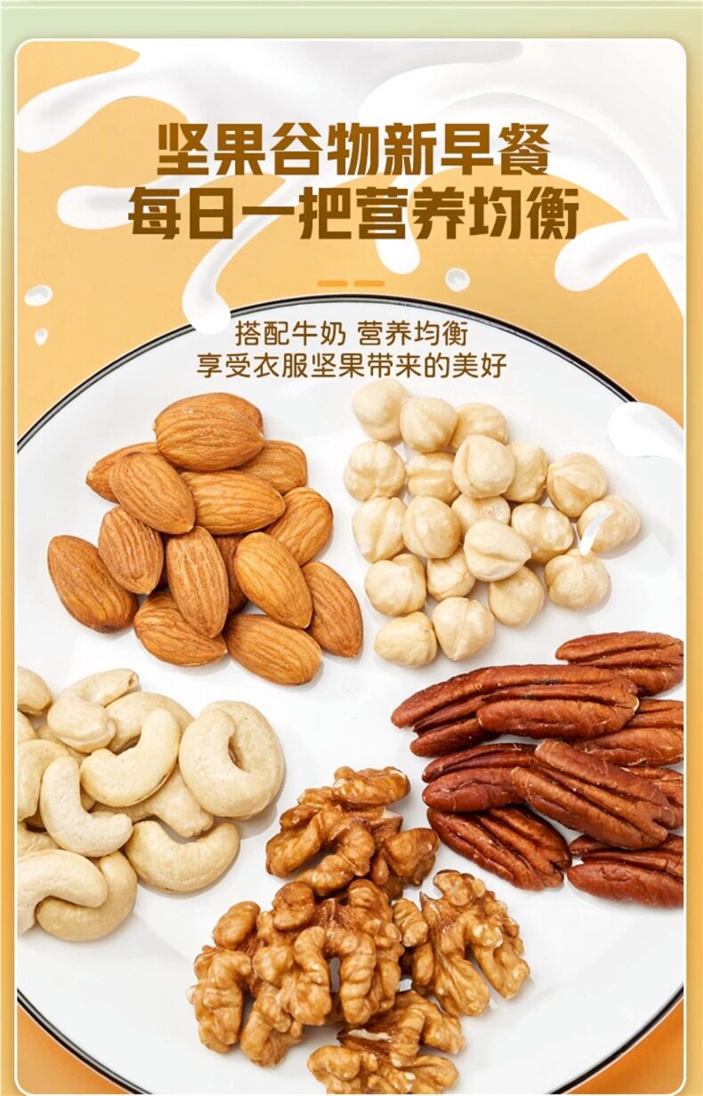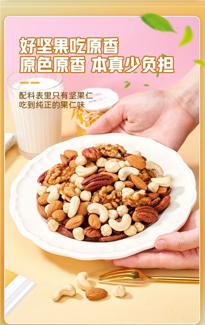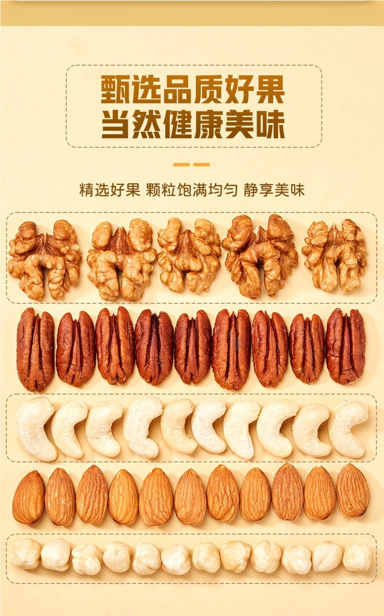 | Packaging specifications | Type d 500g*1 can: [walnut kernels + almond kernels + white cashew kernels + hazelnut kernels + pecans,Type c 500g*1 can: [walnut kernel + almond kernel + white cashew kernel + hazelnut kernel + happy,Type e 500g*1 can: [almond kernels + white cashew kernels + hazelnut kernels + pecan kernels],Pure nut kernel combination package: [raw white cashew kernels + original almond kernels] 250g each |