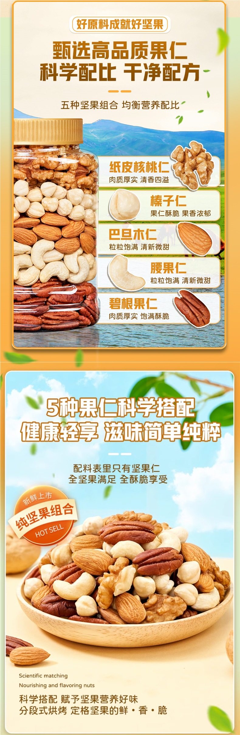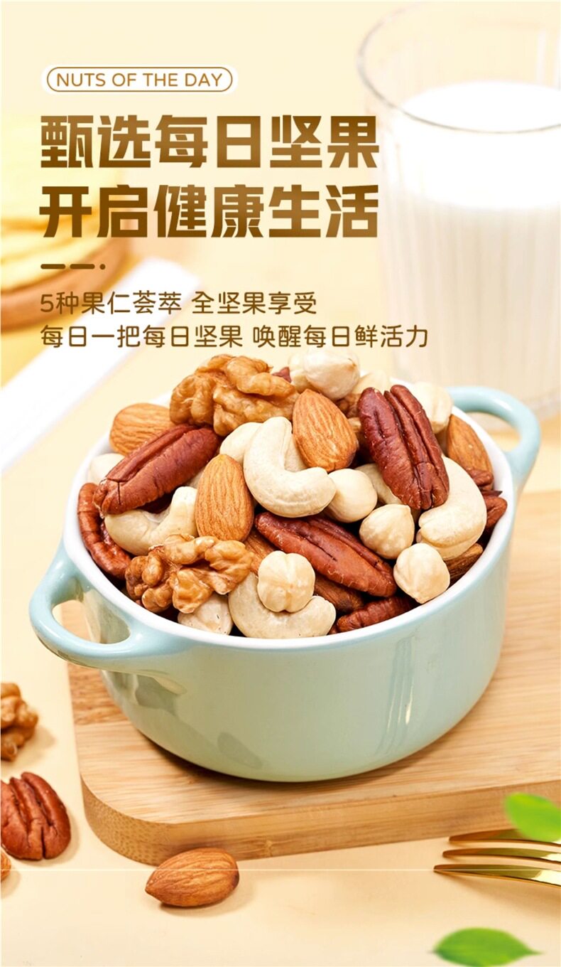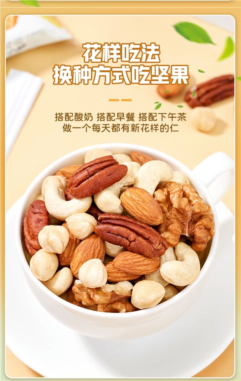 | Packaging specifications | Type d 500g*1 can: [walnut kernels + almond kernels + white cashew kernels + hazelnut kernels + pecans,Type c 500g*1 can: [walnut kernel + almond kernel + white cashew kernel + hazelnut kernel + happy,Type e 500g*1 can: [almond kernels + white cashew kernels + hazelnut kernels + pecan kernels],Pure nut kernel combination package: [raw white cashew kernels + original almond kernels] 250g each |