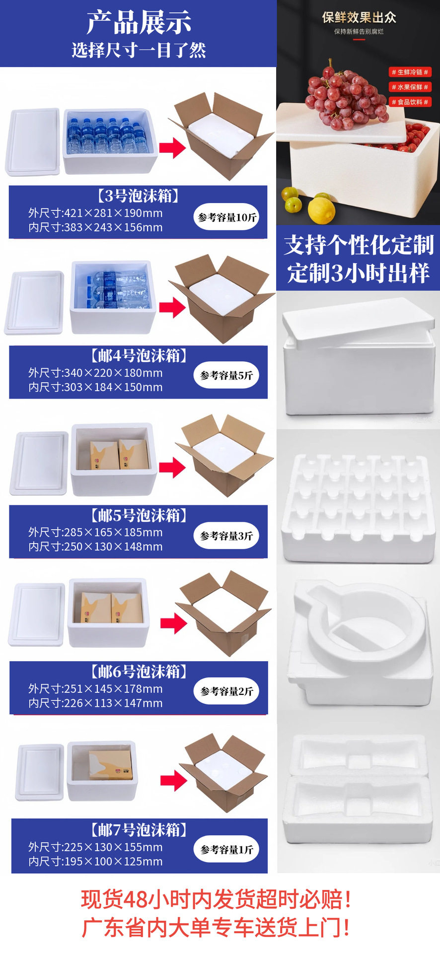 | Specifications and models | Cherry box (photographed as 18 pieces/pack),1.5kg pack of cherry foam boxes (sold in multiples of 36),2.5kg pack of cherry foam boxes (sold in multiples of 24),Postal no. 4 (340*225*185) mm (27 pieces per pack),Postal no. 4 + three-layer carton (27 pieces per package),Postal no. 5 (285*165*185) is priced at 64 pieces/package,Postal no. 5 + three-layer carton ((64 pcs per pack)),Postal size 5 (292*193*210mm (36/pack),Postal no. 6 (255*150*183) is priced at 72 pieces/package,Postal no. 6 + three-layer carton (72 pcs per pack),Gift box (375*255*215)mm (15 pieces/pack),Medium gift box (300*233*185) (photographed as 10 pieces/package),Medium box (510*360*230) mm, 10 pieces per pack,1 size larger (410*294*230) (18 pcs/pack),Ab box (600*450*330)mm (6 pieces per pack),No. 2 foam box (465*330*240) mm (1 pack of 12 pieces),No. 3 foam box + three-layer carton (24 pieces per pack),No. 3 foam box (24 pcs/pack),No. 4 foam box (313*235*200) mm (28 pieces per pack),No. 4 foam box + three-layer carton (28 pieces per pack),No. 5 foam box (260*192*160) mm (according to 1 pack of 54 pieces),No. 5 foam box + three-layer carton (1 pack of 54 pieces),No. 6 foam box (72 pieces/pack),No. 6 foam box + three-layer carton (1 pack of 72 pieces),No. 7 foam box (188*140*115)mm,No. 7 foam box + three-layer carton (photographed in multiples of 12),No. 8 foam box (160*110*97),Positive b (458*365*255) (12 pcs/package),Positive b foam box + five-layer carton (1 pack of 12 pieces),Large square foam box (540*540*362) (1 pack of 4 pieces),Large square foam box + five-layer carton (1 pack of 4 pieces),Long b foam box (515*310*210)mm (according to 1 pack of 12 pieces),Long b foam box + three-layer carton (1 pack of 12 pieces),A foam box (530*375*265)mm (12 pieces per pack),A foam box + five-layer carton (1 pack of 12 pieces),A+ foam box (590*443*310)mm (1 pack of 6 pieces),A+foam box+five-layer carton (1 pack of 6 pieces),Jingbu no. 1 (590*440*345) (1 pack of 6 pieces),Jingbu no. 2 (537*435*220) (1 pack of 12 pieces),Jingbu no. 3 (535*403*340)mm (1 pack of 6 pieces),Bbb(462*348*200)mm(1 pack of 12 pieces),Special shot of samples,Vegetable box (495*347*260)mm (1 pack of 12 pieces),Positive no. 1 (365*295*238) (1 pack of 18 pieces),Positive no. 3 (425*306*195)mm (1 pack of 18 pieces),Positive no. 3 + carton (1 pack of 18 pieces,Red no. 4 (300*230*200)mm,Red no. 3 (335*220*175)mm,Red no. 6 (255*145*175)mm (1 pack of 60 pieces),20 boxes (533*400*250)mm (1 pack of 12 pieces),24 boxes (595*440*245)mm (1 pack of 6 pieces),32 boxes (588*440*315)mm (1 pack of 6 pieces),45 boxes (575*540*350)mm (take 4 pieces per pack),Shanshui foam box 335*245*180mm, 36 pieces/pack,Hua jia foam box (520*370*320)mm,Postal service 7 (225*130*155) (1 pack of 72 pieces),Postal 8 (208*108*135) (120 pieces/pack),No. 2 foam box + five-layer carton (465*330*240) mm (1 pack of 12 pieces),Postal large 5 foam box + carton,Large 1 size + carton (according to 18 pieces/pack),J8 foam box (34*28*31) 12 pieces/pack,Jb30 foam box 30*30*11 (40 pieces/pack),75 boxes of foam boxes 740*553*365mm, 4 pcs/pack,75 boxes of foam boxes + cartons (4 pcs/pack) |
