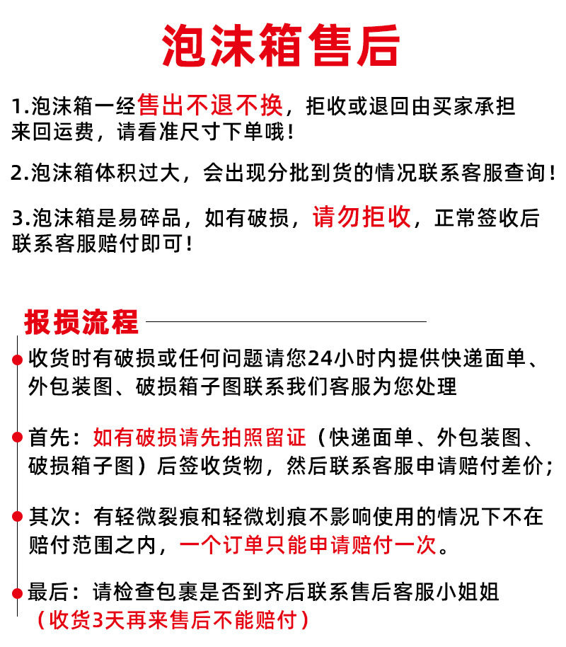 | Specification | Red no. 4 (300*230*200)mm,No. 7 foam box (188*140*115)mm,Red no. 3 (335*220*175)mm,No. 8 foam box (160*110*97),No. 7 foam box + three-layer carton (photographed in multiples of 12),Hua jia foam box (520*370*320)mm,No. 4 foam box (313*235*200) mm (28 pieces per pack),No. 4 foam box + three-layer carton (28 pieces per pack),A foam box (530*375*265)mm (12 pieces per pack),Positive no. 1 (365*295*238) (1 pack of 18 pieces),No. 5 foam box + three-layer carton (1 pack of 54 pieces),Long b foam box (515*310*210)mm (according to 1 pack of 12 pieces),20 boxes (533*400*250)mm (1 pack of 12 pieces),Postal no. 4 + three-layer carton (27 pieces per package),No. 5 foam box (260*192*160) mm (according to 1 pack of 54 pieces),A+foam box+five-layer carton (1 pack of 6 pieces),A foam box + five-layer carton (1 pack of 12 pieces),Bbb(462*348*200)mm(1 pack of 12 pieces),Postal no. 4 (340*225*185) mm (27 pieces per pack),No. 2 foam box (465*330*240) mm (1 pack of 12 pieces),Positive no. 3 (425*306*195)mm (1 pack of 18 pieces),Vegetable box (495*347*260)mm (1 pack of 12 pieces),A+ foam box (590*443*310)mm (1 pack of 6 pieces),Jingbu no. 1 (590*440*345) (1 pack of 6 pieces),Jingbu no. 2 (537*435*220) (1 pack of 12 pieces),Long b foam box + three-layer carton (1 pack of 12 pieces),Large square foam box (540*540*362) (1 pack of 4 pieces),Large square foam box + five-layer carton (1 pack of 4 pieces),Positive b foam box + five-layer carton (1 pack of 12 pieces),24 boxes (595*440*245)mm (1 pack of 6 pieces),Jingbu no. 3 (535*403*340)mm (1 pack of 6 pieces),Red no. 6 (255*145*175)mm (1 pack of 60 pieces),32 boxes (588*440*315)mm (1 pack of 6 pieces),45 boxes (575*540*350)mm (take 4 pieces per pack),Postal service 7 (225*130*155) (1 pack of 72 pieces),No. 2 foam box + five-layer carton (465*330*240) mm (1 pack of 12 pieces),Ab box (600*450*330)mm (6 pieces per pack),Postal large 5 foam box + carton,No. 3 foam box + three-layer carton (24 pieces per pack),No. 3 foam box (24 pcs/pack),Gift box (375*255*215)mm (15 pieces/pack),Postal size 5 (292*193*210mm (36/pack),Postal no. 5 + three-layer carton ((64 pcs per pack)),Postal no. 6 + three-layer carton (72 pcs per pack),No. 6 foam box + three-layer carton (1 pack of 72 pieces),Postal 8 (208*108*135) (120 pieces/pack),Postal no. 6 (255*150*183) is priced at 72 pieces/package,Postal no. 5 (285*165*185) is priced at 64 pieces/package,No. 6 foam box (72 pieces/pack),Positive b (458*365*255) (12 pcs/package),Positive no. 3 + carton (1 pack of 18 pieces,Medium gift box (300*233*185) (photographed as 10 pieces/package),Cherry box (photographed as 18 pieces/pack),J8 foam box (34*28*31) 12 pieces/pack,Shanshui foam box 335*245*180mm, 36 pieces/pack,75 boxes of foam boxes + cartons (4 pcs/pack),75 boxes of foam boxes 740*553*365mm, 4 pcs/pack,Jb30 foam box 30*30*11 (40 pieces/pack),1 size larger (410*294*230) (18 pcs/pack),Large 1 size + carton (according to 18 pieces/pack),Medium box (510*360*230) mm, 10 pieces per pack,1.5kg pack of cherry foam boxes (sold in multiples of 36),2.5kg pack of cherry foam boxes (sold in multiples of 24) |