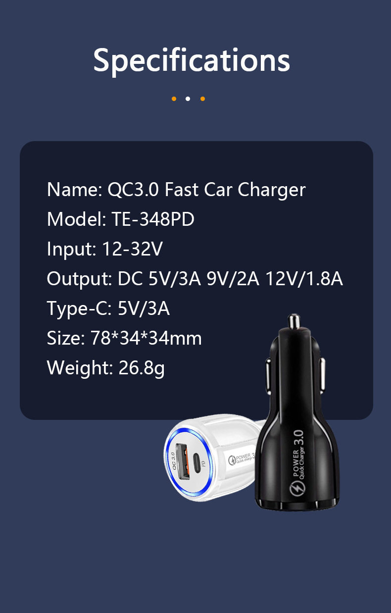 | Model | Te-348pd black car charger bare metal,Te-348pd white car charger bare metal,Te-348pd black car charger with packaging,Te-348pd white car charger with packaging |